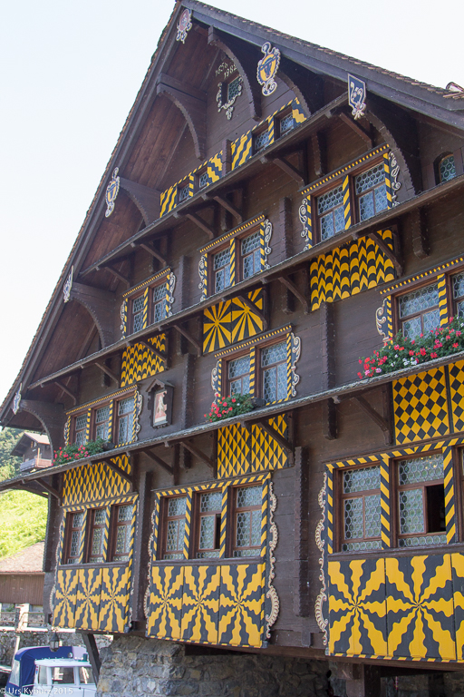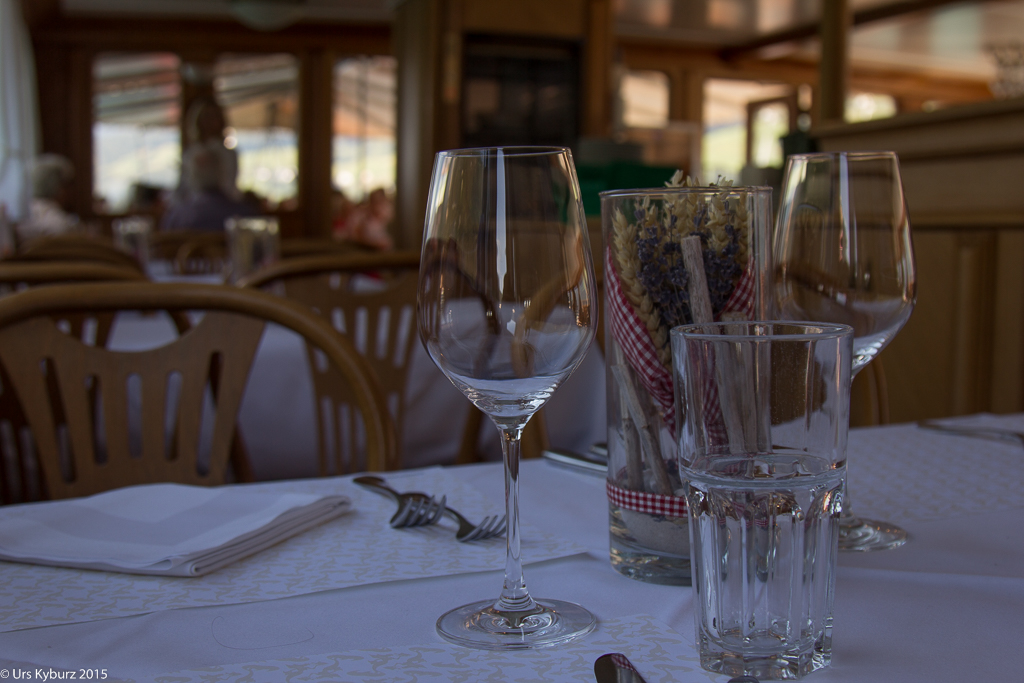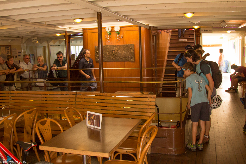 Nun sind wir wieder auf der Original-Goldiroute, und wir erhaschen nun einen Blick auf den Urnersee, das Rütli – die Wiege der Schweiz – und die Urner Alpen. Ach, ist das fantastisch! Bis Treib fahren wir nun auf der Asphaltstrasse, die wider Erwarten nicht autofrei ist. Immerhin hat es nicht viel Verkehr. So erreichen wir schon bald Treib, wo wir auf das Schiff warten. Das Restaurant „zur Treib“ ist ein uraltes, wunderschönes Haus. Wir haben schön Zeit, uns etwas auszuruhen und umzusehen. Dann kommt das Schiff: Der Schaufelraddampfer „Stadt Luzern“, ein herrliches Schiff mit Baujahr 1928. Gemütlich lassen wir uns zurückschiffen via Gersau nach Beckenried. Interessant ist, dass man die mächtigen Kolben arbeiten sieht, sehr eindrücklich. Eine Fahrt mit dem Dampfer lohnt sich auf jeden Fall mal.