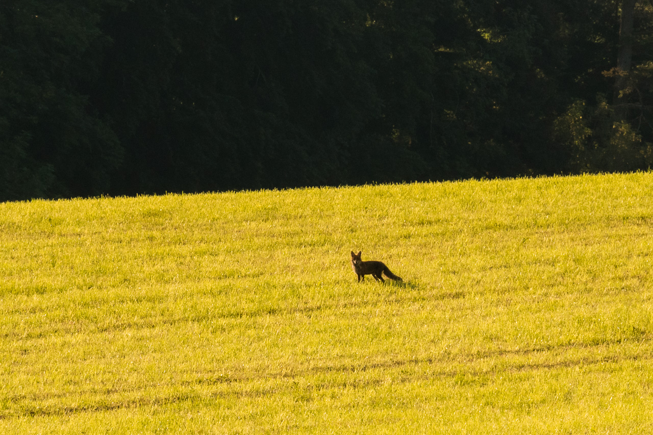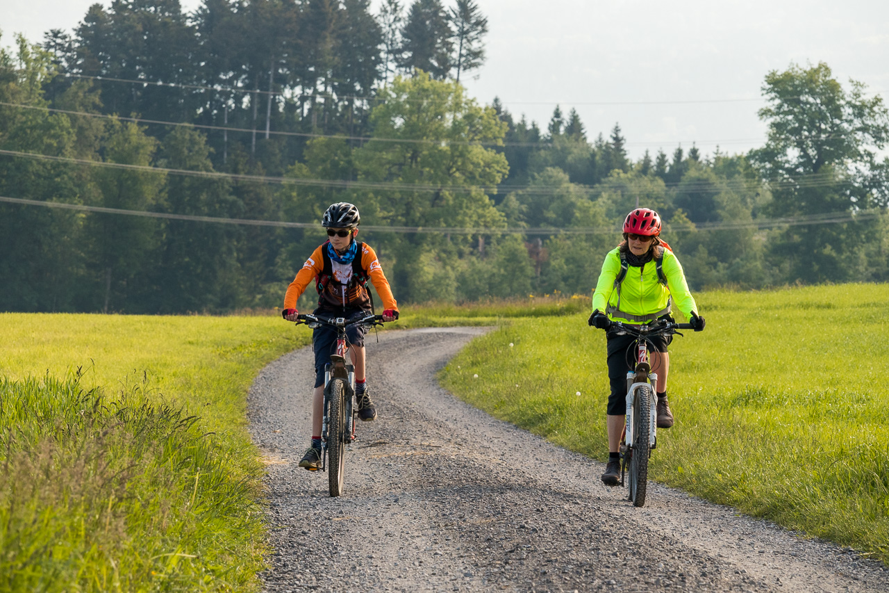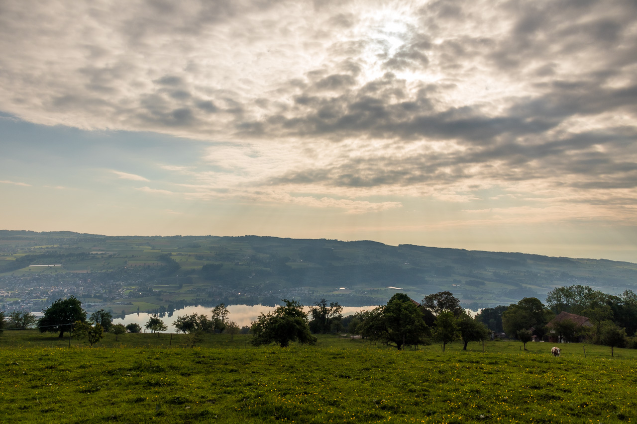 Wir starten kurz nach sieben Uhr, denn Morgenstund‘ hat bekanntlich Gold im Mund. Golden schien jedenfalls die Sonne, ein Fuchs auf der Wiese geniesst diese ebenso. Über Schwarzenbach fahren wir zum Herrlisbergpass und erblicken den Baldeggersee. Wolken ziehen auf von den Bergen her, aber es soll ja sonnig werden heute. Silvan kommt auch angerollt mit der Mutter: „Ich habe so wenig Luft vorne.“ Toll, ein Platten hat gerade noch gefehlt. Da der Reifen nicht komplett platt ist, versuche ich es erst mal mit pumpen. Es hält bis am Schluss, er hatte am Vortag noch gepumpt und vermutlich das Ventil nicht richtig zugedreht.