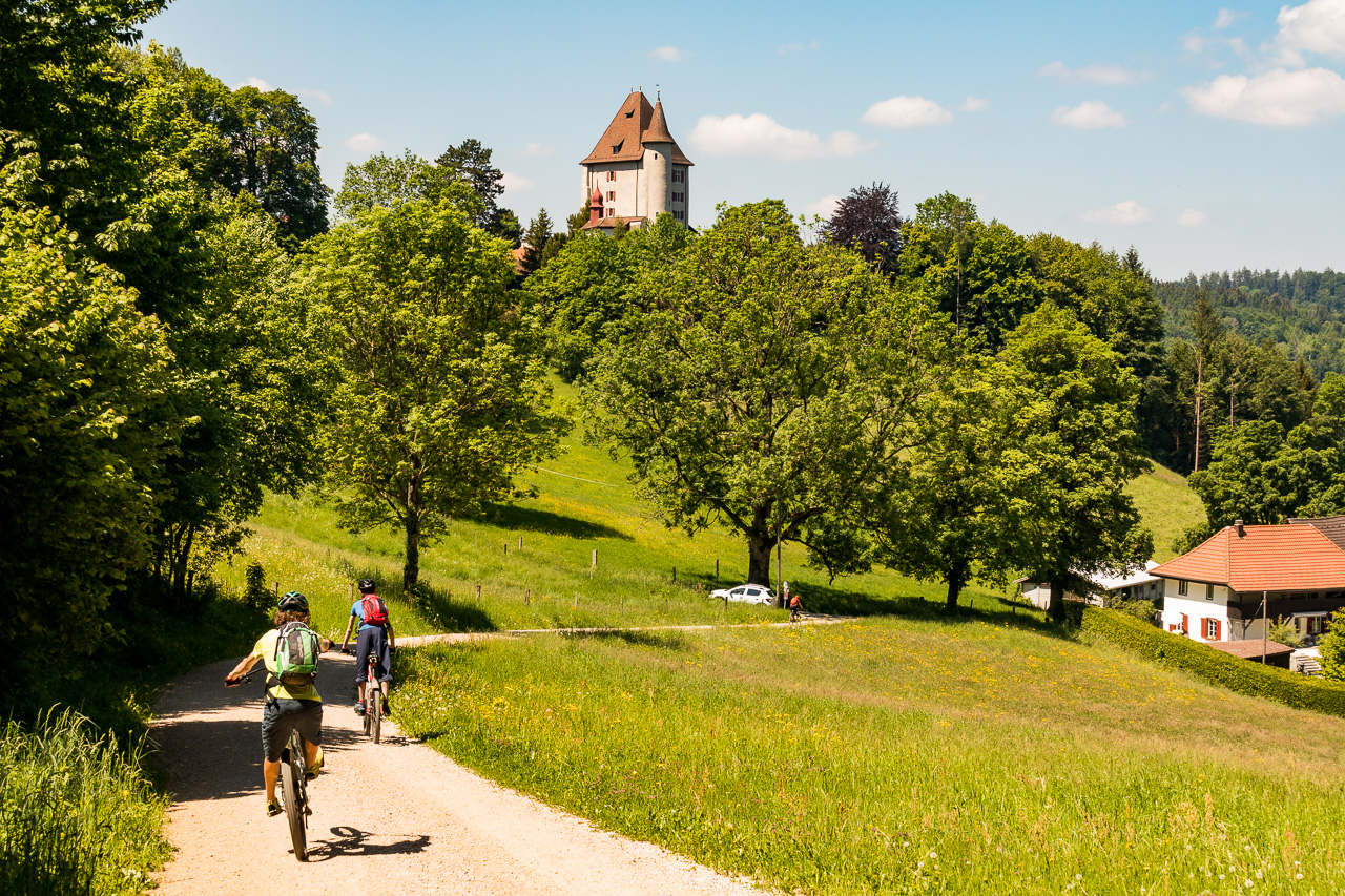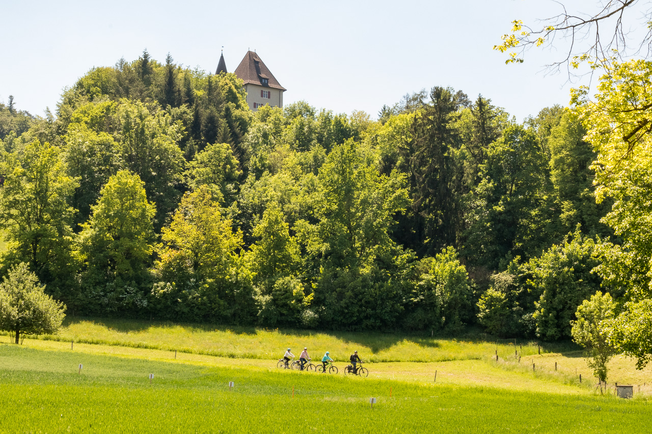 Eine kurze Steigung noch trennt uns von der Abfahrt nach Seengen, von dort fahren wir zum Schloss Hallwyl. Man merkt, dass die Lockdown-Zeit vorbei ist, der Parkplatz ist wieder gerammelt voll, die Leute spazieren überall und pfeifen auf den Abstand. Wir fahren auf der Route 599 dem Aabach entlang abwärts nach Seon und wechseln dort in die andere Richtung der Tour, denn die Herzschlaufe würde noch über Lenzburg kehren. Die Mittagssonne brennt vom Himmel und uns steht nochmals ein langer und zum Teil steiler Anstieg bevor. Auch den nehmen wir, nach dem steilsten Stück im Wald verschnaufen wir erst mal. Silvan ist schon ziemlich erschöpft. „Als ich die Route gefahren bin, musste ich noch zwei Täler queren!“ dozierte ich. „Selber Schuld!“ tönt es im Chor zurück. Nun denn. Dass wir den höchsten Punkt noch nicht erreicht haben, wusste ich auch nicht mehr. Aber es ist nicht mehr steil, und irgendwann führt der Weg dann doch abwärts, vorbei am Schloss Liebegg. Beim dortigen Landwirtschaftlichen Zentrum legen wir nochmals eine Pause ein.