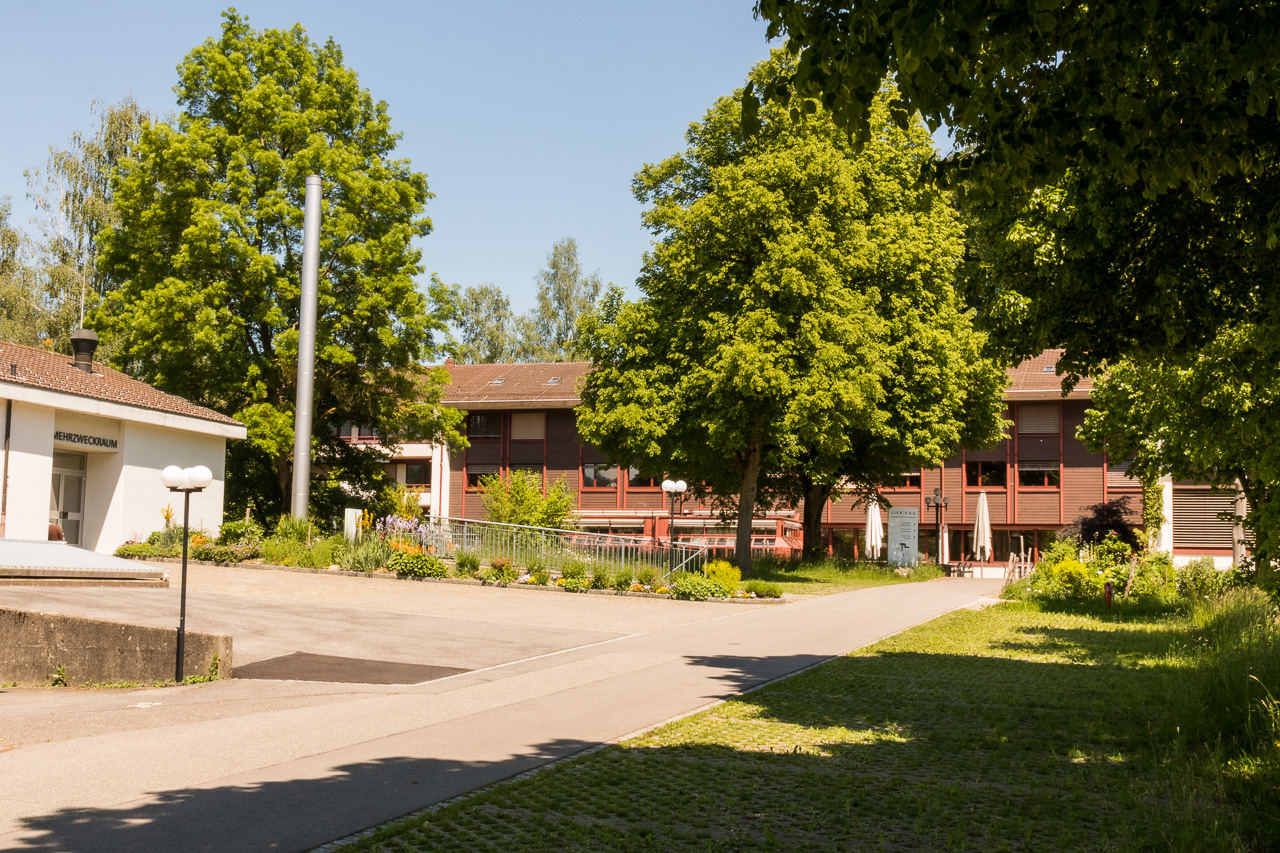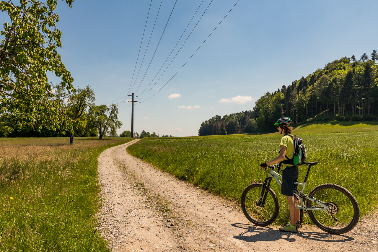 Wir fahren hinunter nach Römerswil, folgen von dort dem Wanderweg ins Tal. Nun, es gibt bestimmt optimalere Varianten, der Weg wird immer steiler, immer schmaler, ist mit einer Treppe versehen und wird unten durch einen Weidezaun unterbrochen. Dann lieber mal schieben. Danach geht es wieder flott voran, durch den Wald fahren wir hinunter, erreichen den Talboden bei Huwil. In Baldegg sind die Störche sportlich, einer stakst auf dem Sportplatz umher.