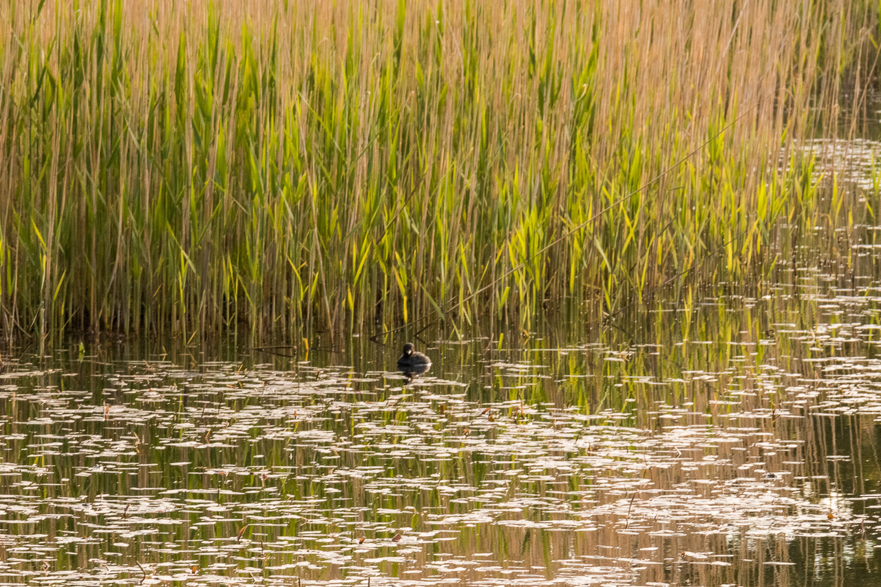 Wir fahren durch den Erlosenwald, kein Mensch ist unterwegs, ausser ein paar Jäger (natürlich jeder in seinem Auto und mitten im Wald). Beim Vogelmoos halten wir kurz, inzwischen sind wir ja fast Stammgast da. Die Blässhühner führen ihre Jungen aus, die Zwergtaucher wirbeln umher.