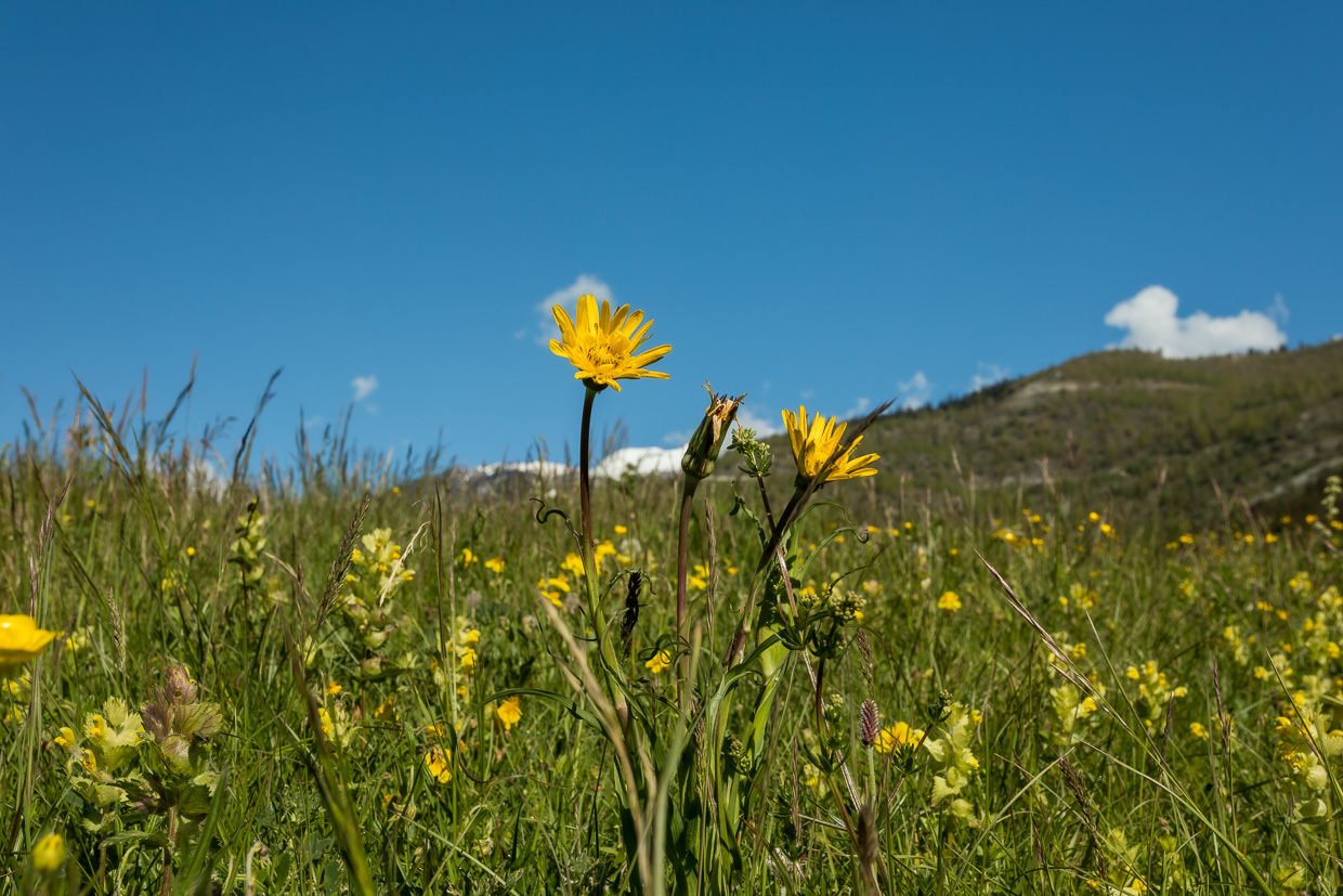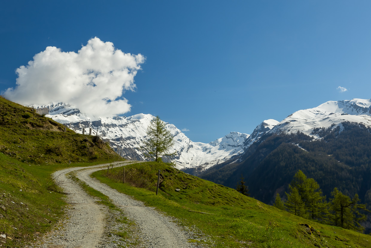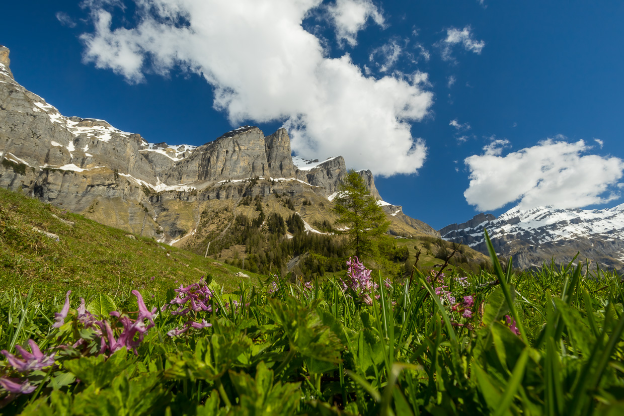 Von der Unterkunft oberhalb Inden starteten wir am dritten Tag, früh am Morgen, zu einer Runde über die Alp Larschi. Das Highlight waren die Alpenkrähen und die Bartgeier. Wir brauchten für die relativ kurze Runde so lang, dass wir um die Mittagszeit beim Restaurant Bodmenstübli eintrafen. Da ich mit dem 24-105 mm-Zoom unterwegs war, gibt es halt jetzt Berg- und Blumen- statt Vogelbilder. Ich hoffe, sie gefallen auch.