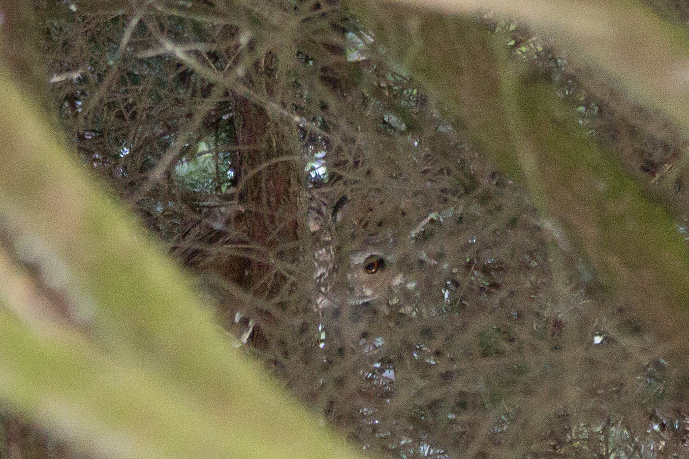 Zu Hause schaut uns dann Junior 2 etwas traurig an, als wir ihm von der Eule erzählen. So beschliesse ich, am Nachmittag mit ihm nochmals in den Wald zu gehen. Tatsächlich, sie sitzt immer noch im selben Baum, aber etwas weiter oben. Dafür sind wir diesmal technologisch vorbereitet, ich habe das Teleobjektiv auf die Kamera geschraubt, Junior hat den Feldstecher mit, so dass wir die Eule gut beobachten und weniger gut fotografieren können.