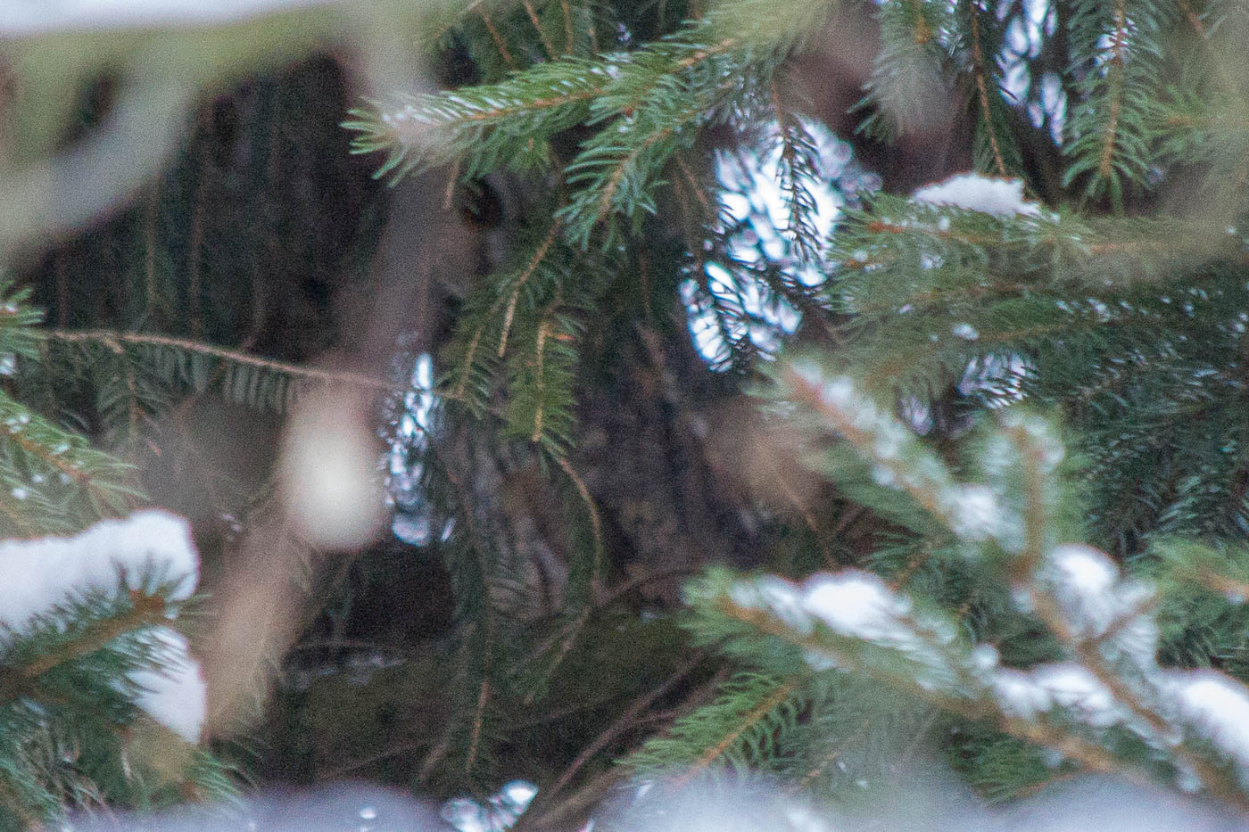 Wie wir so spazieren, hören wir plötzlich ein Gezeter von Kleibern und Meisen in einer Fichte. Aufgeregt fliegen sie umher, irgendwas ist da. „Da muss etwas sein, das ihnen gar nicht passt, ein Greifvogel, ein Fuchs oder so was“, sage ich zu meiner Frau. Die Neugierde treibt mich natürlich, ich steige hoch zur Fichte. Am Boden sehe ich keine Spuren, schaue den Baum hoch. Da ist eine Kotspur in den Ästen, die muss von einem grösseren Vogel sein. Ich schaue weiter hoch, und da sehe ich sie: Eine Waldohreule! Sie mustert mich, lässt mich nicht aus den Augen, bleibt aber sitzen. Ich winke die Frau herbei, gebannt und freudig bestaunen wir den Nachtvogel.