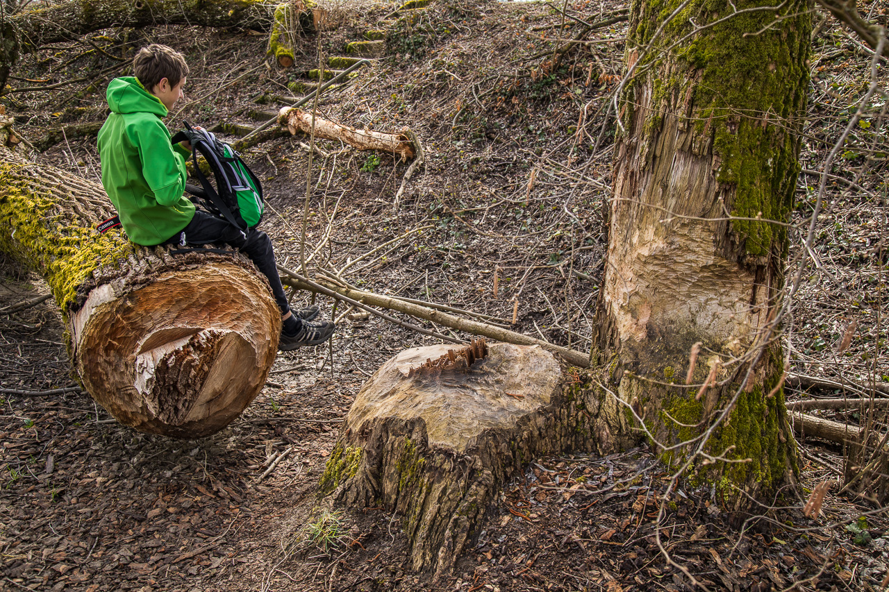 Tafeln klären uns über den Auenschutzpark auf, zeigen, was Auen sind und warum es sie braucht. Mehr Informationen gibt es auf der Seite des Kantons. Über dem Wasser jagen die ersten Rauch- und Mehlschwalben Insekten, ein Schwarzmilanpaar verteidigt seinen Horst gegen die aufdringlichen Krähen. Auch Schmetterlinge sind bereits wieder aktiv, Tagpfauenaugen und Zitronenfalter gaukeln umher und suchen Blumen. An der Aare machen wir eine Pause – auf einem Baumstamm, gefällt vom Biber. Er hat ganze Arbeit geleistet, ein kleinerer Baum liegt quer über den Weg.