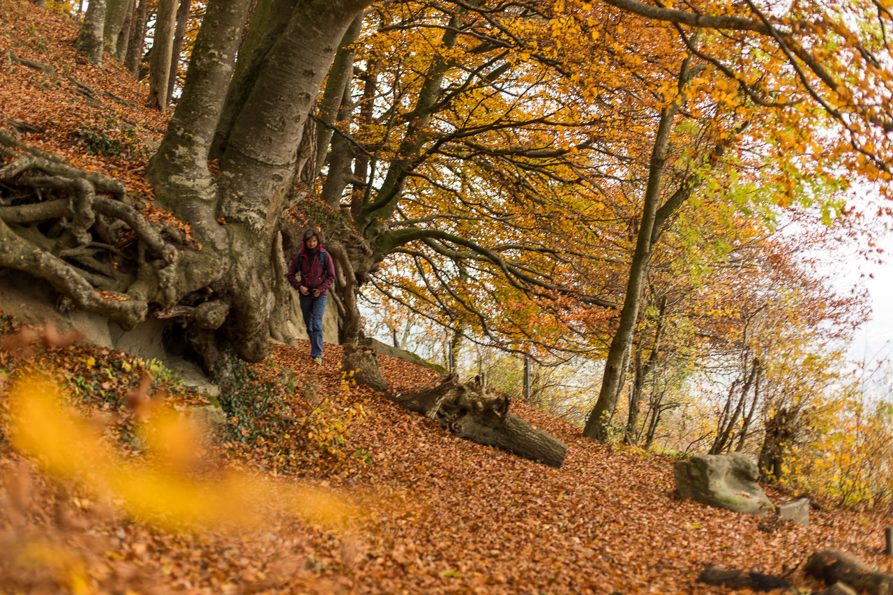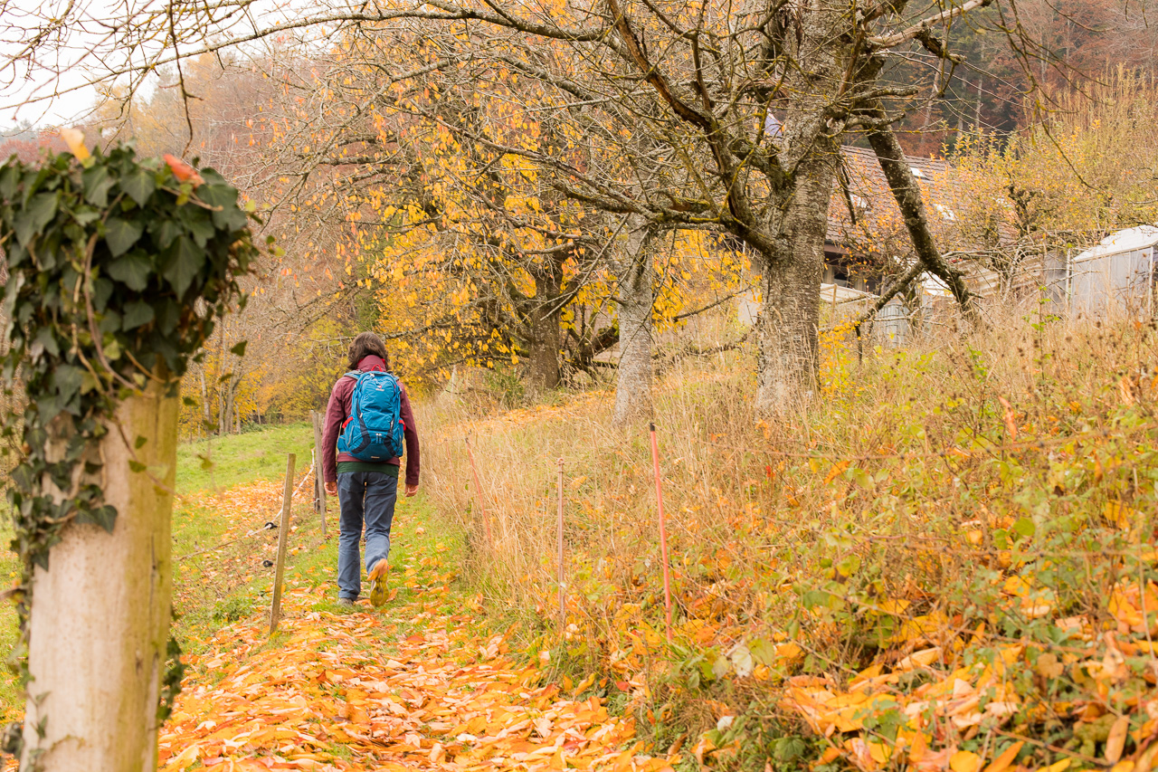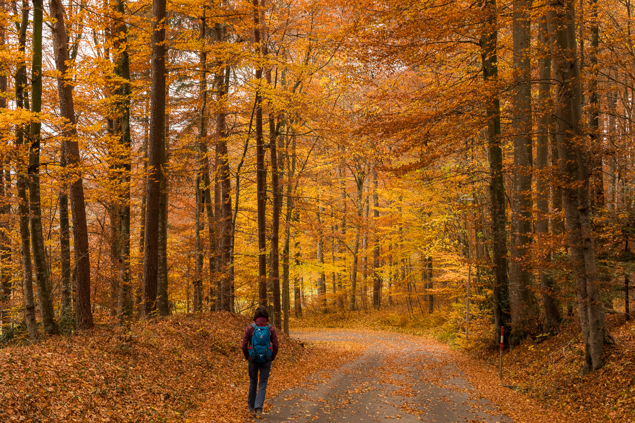 Nun müssen wir ein paar Meter abwärts auf der Strasse, bis der Weg wieder abzweigt in den Wald. Was für eine Pracht! Ich liebe den Wald zu dieser Jahreszeit. Aus totem Holz spriessen Pilze, neues Leben entsteht aus vergangenem. Ich bewundere den Kreislauf der Natur, die keinen Abfall kennt. Alles wird wiederverwertet, nichts verschwendet. Obwohl, manchmal hat man das Gefühl, diese Farbenpracht sei richtig verschwenderisch.