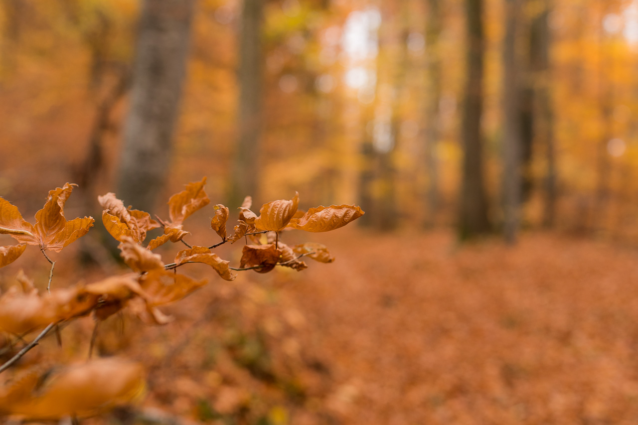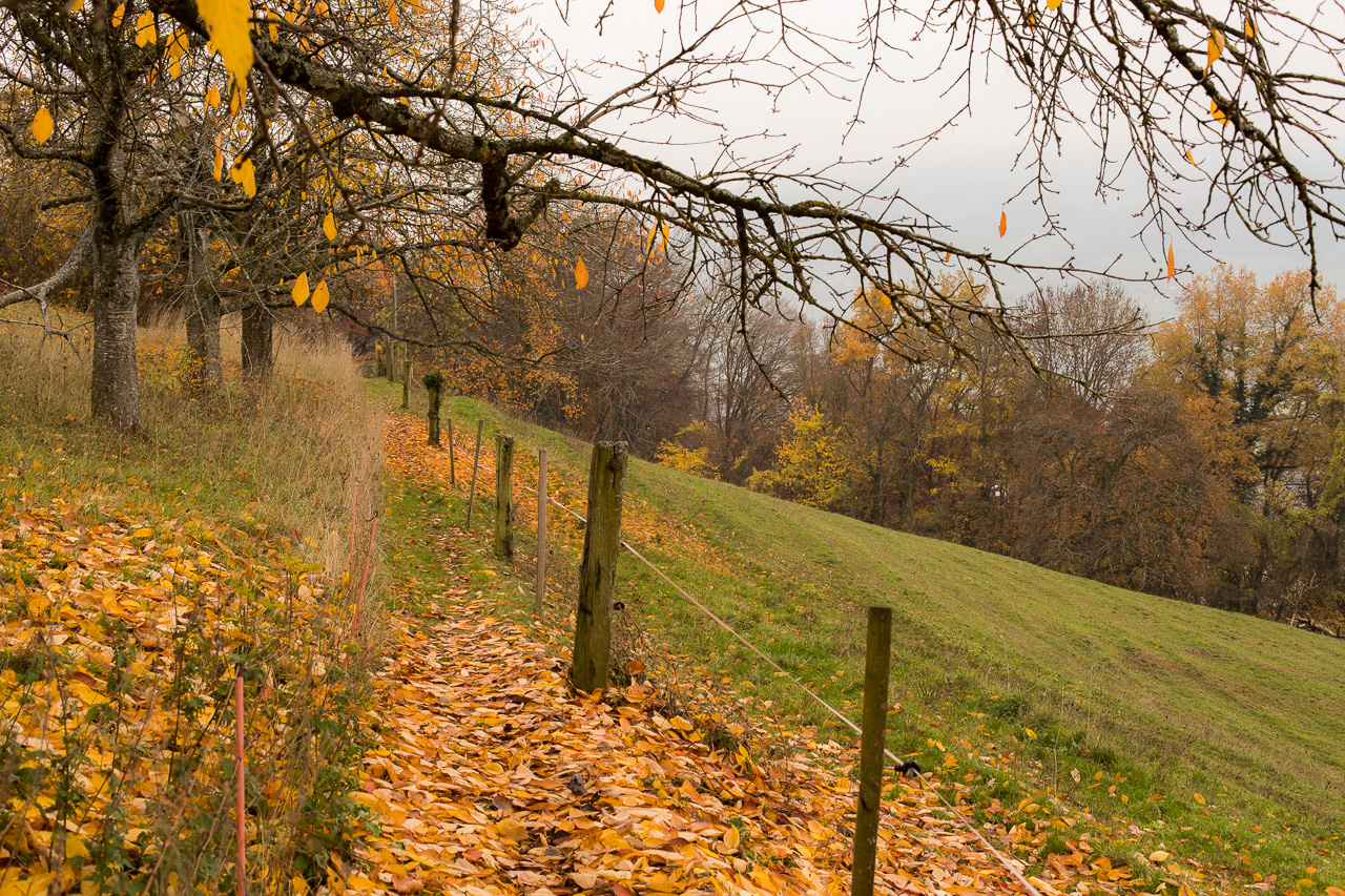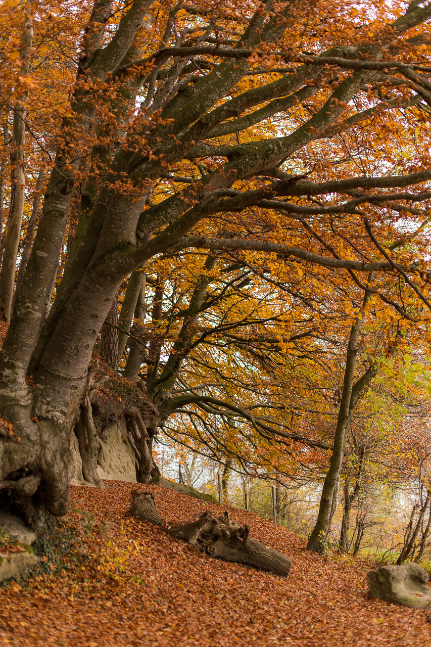 Nun müssen wir ein paar Meter abwärts auf der Strasse, bis der Weg wieder abzweigt in den Wald. Was für eine Pracht! Ich liebe den Wald zu dieser Jahreszeit. Aus totem Holz spriessen Pilze, neues Leben entsteht aus vergangenem. Ich bewundere den Kreislauf der Natur, die keinen Abfall kennt. Alles wird wiederverwertet, nichts verschwendet. Obwohl, manchmal hat man das Gefühl, diese Farbenpracht sei richtig verschwenderisch.