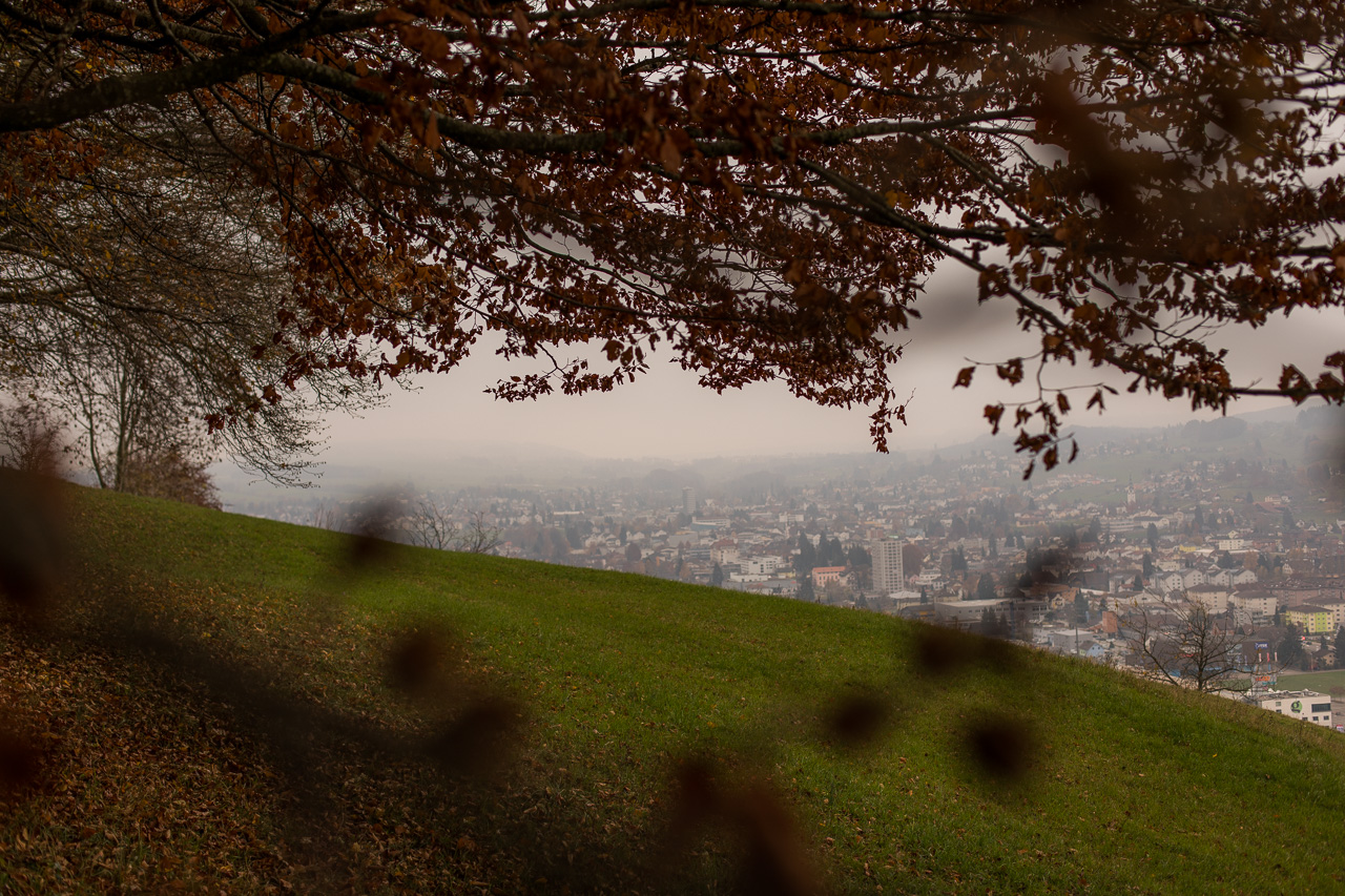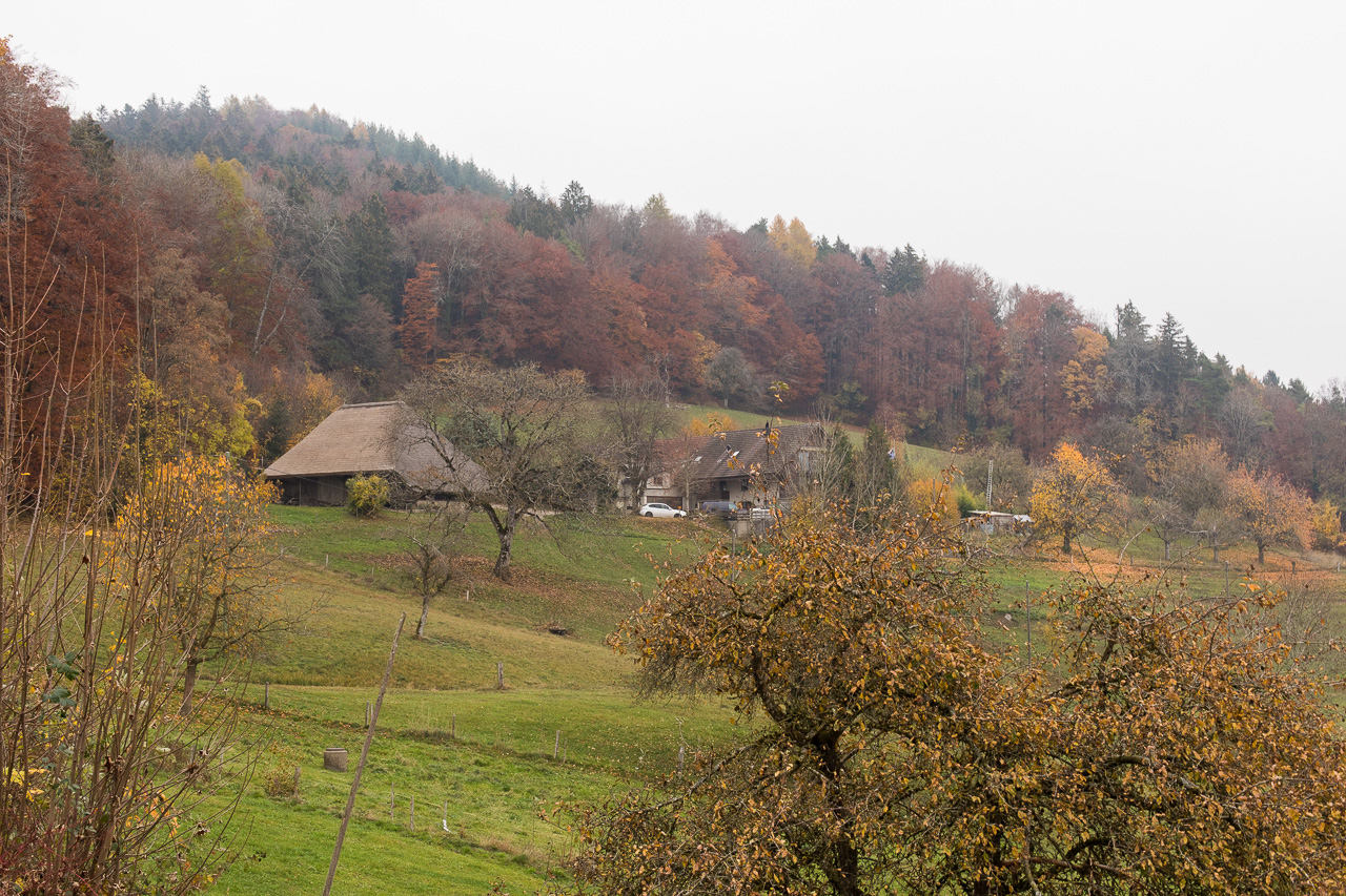 Nach der Bergtour auf den Fluebrig gestern wollen wie heute kleinere Brötchen backen und starten diesen Spaziergang vor der Haustüre, durchqueren schnell das Dorf (sehenswert ist es nun wirklich nicht) und steuern den Homberg an. Wir steigen hoch, vorbei an den Wiesen, die wir am Samstag zuvor gesäubert hatten, zu den Sandsteinfelsen. Von dort hätte man eine wunderbare Aussicht in die Berge, wegen dem Hochnebel bleibt uns diese heute versperrt. Dafür präsentiert sich der Wald in den prächtigsten Farben.