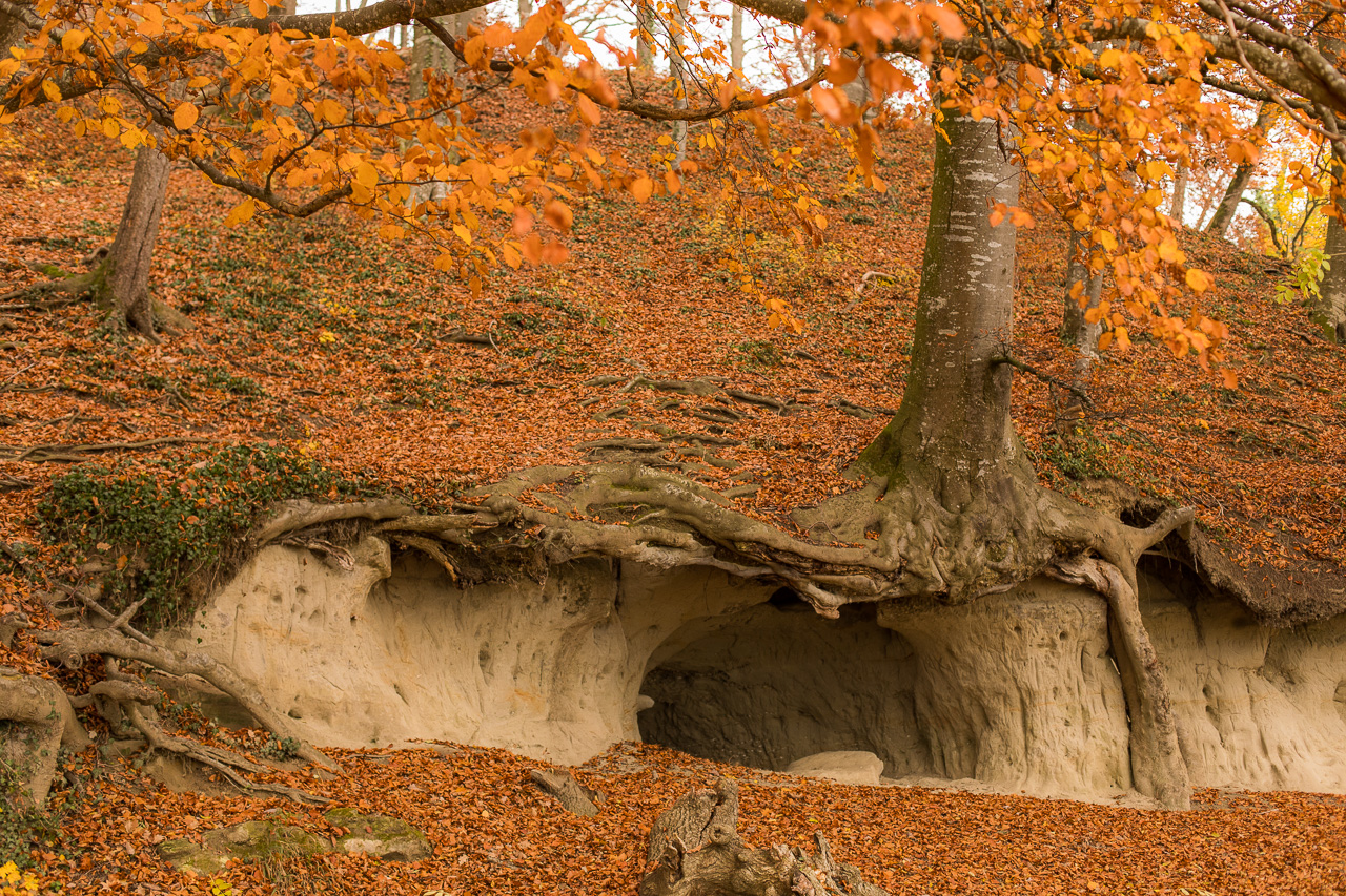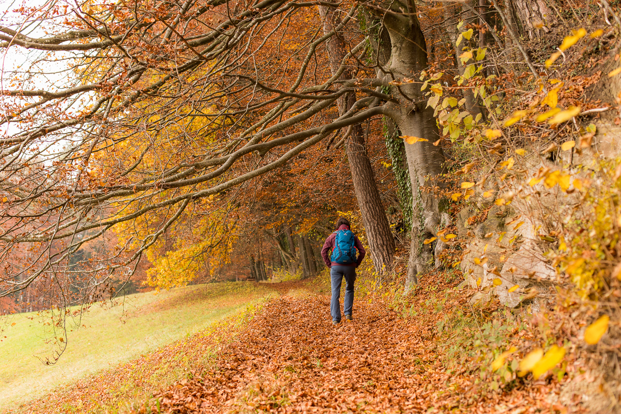 Auch wenn man glaubt, die eigene Gegend gut zu kennen, entdeckt man immer wieder faszinierende Facetten, wie zum Beispiel auf dieser Wanderung zum Leimbacher Strohdachhaus, die eher ein Spaziergang ist, aber im Herbstwald trotzdem wunderschön.