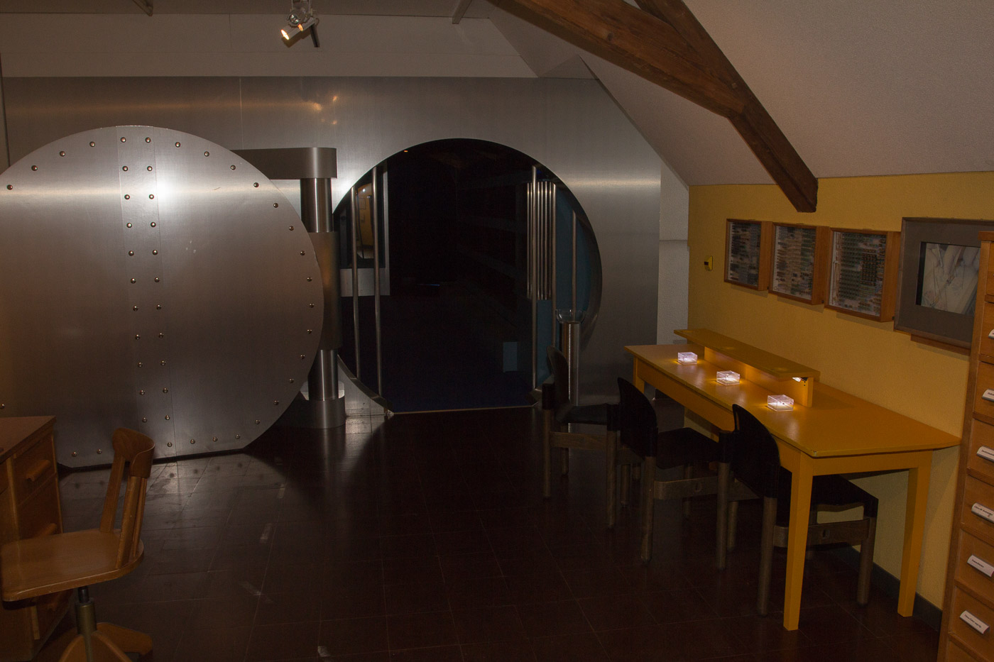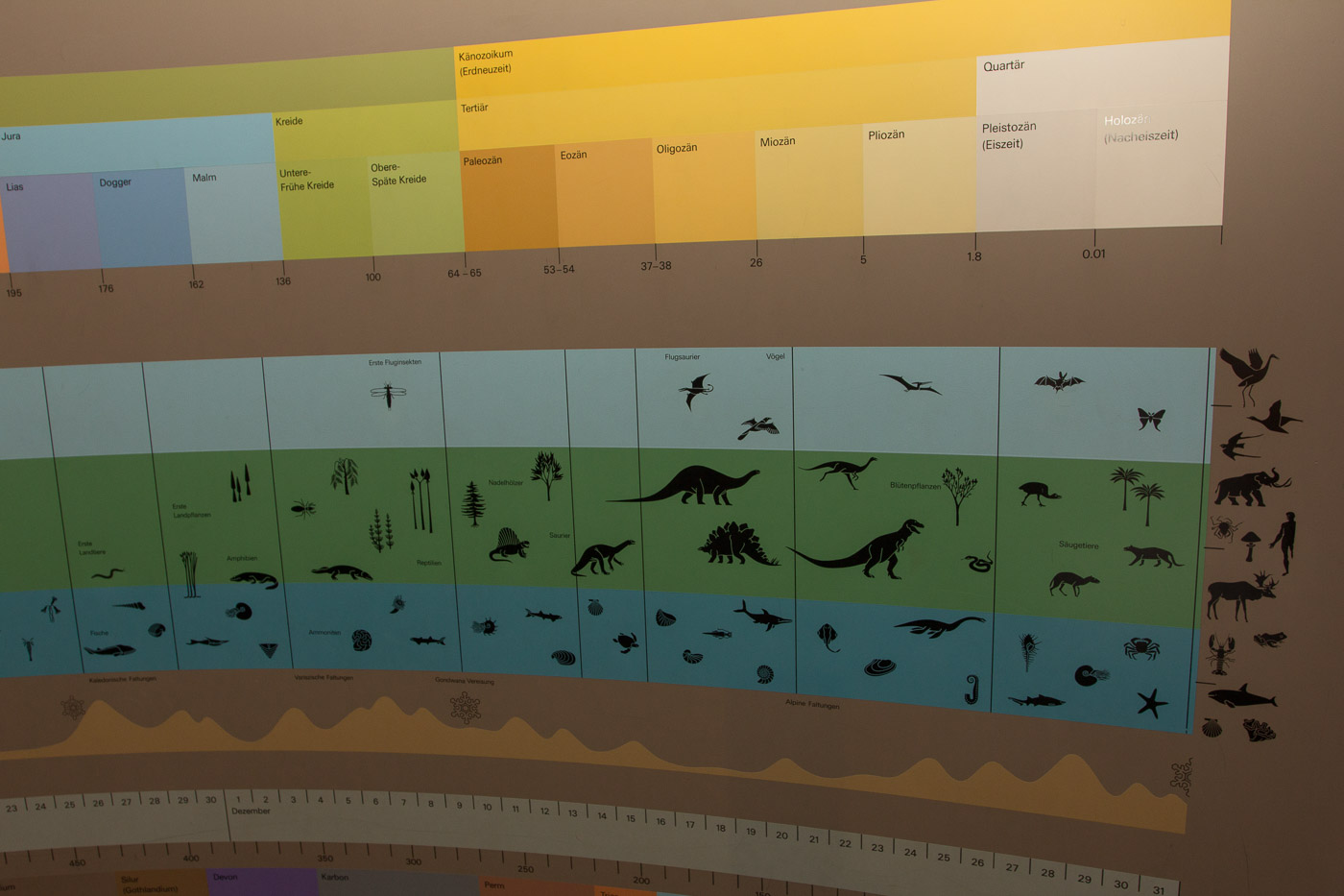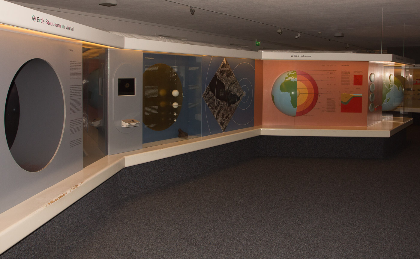 Die Dauerausstellung beginnt sehr früh, zeitgeschichtlich betrachtet, nämlich mit der Entstehung des Universums. Eine Mineraliensammlung zeigt die Vielfalt der farbigen Steine, Versteinerungen von Tieren und Pflanzen dokumentieren die Artenvielfalt vor Dutzenden und Hunderten Millionen Jahren. Und wer kennt noch die Erdzeitalter? Eine Schautafel ordnet nochmals alles, damit man wieder den Überblick hat. Beeindruckend, wie wenig Platz der Mensch auf der Zeitachse einnimmt. Und wie viel Schaden er in dieser winzigen Zeit angerichtet hat (und immer noch anrichtet). Ein Film von 23 Minuten Dauer führt das noch anschaulicher vor Augen. Auf einem Monitor neben der Leinwand läuft ein Fortschrittsbalken, der das Geschehen im Film erdgeschichtlich einordnet.