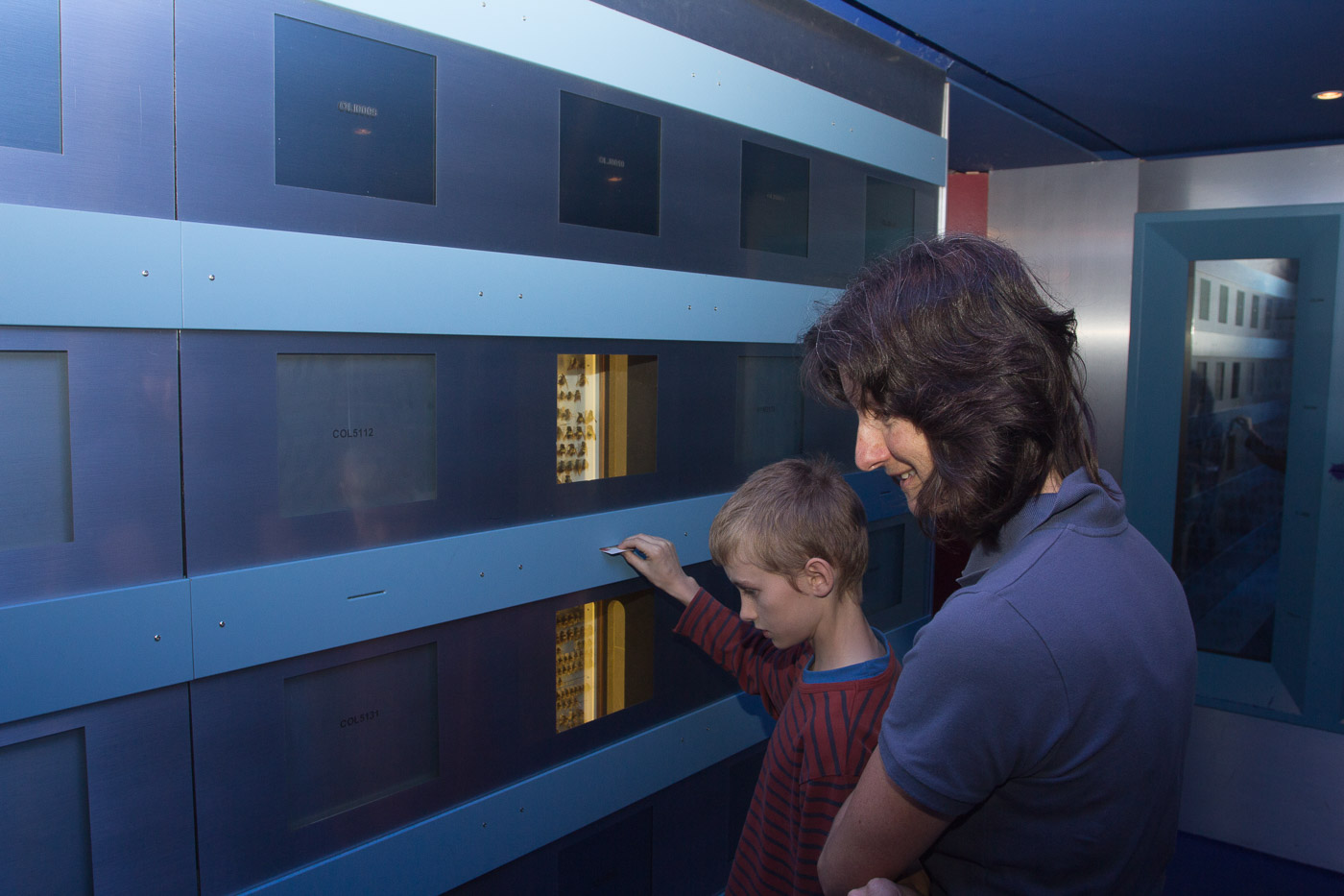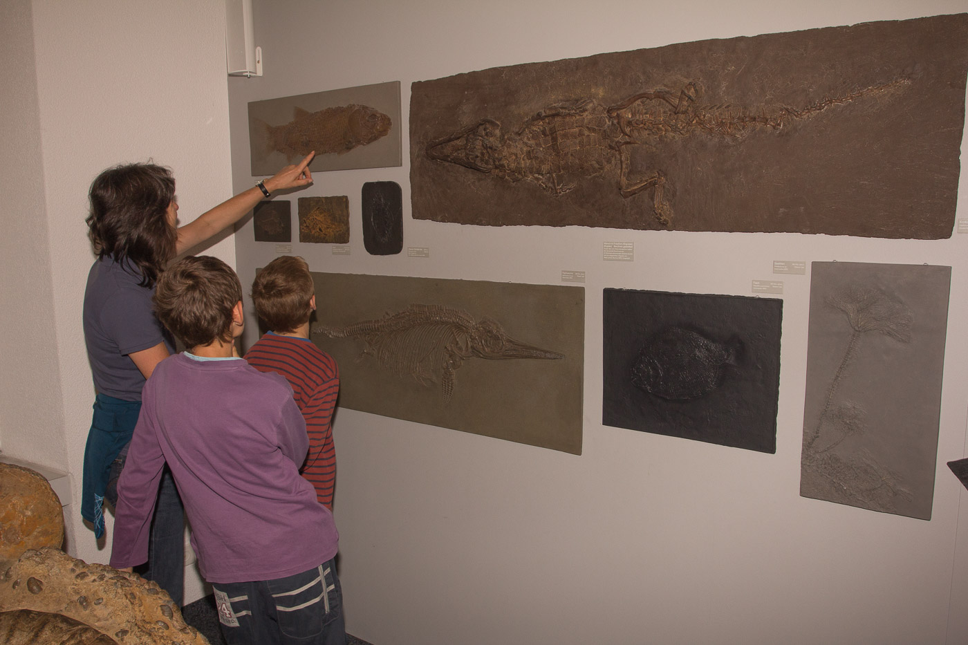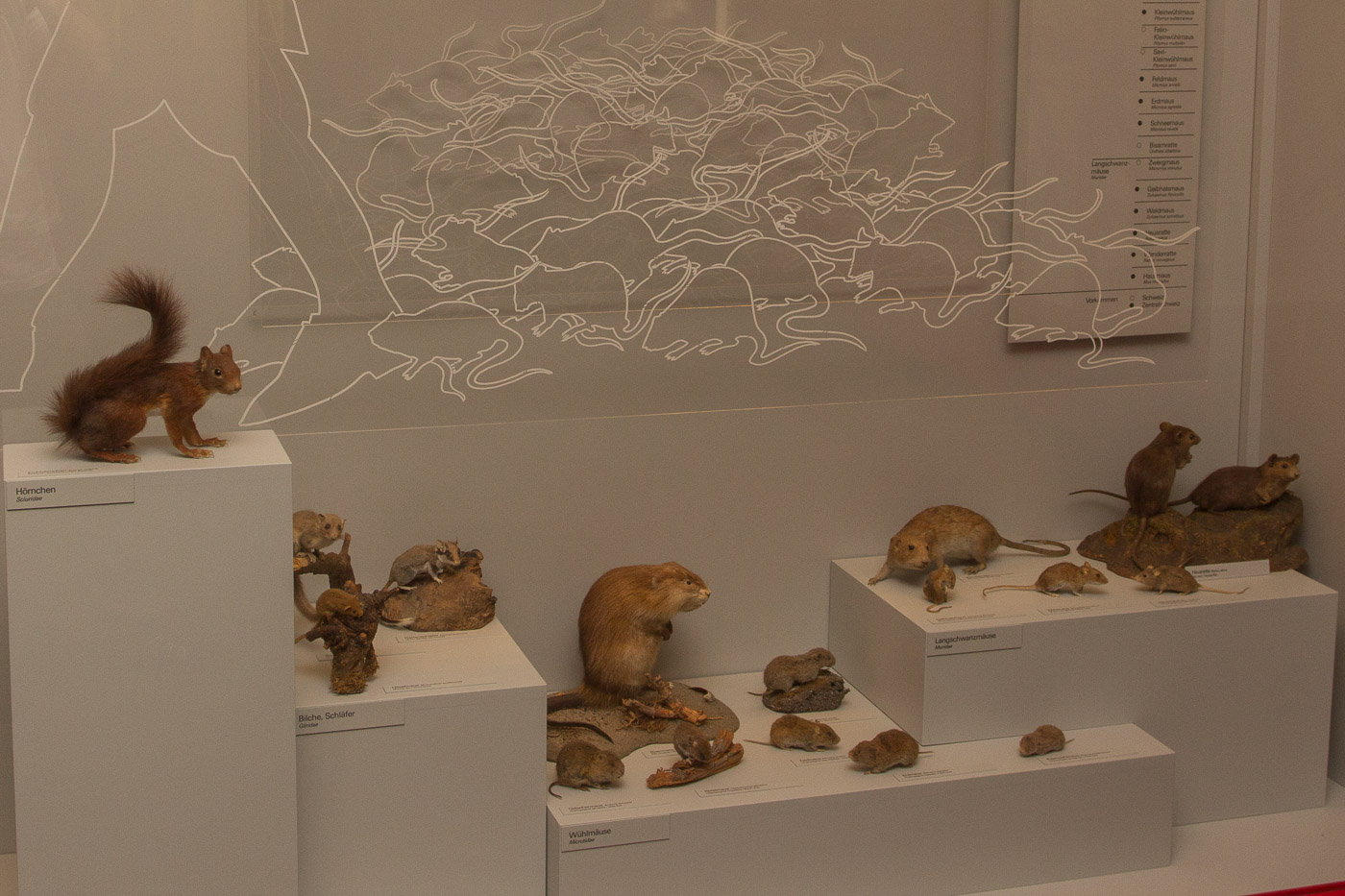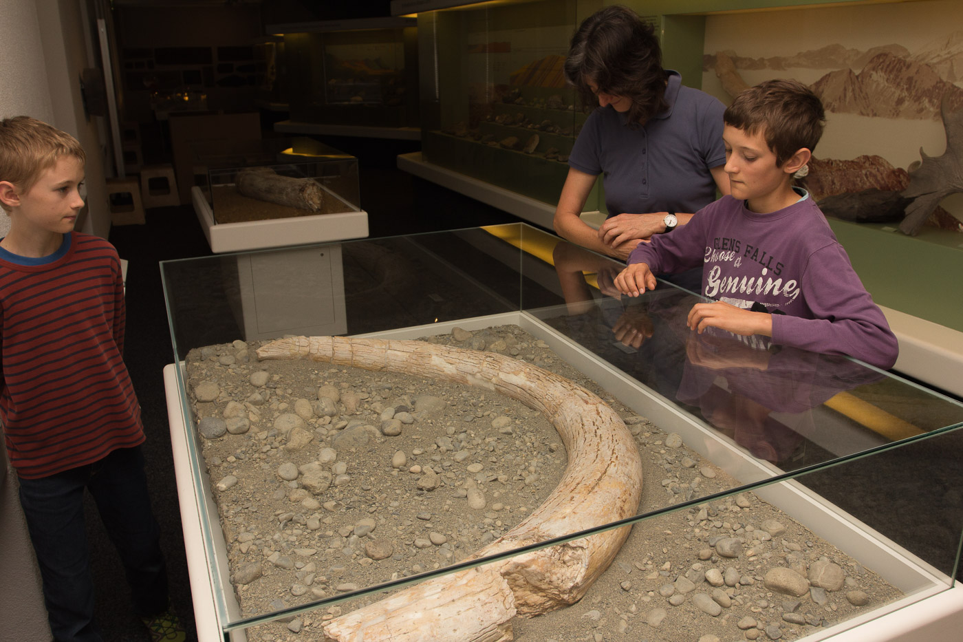 Natürlich lernt man auch etwas über die aktuellen Tiere. Nach Klassen geordnet können wir Säugetiere, Vögel, Insekten, Amphibien und Reptilien bestaunen. In einem Terrarium schauen wir den süssen Zwergmäusen zu, wie sie behende im Gras herumklettern. Im botanischen Teil der Ausstellung können wir uns in der Baumerkennung üben. Gar nicht einfach, wenn man nur den Stamm sieht. Zum Glück kann man jeweils auf der Rückseite nachlesen, um welchen Baum es sich handelt.