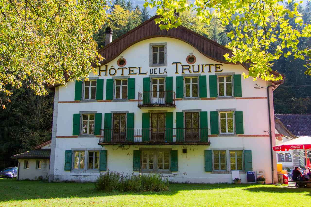 Immer wieder ertönte der typische Ruf der Wasseramsel, dem einzigen Singvogel, der tauchen kann. Für sie scheint es paradiesisch zu sein hier, wir wanderten also sozusagen im Reich der Wasseramsel. Der Weg ist sehr abwechslungsreich, Felsen, Fluss und alte Bäume bilden eine erquickliche Kulisse. Beim Hôtel de la Truite hätten wir einkehren können, wir zogen aber weiter. Und immer wieder fliegt knapp über dem Wasser eine Wasseramsel vorbei. Beim Saut de Brot überquerten wir die bekannte Steinbogenbrücke, von wo es nicht mehr weit war bis Noiraigue, dem Ziel der Wanderung. Im Bahnhof fanden wir einen kleinen Laden mit allerlei Leckereien aus dem Val de Travers vor, darunter natürlich auch allerlei aus Absinth, der „Fée verte“, dessen Ursprung hier im Tal ist. Ursprünglich eine Medizin, wurde es Mitte des 19. Jahrhunderts ein Modegetränk unter den Pariser Künstlern. Santé!