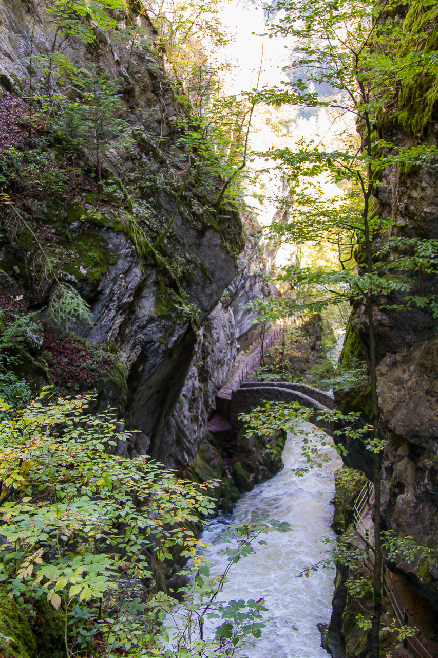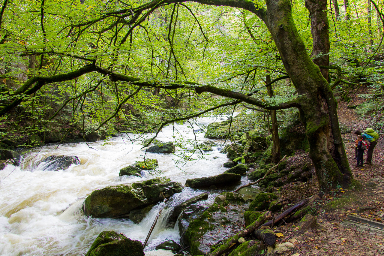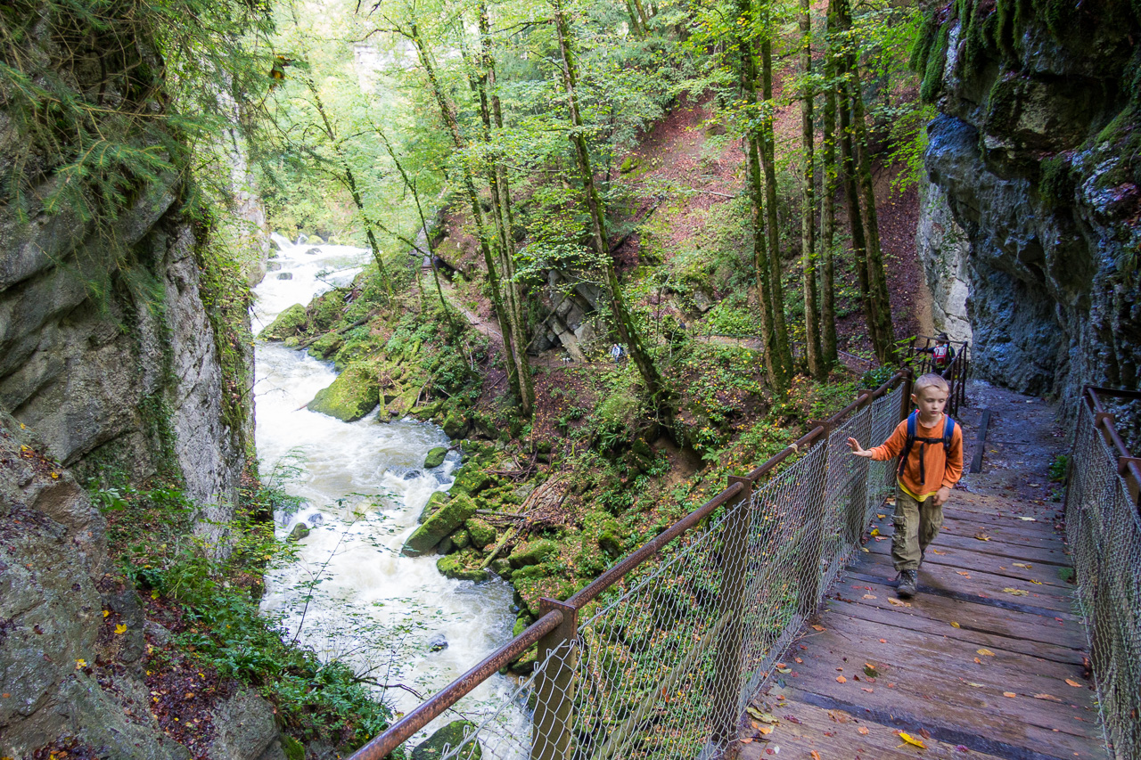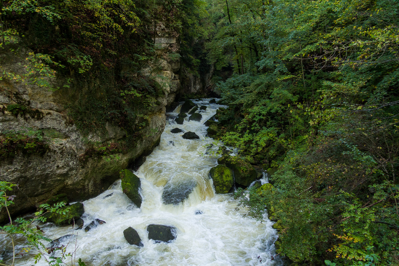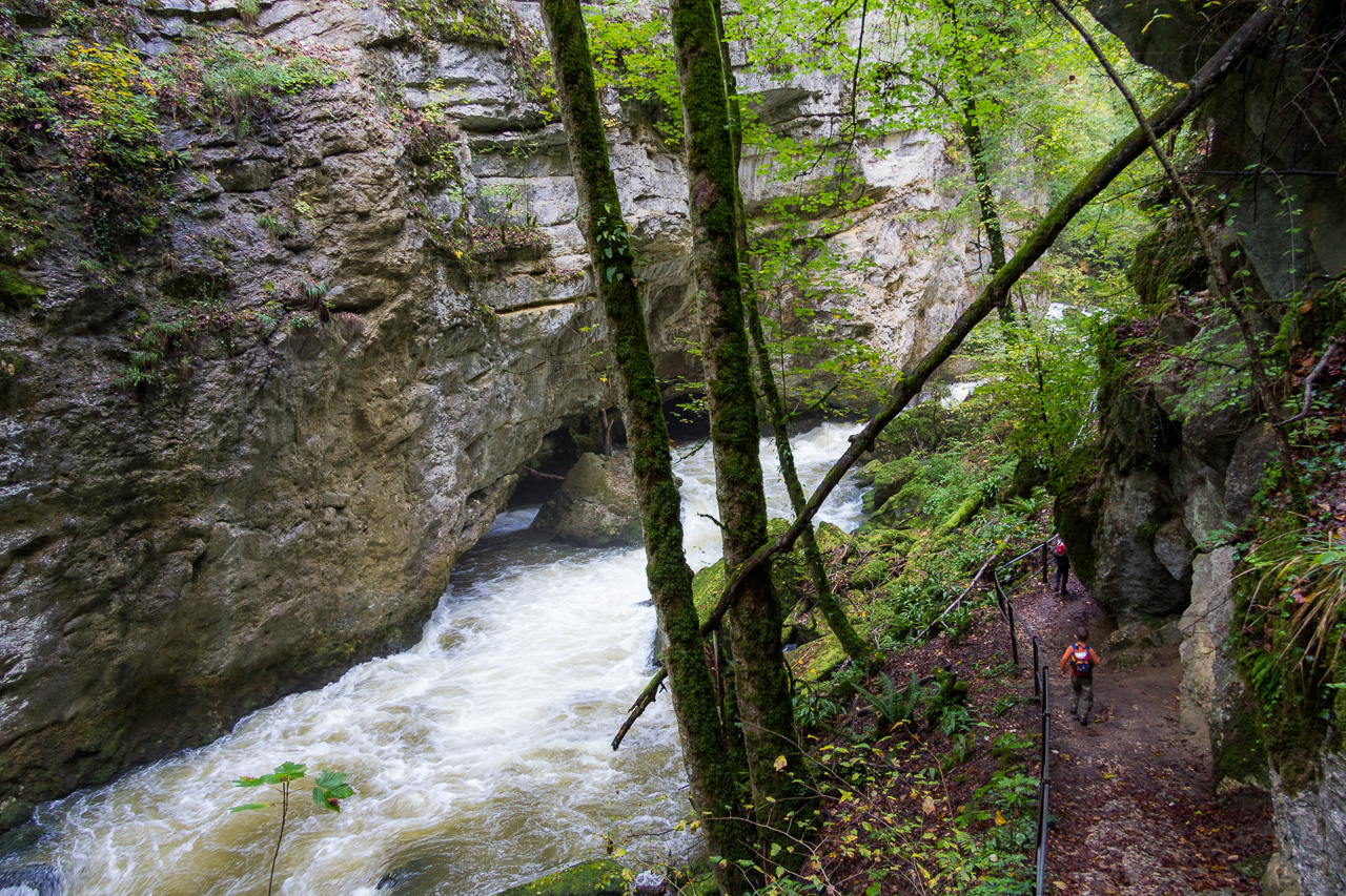 Es war vor geraumer Zeit, als wir die Aareroute wegen schlechtem Wetter abbrachen, genauer 2011. Ein paar Tage später war wieder schönes Wetter angesagt, welches wir nun wandernderweise im Val de Travers verbringen wollten. Der Eintritt in dieses Tal führte durch die Areuseschlucht. Der Weg schlängelte sich den Felswänden entlang, querte ein paar Mal die Areuse. Mal bewegten wir uns hoch über dem Wasser, mal gleich daneben. Da es in den letzten Tagen ausgiebig geregnet hatte, floss viel Wasser durch Schlucht, es rauschte gewaltig.
