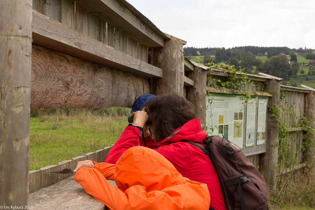 Das erste Ziel war der Hide beim Ronfeld. Dieser bietet einen Blick auf einen Teich mit Schilf, Riedwiesen, Gebüsch, Bäume und Wiesen. Also Habitate, die vielversprechende Beobachtungen vermuten lassen. Tatsächlich entdeckten wir zwischen den Binsen zwei Bekassinen, Watvögel auf dem Durchzug. Ein Mäusebussard setzte sich auf einen Pfahl, Distelfinken fliegen im Schwarm umher, ein Teichhuhn mit seinen drei Jungen sucht Nahrung. Gemäss einer Tafel müsste um diese Jahreszeit die Chance gross sein, auch Bruchwasserläufer sehen, vor uns verbergen sie sich aber. Wir bleiben mindestens eine halbe Stunde, bis wir weiter gehen.