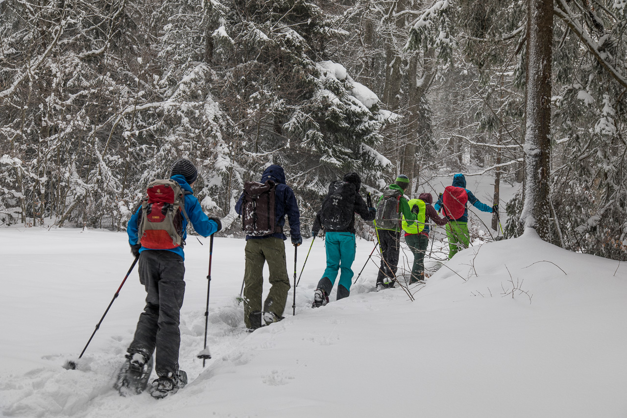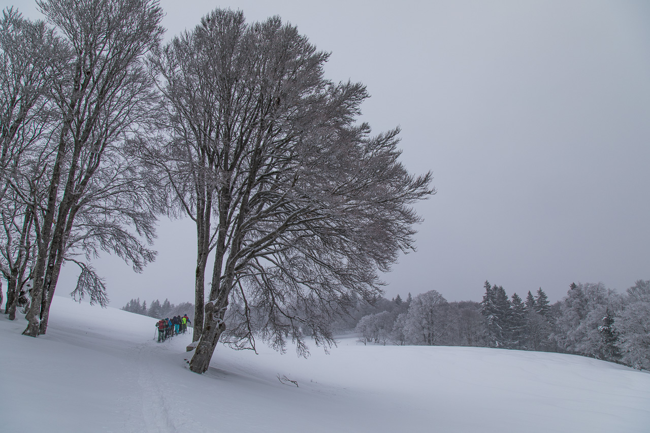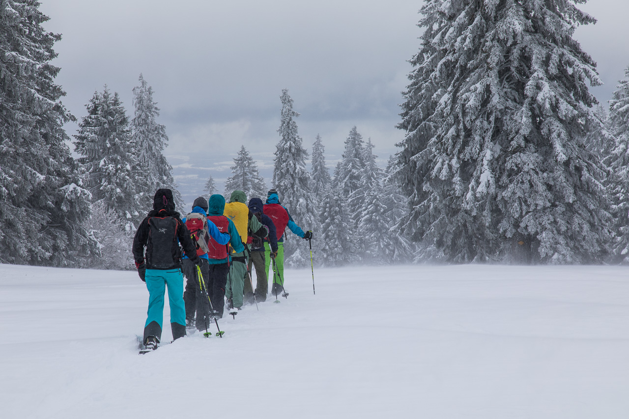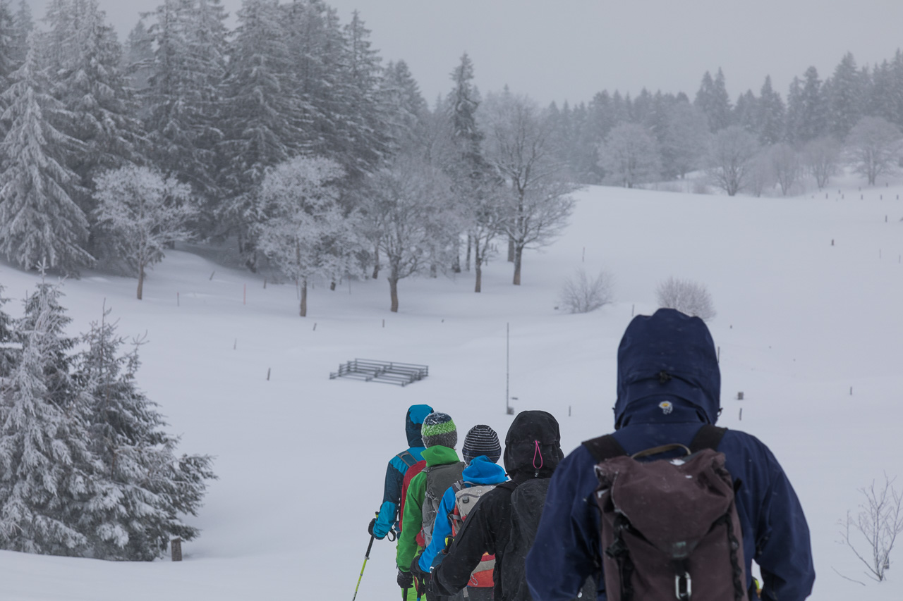Auf dem Col de la Tourne, der Neuenburg mit Les Ponts-de-Martel verbindet, entsteigen wir dem Postauto. Ein eisiger Wind peitscht uns den Schnee ins Gesicht. Ein Pistenbully hat soeben die Loipe präpariert, aber bei dem Wetter ist das eine Sisyphusarbeit. Das Passrestaurant hat geöffnet, aber der Tourenleiter drängt knallhart zum Aufbruch. Wir ziehen die Schneeschuhe an. Bei jenen meiner Frau reissen gleich ein paar Riemen: Sie sind brüchig geworden in den letzten fast zwanzig Jahren. Sie hat aber wohlweislich Skiriemen eingepackt und improvisiert nun damit. Wir gehen los, trotzen dem Schneesturm. Bald tauchen wir in den Wald ein, es wird ruhiger. Die Bäume sind schneebedeckt, es ist, als würden wir eine Kathedrale betreten, so sakral ist die Stimmung.