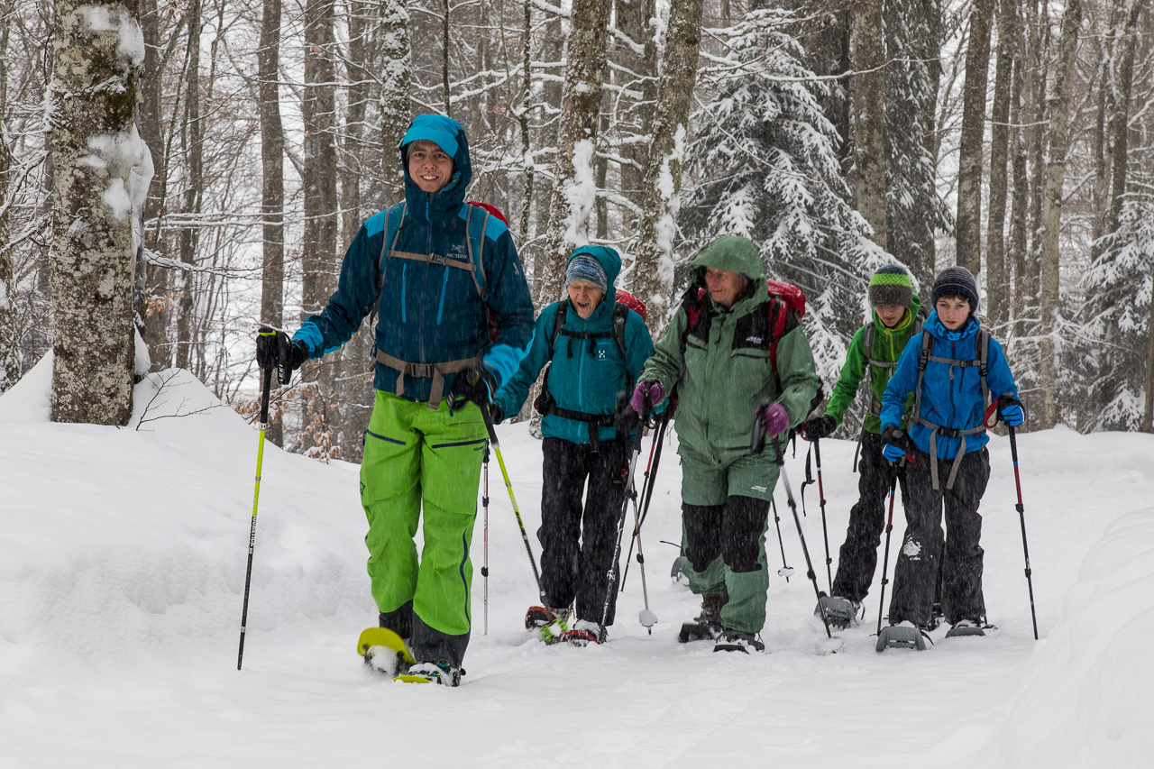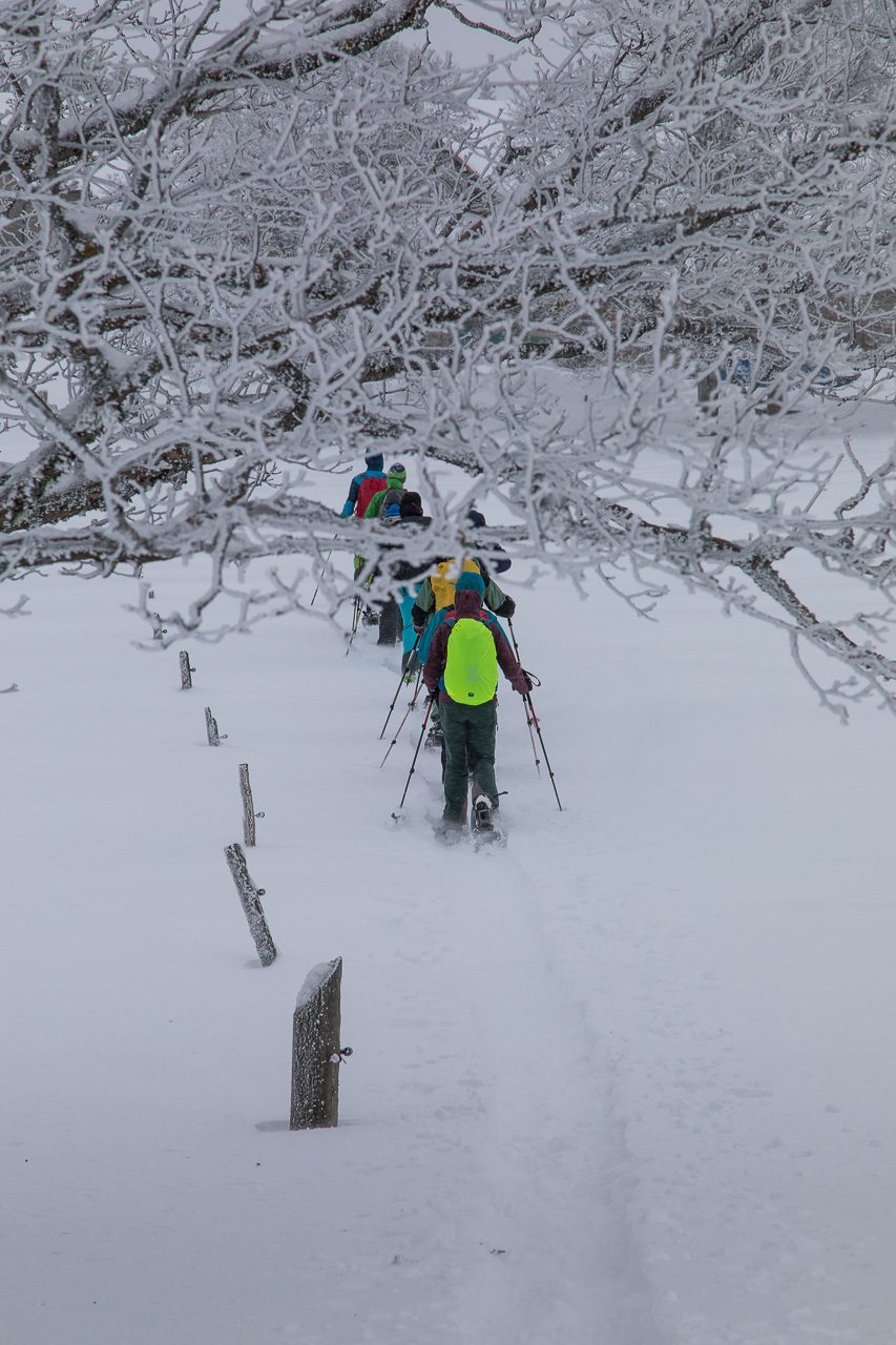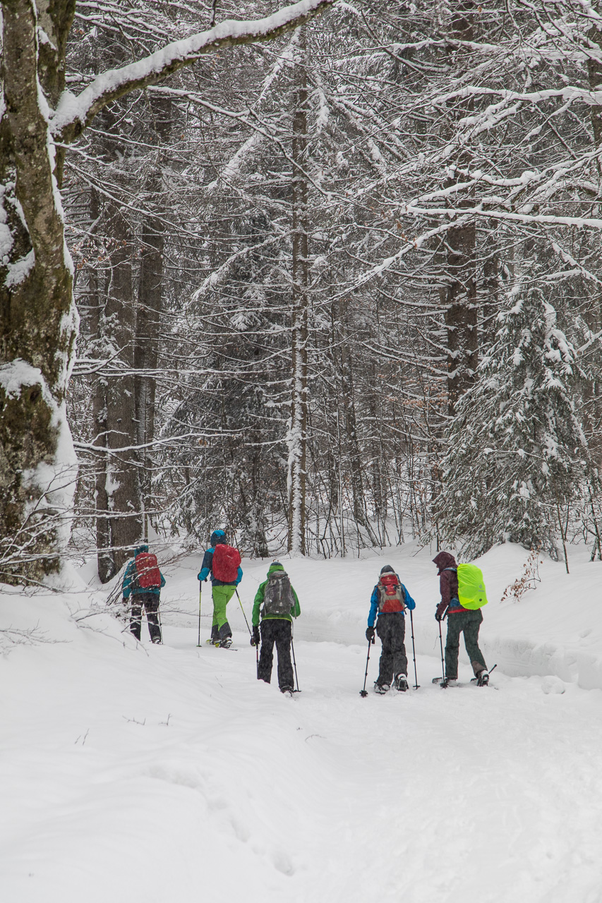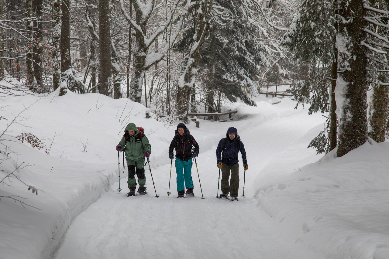 Auf dem Col de la Tourne, der Neuenburg mit Les Ponts-de-Martel verbindet, entsteigen wir dem Postauto. Ein eisiger Wind peitscht uns den Schnee ins Gesicht. Ein Pistenbully hat soeben die Loipe präpariert, aber bei dem Wetter ist das eine Sisyphusarbeit. Das Passrestaurant hat geöffnet, aber der Tourenleiter drängt knallhart zum Aufbruch. Wir ziehen die Schneeschuhe an. Bei jenen meiner Frau reissen gleich ein paar Riemen: Sie sind brüchig geworden in den letzten fast zwanzig Jahren. Sie hat aber wohlweislich Skiriemen eingepackt und improvisiert nun damit. Wir gehen los, trotzen dem Schneesturm. Bald tauchen wir in den Wald ein, es wird ruhiger. Die Bäume sind schneebedeckt, es ist, als würden wir eine Kathedrale betreten, so sakral ist die Stimmung.