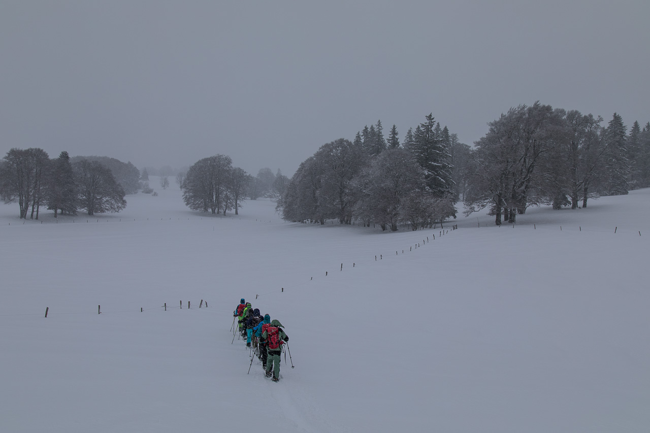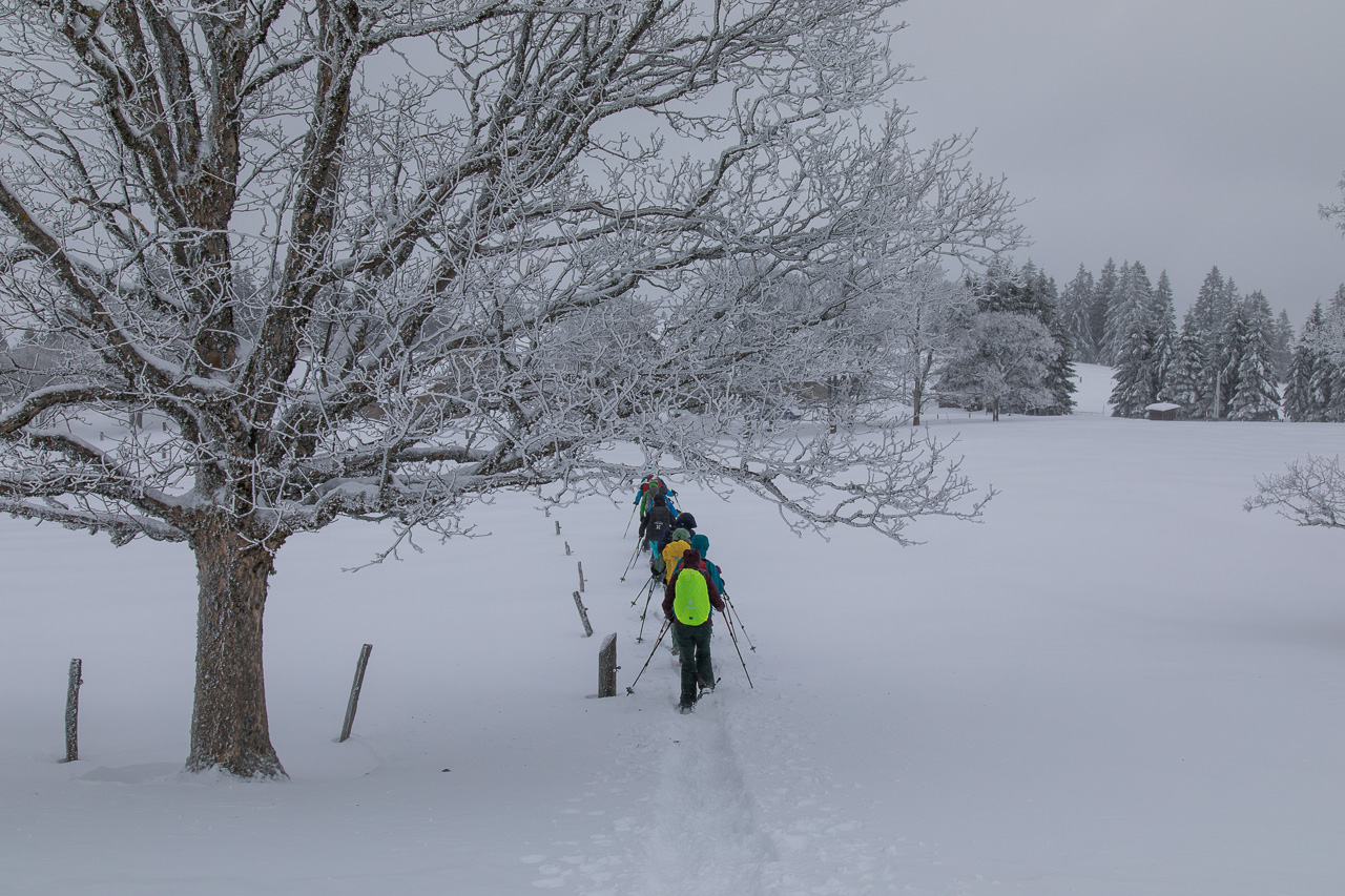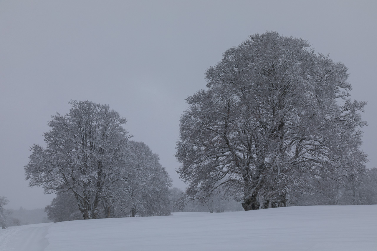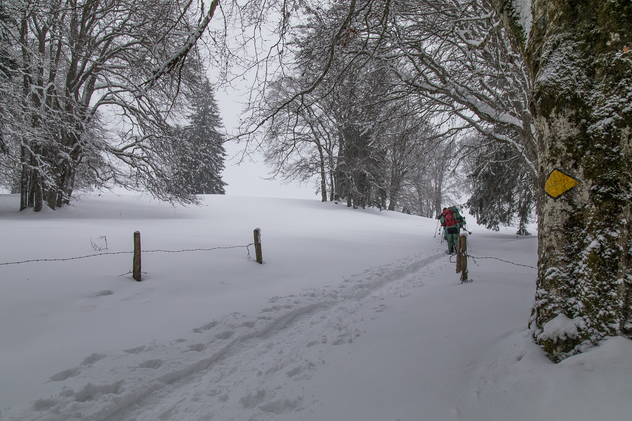Ewig sind wir nicht im Wald unterwegs, der Weg führt uns aufs freie Feld hinaus. Die Landschaft scheint monochrom, als hätte jemand die Farbe entfernt. Es gibt nur hell und dunkel, einzig unsere bunte Funktionskleidung setzt Farbtupfer. Wie Skulpturen stehen die einzelnen Bäume in der Landschaft, uralte Buchen und Ahorne. Und plötzlich gehen wir auf einem breiten Weg. Ach so, das ist die Langlaufloipe! Schwach sind noch die Rillen zu erkennen, schon bald werden sie zugeschneit sein. Ein Wegweiser zeigt, dass wir auf dem Jura-Höhenweg sind. Wir verlassen die Loipe wieder und durchqueren den Wald, gehen abwärts auf die Ebene von Les Sagneules. Dort legen wir, einigermassen von einem Stall vor dem Sturm geschützt, eine Pause ein.
