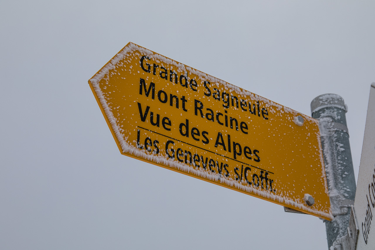 Wir setzen unseren Weg durch den Sturm fort, steigen hoch Richtung La Grande Sagneule, einem einsamen Gehöft in typischer Jurahausbauweise. Auch hier ist alles schwarz-weiss, die Bäume dick mit Reif behangen. Kleine Fichten sind in Eis gehüllt, die grossen in all den Jahren vom Wind geformt. Der Jura ist eine raue Gegend, vor allem im Winter. Eine Triangulationspyramide lässt vermuten, dass wir den Gipfel erreicht haben. Nordöstlich von uns befindet sich der Col de la Vue des Alpes. Das heisst, man hätte Aussicht in die Alpen. Hätte. Denn wir sehen gerade mal ein paar Meter weit. In der Richtung, wo die Alpen zu sehen sein sollten, ist einfach alles weiss.
