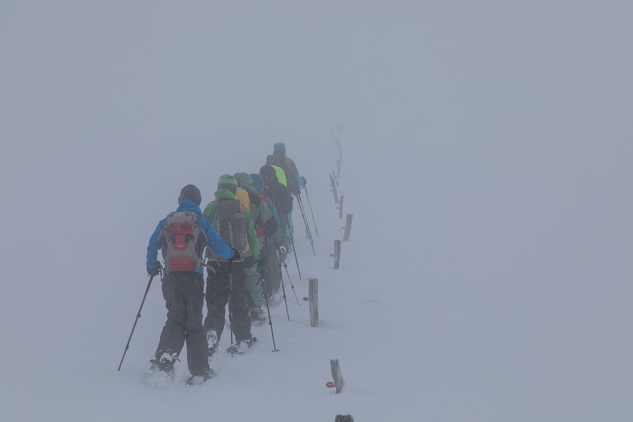 Lange halten wir uns nicht auf, zu unwirtlich ist es hier oben. Wir steigen ab, passieren eine Tafel, die darauf hinweist, dass wir uns hier auf einem Schiessplatz befinden. Weiter vorne ist denn auch eine Soldatenunterkunft und ein mit Schnee gefülltes Wachhaus. Wir müssen aber keine Angst haben, dass wir beschossen werden. Der Nebel ist so dicht, dass Pfosten das einzig Sichtbare sind im Weiss. Der Tourenleiter wird unsicher, die Karte wird kurz konsultiert. Aha, hier lang. Bald merkt er, dass er zuviel korrigiert hat und wir in die falsche Richtung gehen, nämlich genau 180 Grad! Wir korrigieren abermals und nehmen nun die richtige Richtung ein. Es geht abwärts, die Sicht wird besser. Wir erreichen Les Grandes Pradières, eine verwaiste Truppenunterkunft. Dort finden wir einen Windfang, wo wir vom Sturm unbehelligt eine zweite Pause einlegen können.