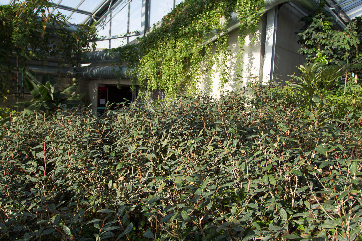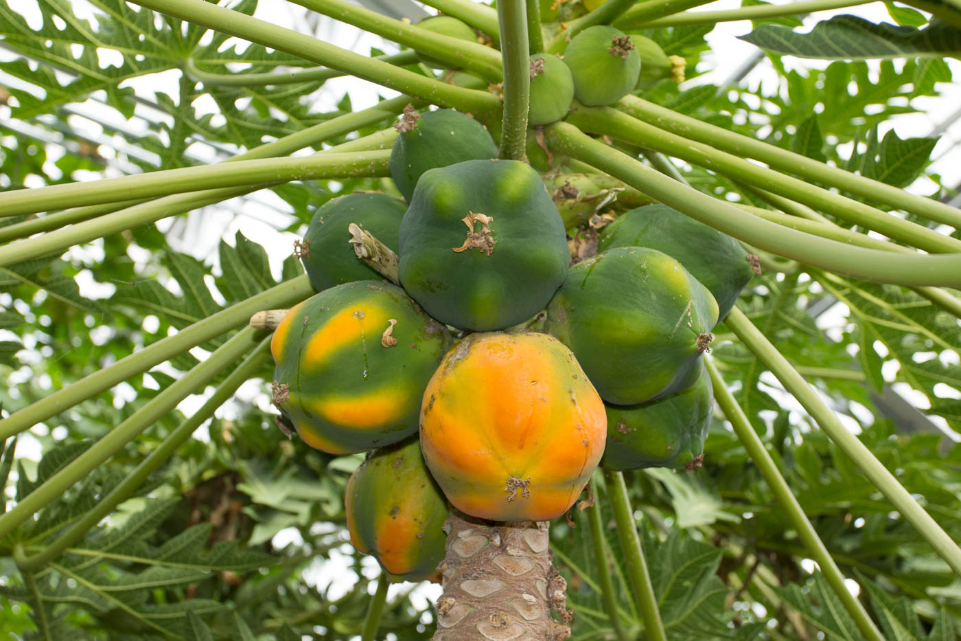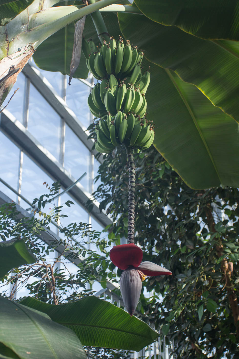 Beim Betreten des Gewächshauses schlägt einem die hohe Luftfeuchtigkeit von 95 % entgegen. Es dauerte eine Weile, bis sich die Temperatur der Linse diesen Verhältnissen angepasst hatte und nicht mehr beschlug. Und hier hängt der Himmel voller Früchte: Riesige Bananenbäume mit ebenso riesigen Fruchtständen, Mangobäume, Papaya und mehr.