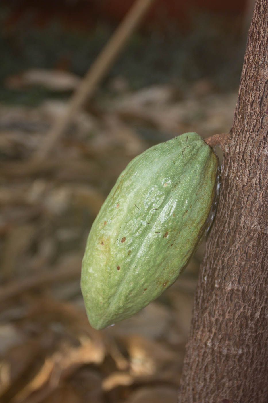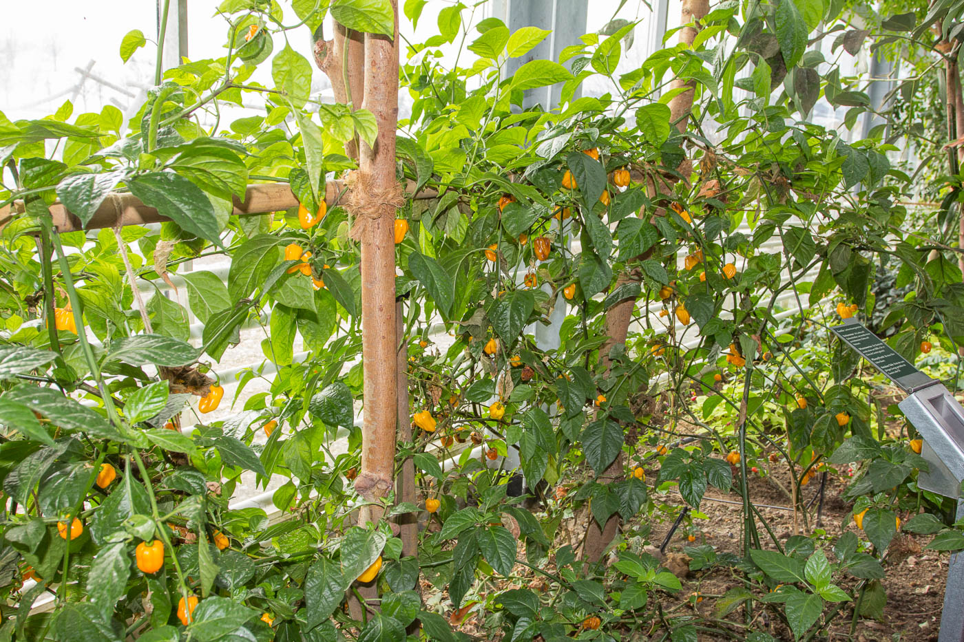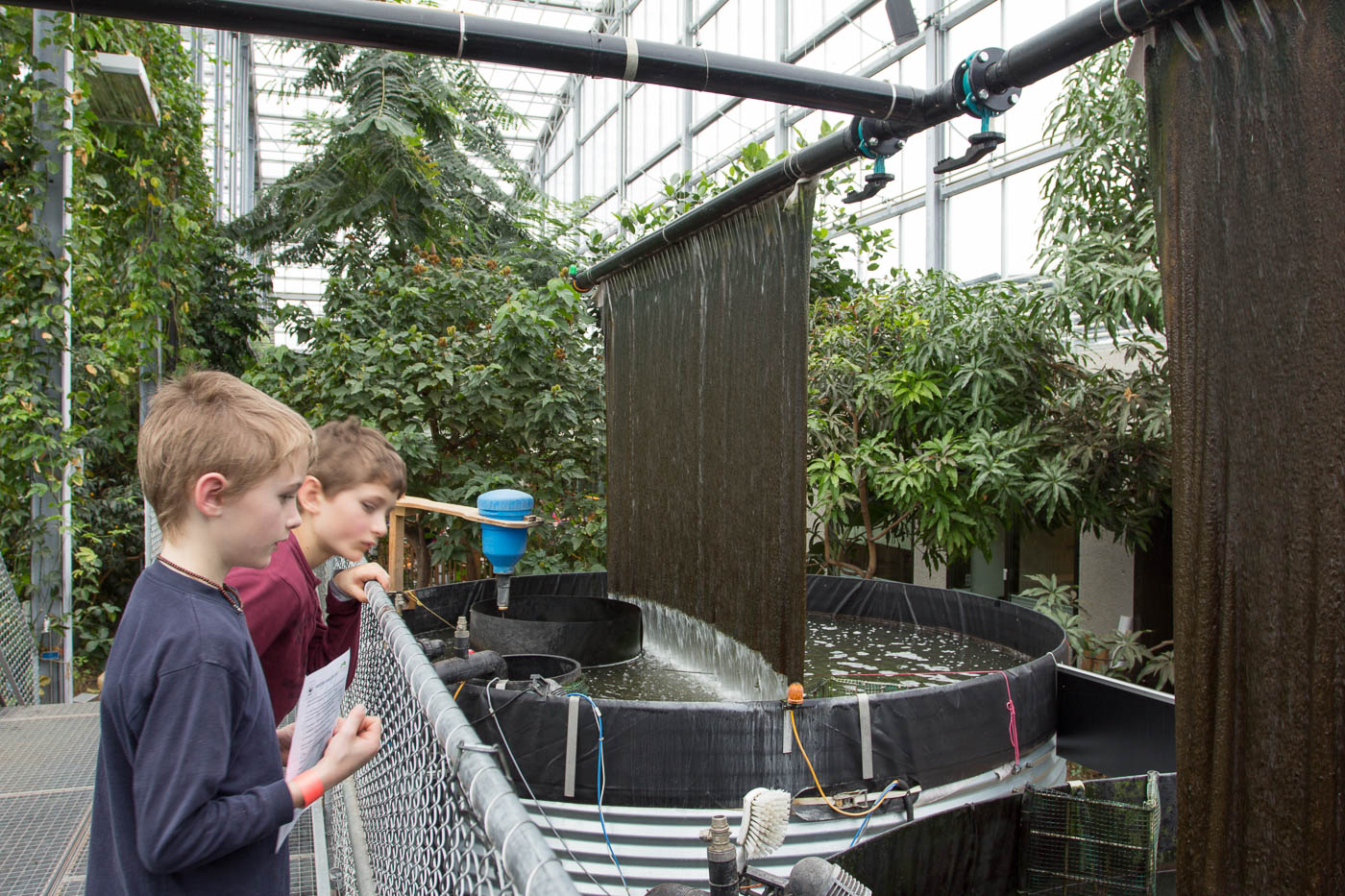 Beim Betreten des Gewächshauses schlägt einem die hohe Luftfeuchtigkeit von 95 % entgegen. Es dauerte eine Weile, bis sich die Temperatur der Linse diesen Verhältnissen angepasst hatte und nicht mehr beschlug. Und hier hängt der Himmel voller Früchte: Riesige Bananenbäume mit ebenso riesigen Fruchtständen, Mangobäume, Papaya und mehr.
