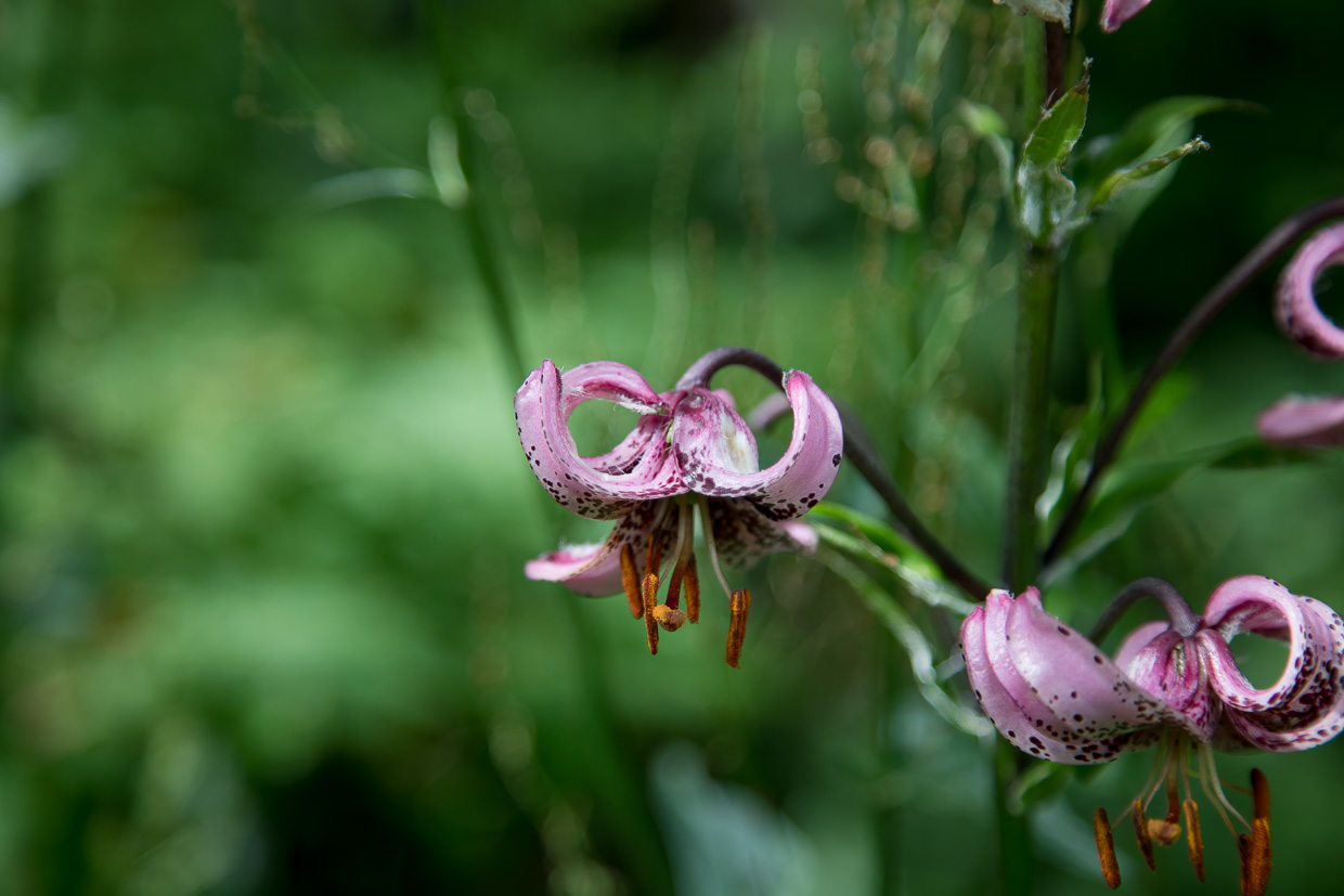 Nicht zu vergessen sind natürlich die Blumen. Auch da entdeckten wir einige ganz besondere, welche bei uns zu Hause nicht vorkommen. Orchideen gab es einige, hier sind nicht alle abgebildet. Die Lilien stachen besonders hervor, die eine mit ihren grossen, knallig orangen Blüten, die andere mit ihren rosafarbenen, speziell geformten Blüten, die an die Turbane der Sultane aus dem Osmanischen Reich erinnern, deshalb wird sie Türkenbund genannt.
