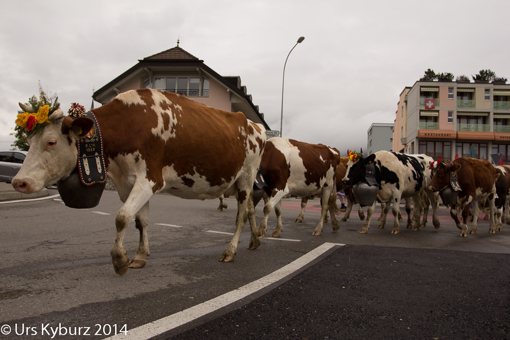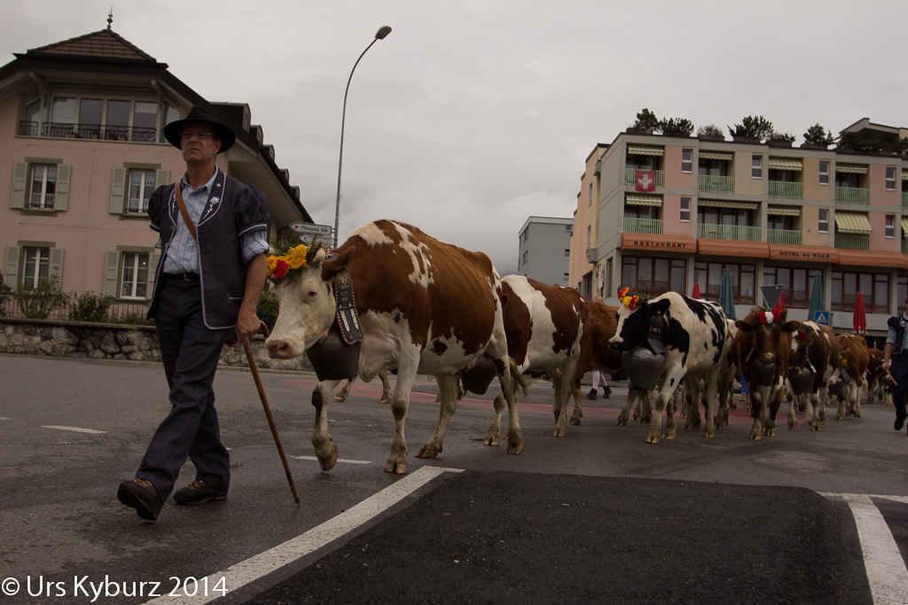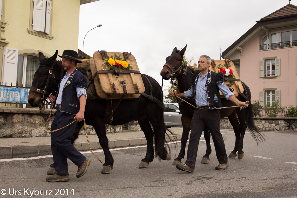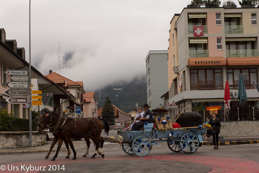 Das Unvermeidliche traf nun ein: Wir mussten nach Hause. Aber vorher wollten wir uns noch etwas gönnen und machten nach der Überquerung des Col des Mosses Halt in Broc im Kanton Fribourg. Dort gerieten wir unvermittelt in die Rush Hour: Der Alpabzug liess den ganzen Verkehr anhalten. Und niemand reklamierte, alle freuten sich. Prächtig geschmückt waren Mensch und Tier.