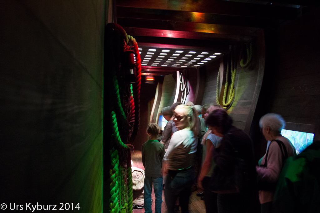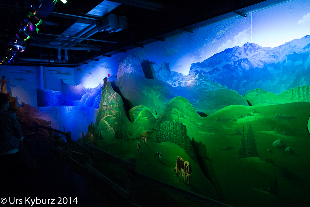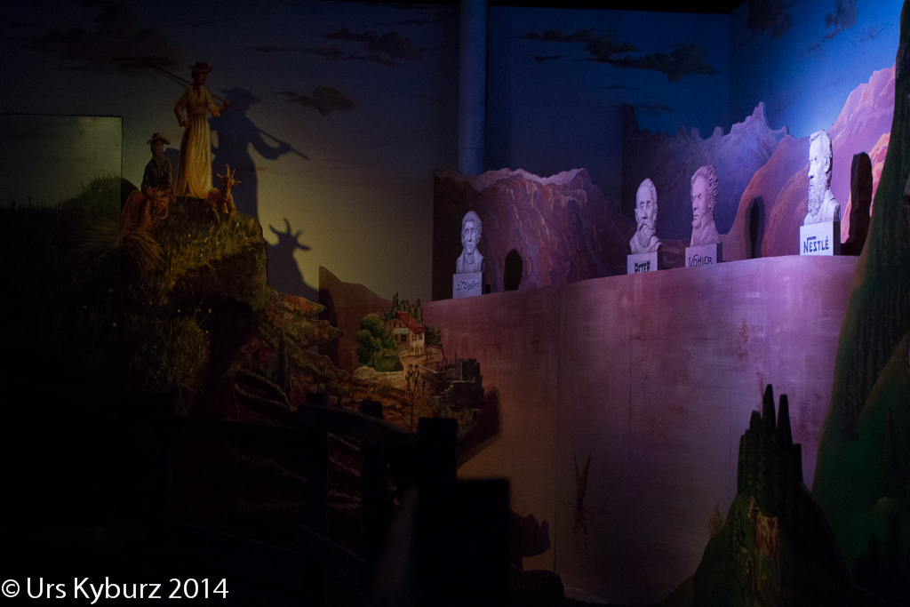 Und der Grund für den Halt in Broc? Das Maison Cailler, das Besucherzentrum der Schokoladenfabrik Cailler. Schon beim Weg vom Parkplatz zum Eingang stieg uns der Duft von Kakao in die Nase. Herrlich! Nach der Kasse kamen wir zuerst – natürlich – in den Fabrikladen. Rundum nur Schokolade! Wie soll man da widerstehen können? Zuerst begaben wir uns auf einen Rundgang. Wie auf einem Flughafen leuchtete auf einem Screen auf, wann man einchecken durfte, das heisst, wann der Rundgang startete. Von Station zu Station wurde uns die Geschichte der Schokolade näher gebracht.