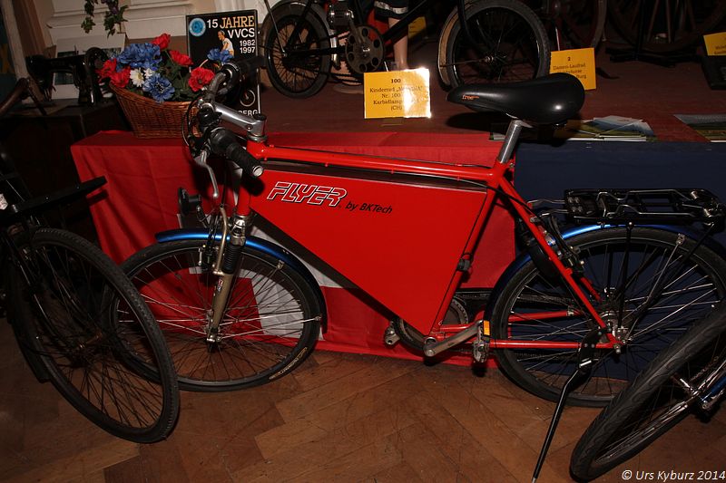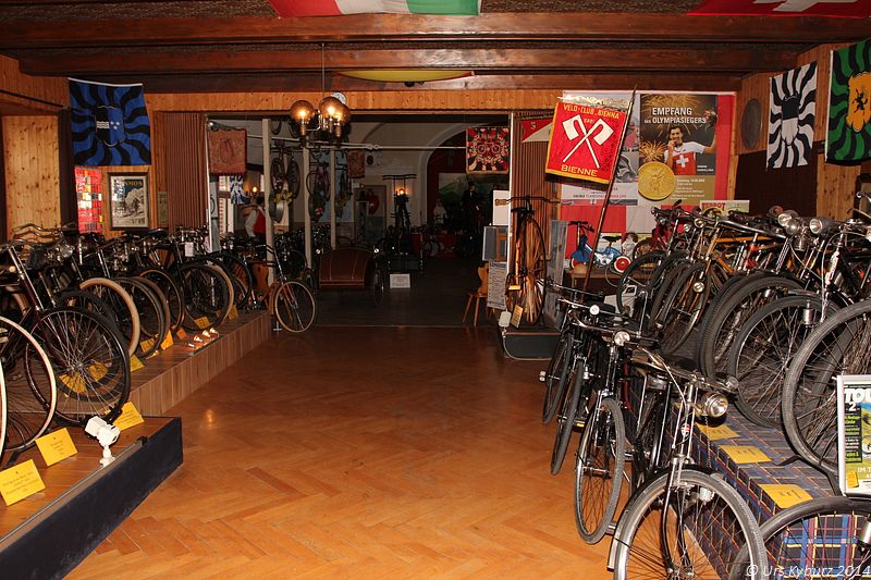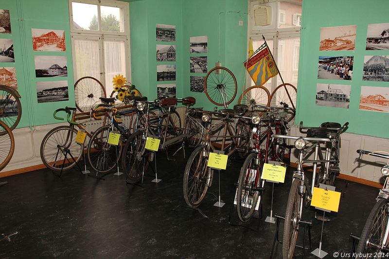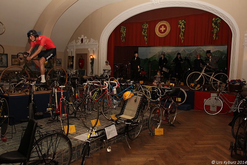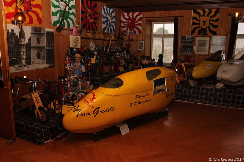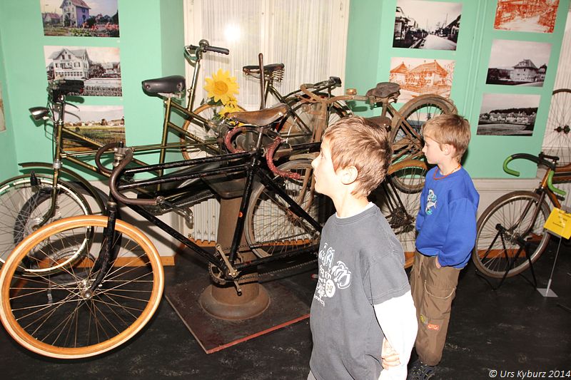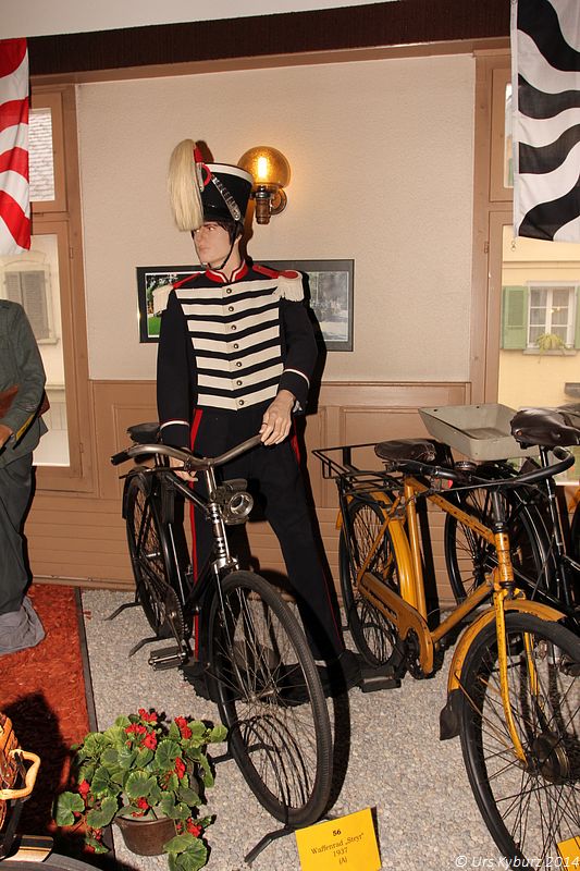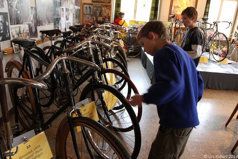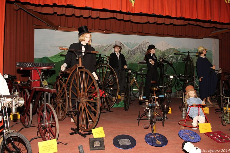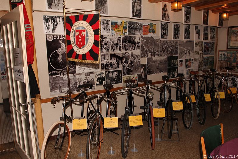 Herr Arnold kommt hinzu und gibt Auskunft. Ich merke schnell: Das Velo ist für diesen Mann nicht ein Hobby, sondern er lebt Velo! Die Beschriftung der Ausstellungsstücke ist wohl auf das Minimum beschränkt, aber mit ihm erfährt man mehr, als wenn die Exponate ausführlich beschriftet wären. Im folgenden Saal bestaunen wir weitere Rennvelos, Militärvelos, Postvelos, englische Räder, Kunsträder und so weiter.