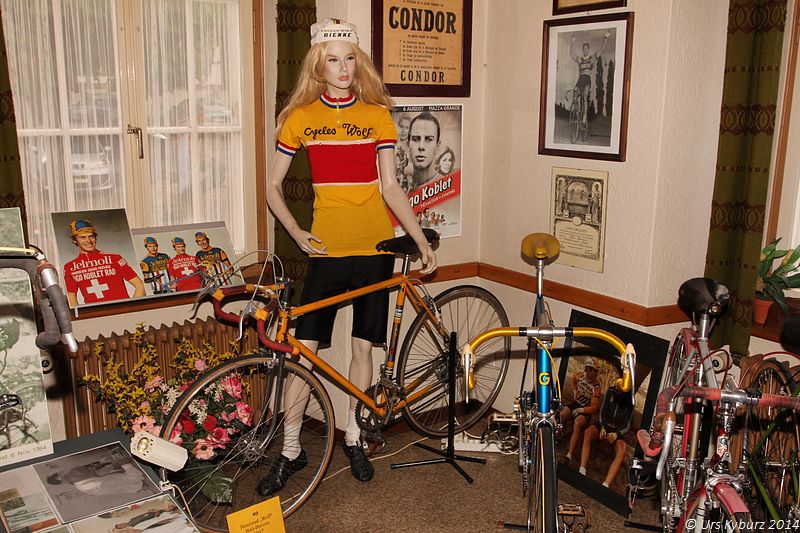 Vom Bahnhof Brügg her sind es bloss fünf Minuten zu Fuss. Als wir den Eingang doch noch gefunden haben, treten wir ins Museum ein… und stehen in einem rustikalen Restaurant. Auf den zweiten Blick sieht man jedoch, dass es hier hauptsächlich um das beste Kurzstreckenfahrzeug geht. Rechts um die Ecke sind sie dann aufgereiht, die Zeitzeugen des Velorennsports, vom Ende des vorletzten Jahrhunderts bis in die fünfziger Jahre des letzten Jahrhunderts. Auf einem Podest sind die Arbeitsgeräte von Ferdy Kübler zu bestaunen, umrahmt von Bilder und Presseausschnitten.