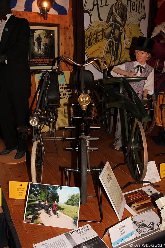 Ein Stock höher wird uns die ganze Geschichte des Fahrrades präsentiert, von der Draisine des Freiherrn von Drais bis zur Hightech-Carbon-Triathlonmaschine. Wir bestaunen zuerst einmal die vollverschalten Liegevelos.