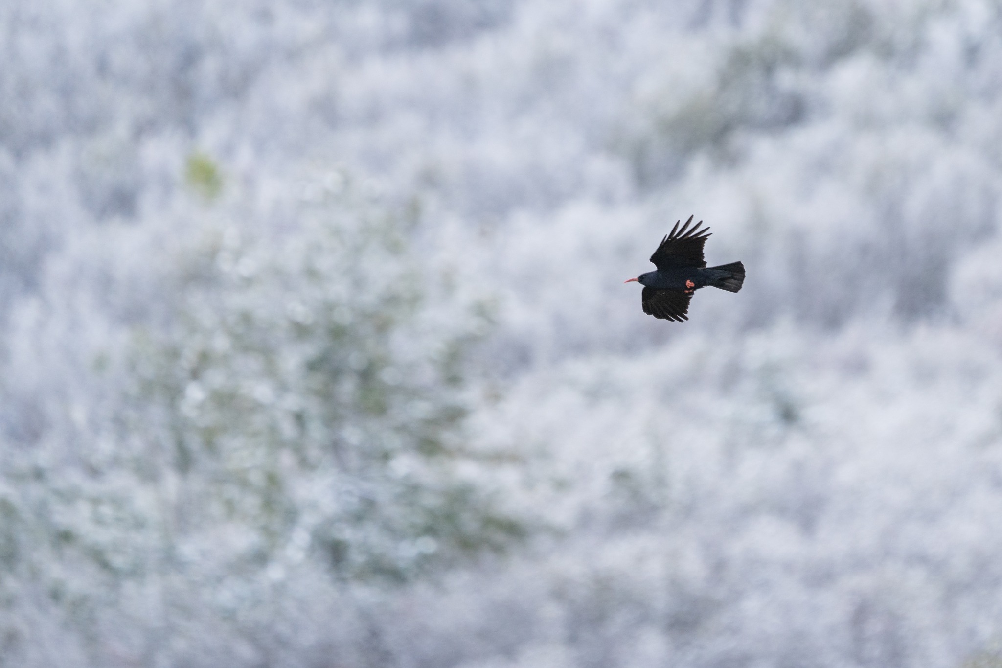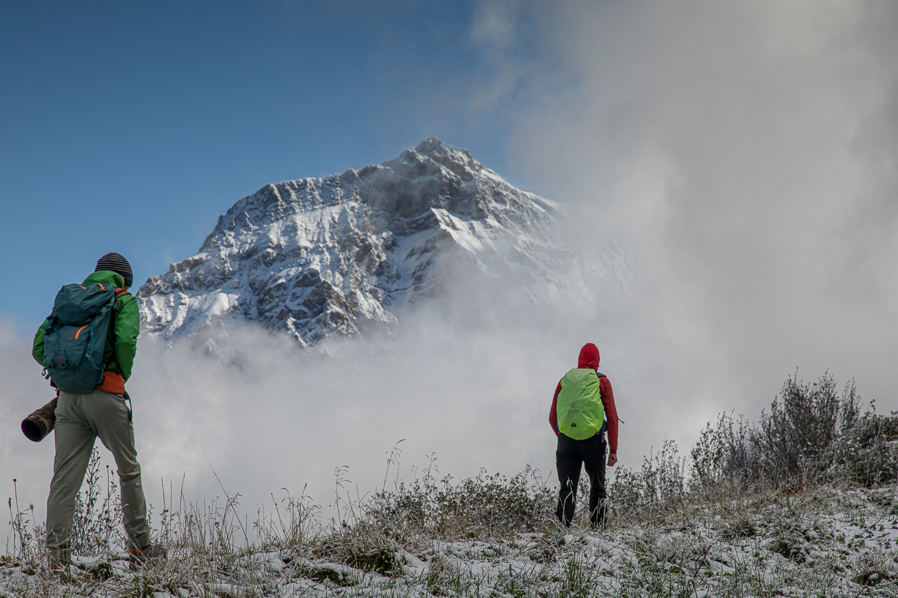 Auf dem weiteren Weg zur Alp Arpille wabern immer noch Wolken zwischen uns und dem Diablerets-Massiv. Da fliegen wieder zwei schwarze Vögel vorbei: Wieder Alpenkrähen! Silvan kann sie diesmal sogar gut fotografieren.
