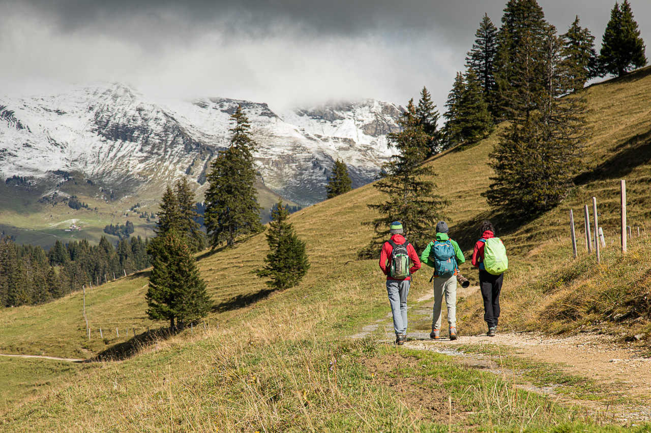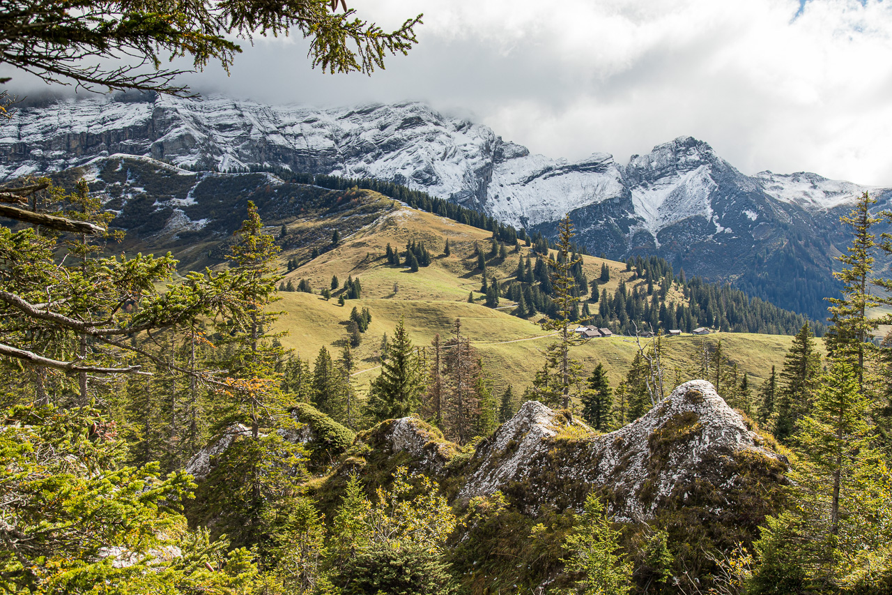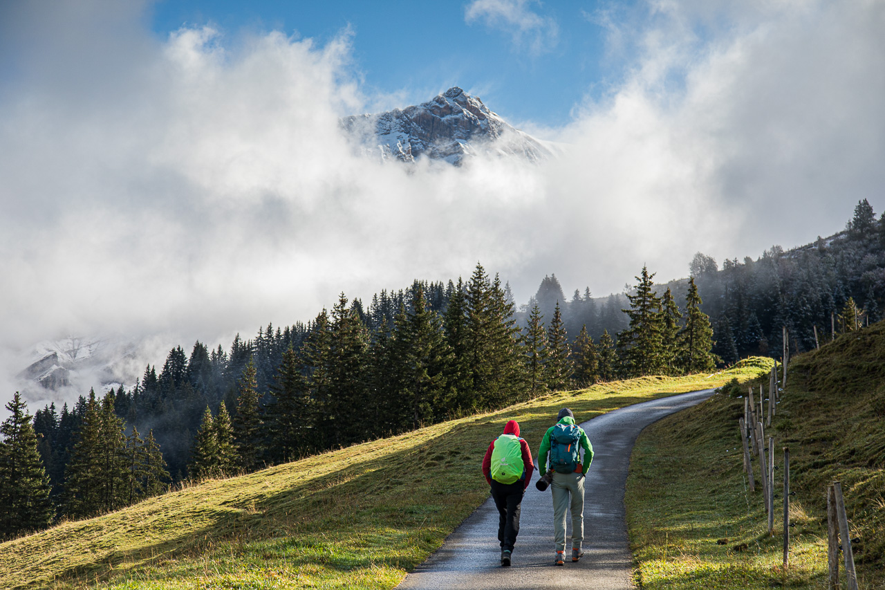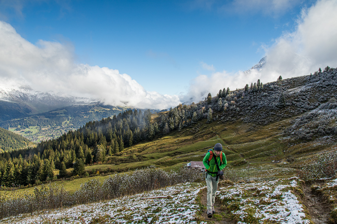 Nach dem Asphalt folgt bei der Alp Arpille endlich ein Wanderweg, der wegen den Kühen und dem vorangegangenen Regen ziemlich dreckig und rutschig ist. Wir erreichen nun auch die Schneegrenze, alles ist leicht überzuckert. Fabian geht alles zu langsam, er ist weit voraus, da wir immer wieder stehen bleiben, horchen und schauen. Zum Beispiel hören wir einen Specht klopfen. Was das wohl für einer ist? Bei uns im Flachland würde man sofort einen Buntspecht annehmen, aber hier im Gebirgswald auf 1900 Meter könnte es auch ein Dreizehenspecht sein. Leider sehen wir ihn nicht.
