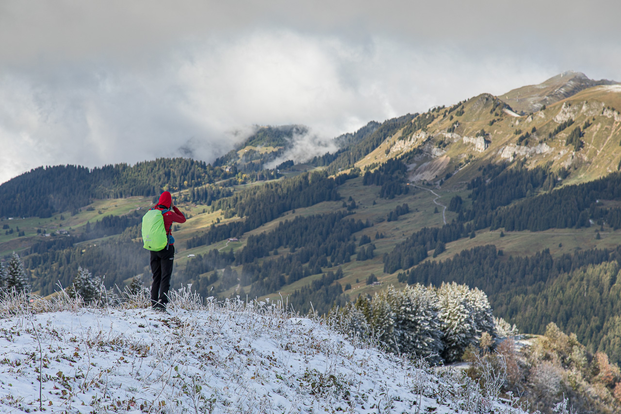 Der Start auf dem Col de la Croix ist sonnig, aber kalt. In der vorangegangenen Schlechtwetterphase hat es in höheren Lagen geschneit, und da wollen wir jetzt hin, auf die Pointe d’Arpille. Am sechsten Tag sind wir zum ersten Mal alle vier zusammen unterwegs, Silvan hat sich einigermassen erholt von der Erkältung.