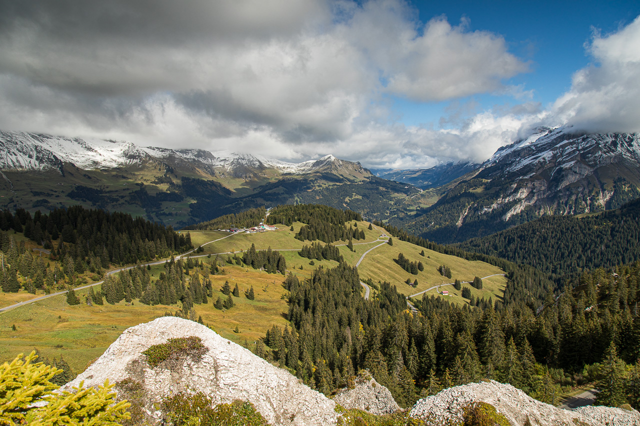 Zuerst steigen wir der Passstrasse entlang ab, das Wegstück ist zum Glück kurz. Zur Alp La Croix geht es weiter auf Asphalt, aber immerhin ohne Verkehr (also nicht, dass es auf der Passstrasse viel Verkehr gehabt hätte, aber es hatte halt). Kurz nach der Alp fliegt ein schwarzer Vogel vorbei. Naja, Rabenkrähe oder Alpendohle vermutlich. Silvan zückt sofort seine Kamera und hält drauf, schaut danach die Bilder an: „Das ist eine Alpenkrähe!“, ruft er begeistert. Tatsächlich, schwarz, roter Schnabel, rote Füsse, eindeutig eine der seltenen Alpenkrähen!