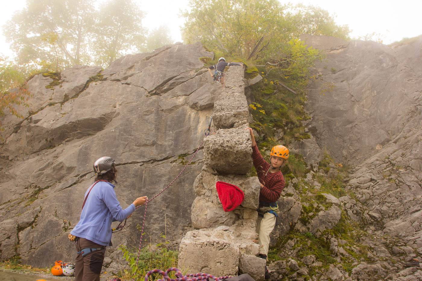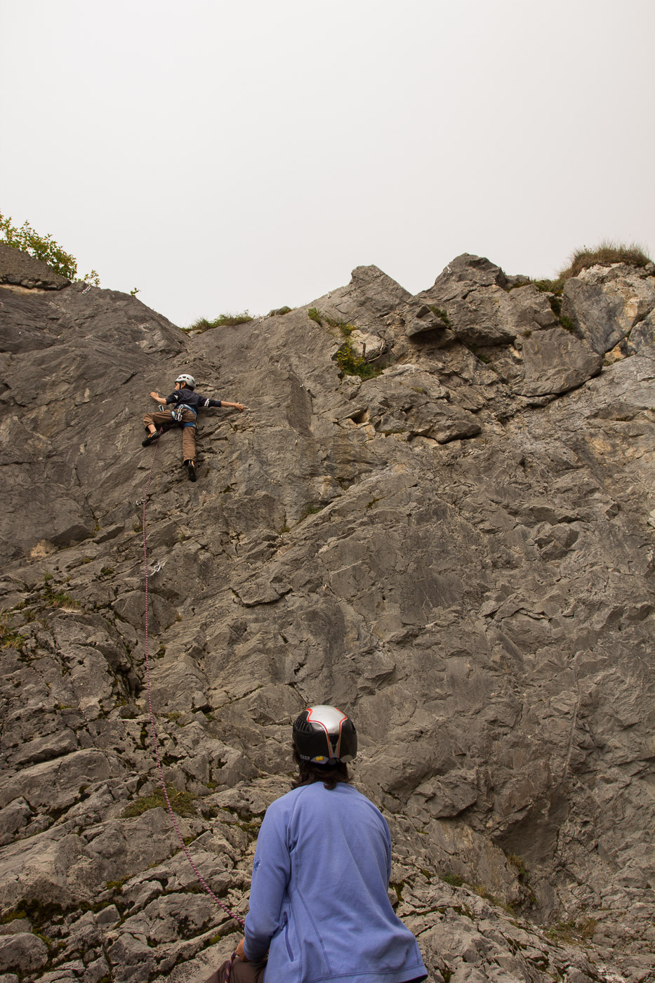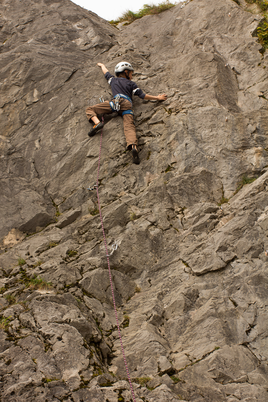 Da Leysin bekanntermassen alles andere als flach ist, entschieden wir uns, für einmal die Bahn zu nehmen. Das Wetter versprach schön zu werden, wir warteten an der Sonne auf die Zahnradbahn. Drei Stationen weiter, beim Grandhotel, war Endstation. Eine Viertelstunde später waren wir bereits im Klettergarten, zu unserer Überraschung aber nicht alleine. Ein Lager mit etwa drei Dutzend Kindern, alles Italiener, waren bereits am Klettern. Noch mehr überraschte uns, dass es bei so vielen Italienern nicht viel lauter ist. Sonst verursachen jeweils ein Dutzend Italiener den Lärm einer durchschnittlichen schweizerischen Badeanstalt an einem schönen Sommersonntag. Jedenfalls störten sie uns nicht, sie vergnügten sich in den einfachen Routen, wir suchten gleich die schwersten auf. Schwer ist hier allerdings relativ, den bei ungefähr 5+ ist Schluss. Die Kinder machten sich sofort voller Eifer bereit und stiegen je eine Route vor, während wir sie sicherten. Trotz den Schwierigkeiten mit dem abgespeckten Fels meisterten sie die Routen souverän. Am Einstieg sind die Routen jeweils ziemlich schmierig, je höher man kommt, desto griffiger werden sie. Die meisten Kletteraspiranten kommen wohl nicht über die ersten zwei Meter hinaus.