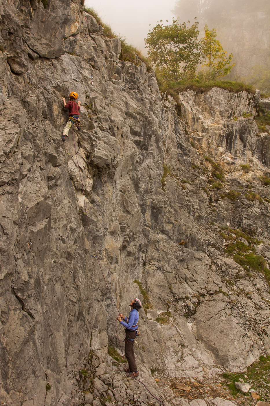 Wir kletterten in diesem Sektor fast alle Routen, bevor wir wieder zurückkehrten. Entgegen den Erwartungen hatte sich der Nebel nicht aufgelöst, sondern wurde noch dichter. Die Frau wollte nicht durchs Dorf absteigen, sondern suchte den Weg auf der Karte. Merke: Nimm keine Karte von 1986, wenn du die Gegend nicht kennst. Mehr will ich dazu nicht sagen…