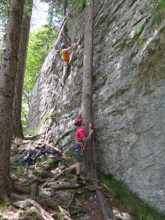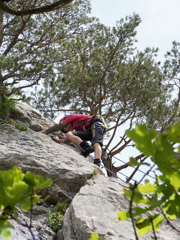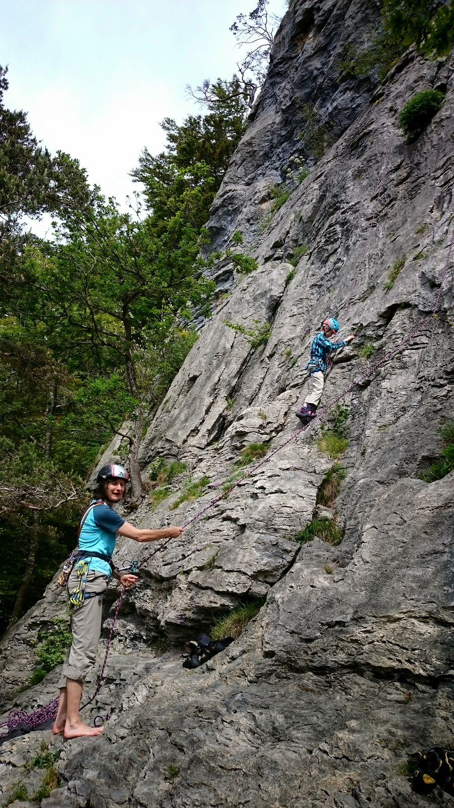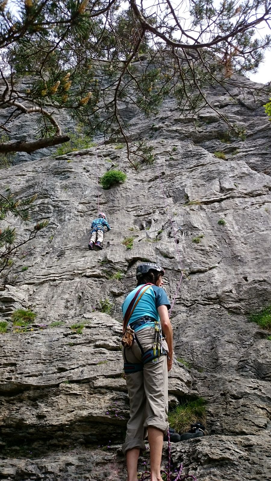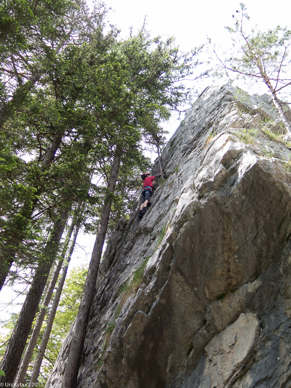 Obwohl hier sehr viel geklettert wird, ist der Fels gut und griffig, nicht abgespeckt, wie man es von den Juraklettergärten her kennt. Die Wand ist zweigeteilt, die untere Hälfte weist einfache Routen um 4 auf, die obere die erwähnten Routen der schärferen Gangart. Zum Einklettern wählen wir eine gut strukturierte Länge. Löcher, Seitgriffe, Aufleger, Leisten, alles wird uns geboten. Es ist ein wahrer Genuss, hier zu klettern! Am gut eingerichteten Stand können wir wieder abseilen. Die Kinder können hier ebenfalls problemlos klettern. Am rechten Rand des Klettergartens zieht sich eine Route hoch bis zuoberst, die Schwierigkeit liegt bei 5a. Die Kletterei ist auch hier sehr abwechslungsreich und schön. Fabian klettert diese ebenfalls bis zur Hälfte im Vorstieg. Was bisher nicht erwähnt wurde: Die Aussicht! Von diesem Felskopf, der aus dem Wald herausragt, hat man eine wunderbare Aussicht auf Meiringen und die Engelhörner. Man hat nun die Wahl, wieder abzuseilen (was nicht empfehlenswert ist, wenn noch andere Leute hier klettern) oder abzusteigen.