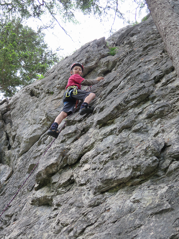 Wir entscheiden uns aber für das Naheliegendste: Den Klettergarten Rotsteini. Dieser liegt zwischen Meiringen und Hasliberg Hohfluh und ist gut zu Fuss in einer halben Stunde erreichbar. Direkt an der Waldstrasse (mit Motorfahrzeugverbot) liegt ein grosser Felsblock. An diesem gibt es mehrere einfache Routen für Anfänger. Das Gelände ist überschaubar und es gibt auf der Strassenseite keine Absturzgefahr, so dass man auch problemlos Kleinkinder mitnehmen kann (aber Vorsicht wegen den Bikern, die hier zahlreich vorbei fahren). Wir entscheiden uns jedoch für den oberen Felsen, der ebenfalls Routen für Anfänger bereithält, aber auch Kletterer anspricht, bei denen erst bei 6c Schluss ist. Das Gelände hier ist nicht mehr kindertauglich, es besteht Absturzgefahr, die mit einem Seilgeländer etwas entschärft wurde.