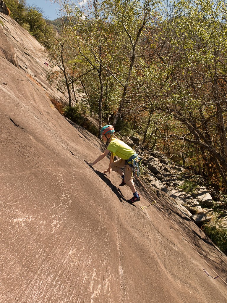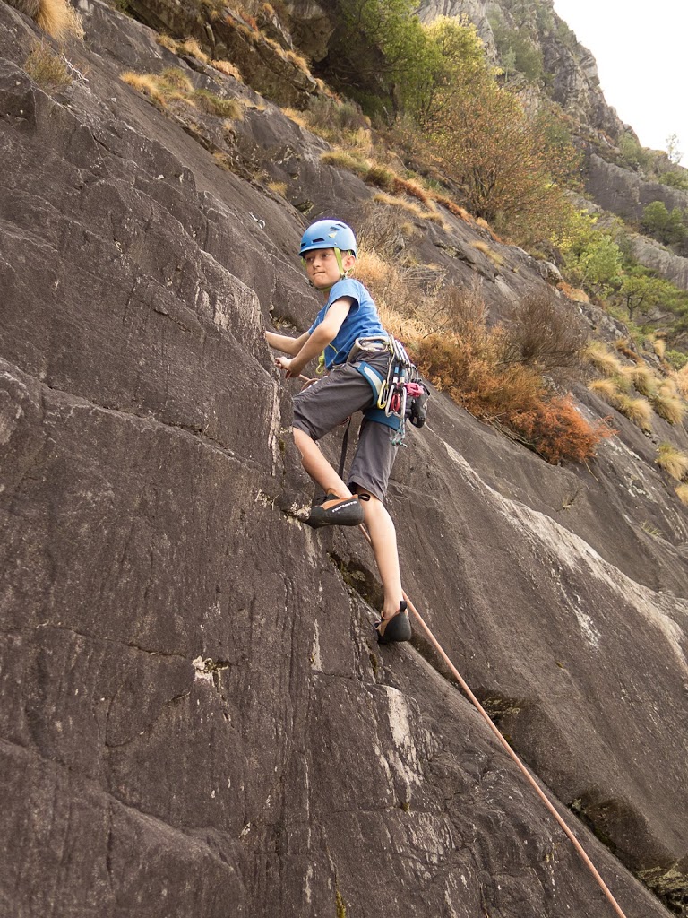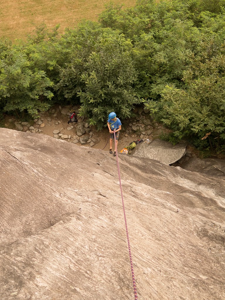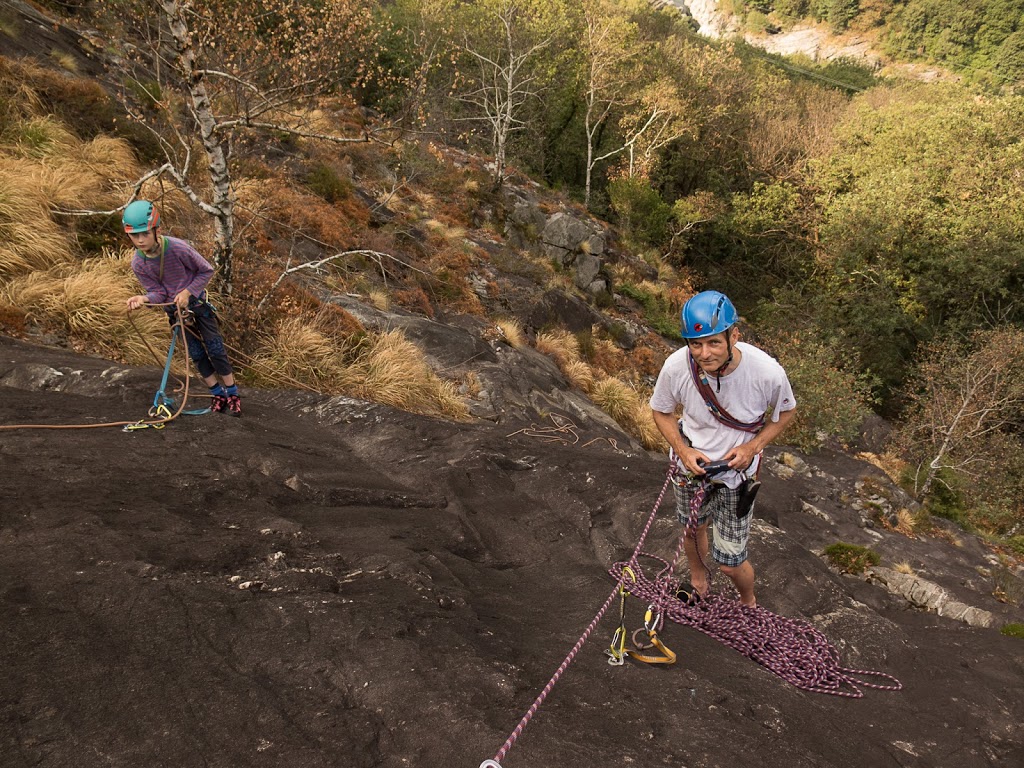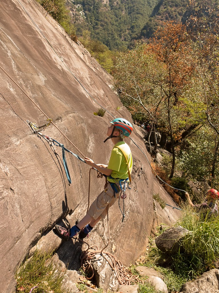Das nächste Klettergebiet, das wir aufsuchen, ist Torbeccio bei Avegno. Wir überqueren eine Hängebrücke und eine Wiese und erreichen so ziemlich bequem die Felsen. Und wir sind alleine. Es gibt auch hier gut abgesicherte Routen für Anfänger. Sofort klettert Fabian los, muss dann allerdings umkehren. Silvan schafft die Route, ich auch. „SILVAN!“ „???“ „Bist du verrückt, eine solche Route zu klettern?“ Rieeeeeesensmile im Gesicht! Wir klettern noch zwei, drei Routen, bevor wir eine Zweiseillängenroute klettern in den bewährten Seilschaften, denn die Kinder wollen abseilen. Dies machen wir denn auch, und das unter erschwerten Bedingungen, kommt doch heftiger Wind auf.
