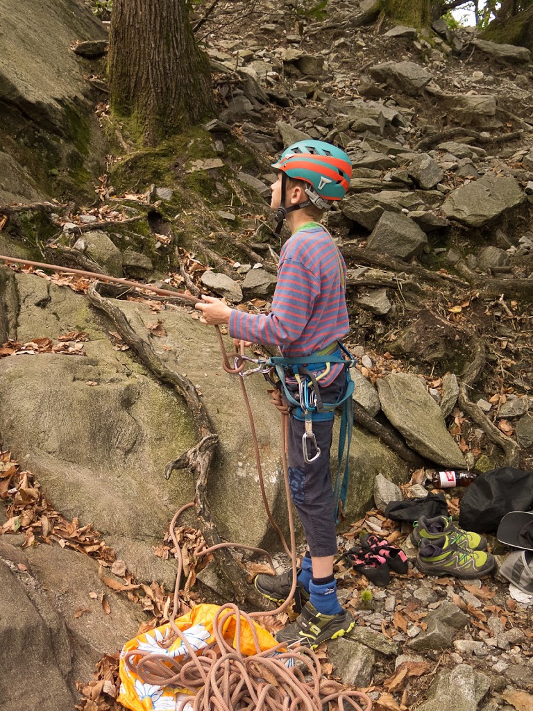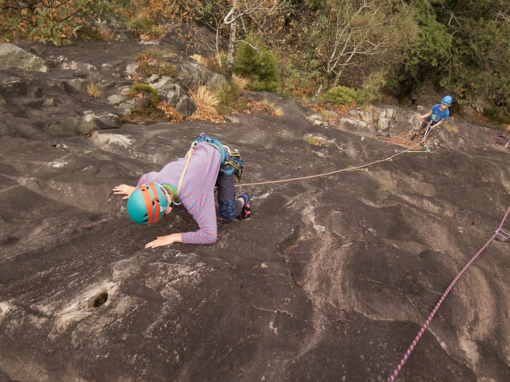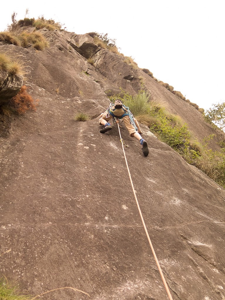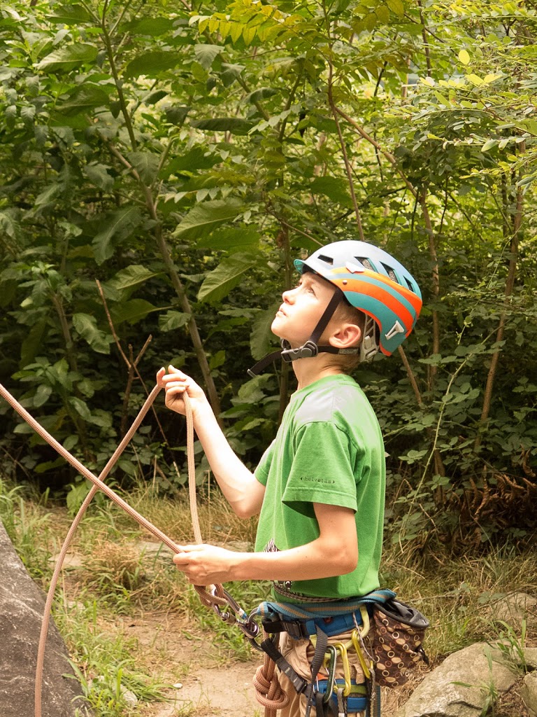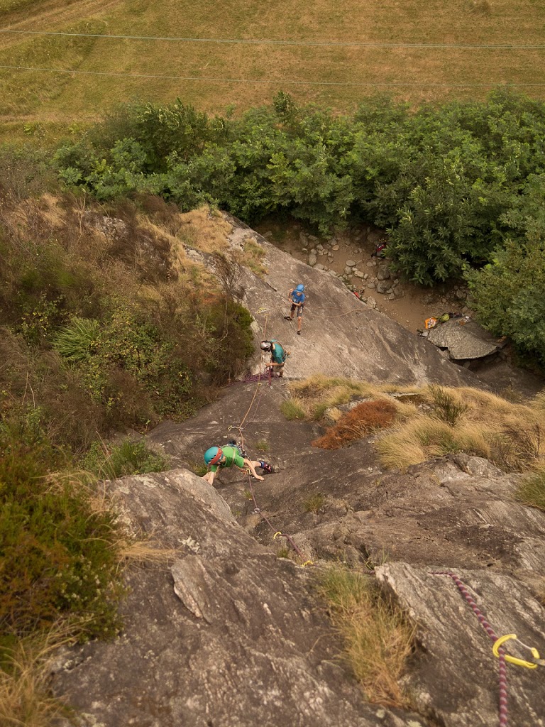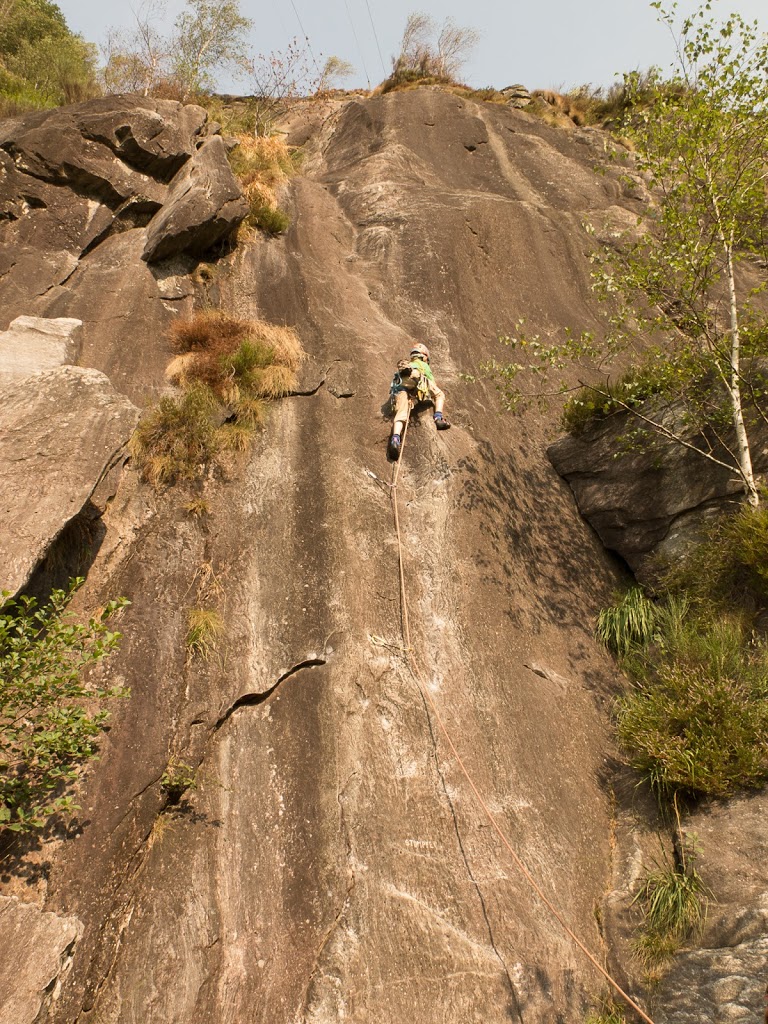 Das nächste Klettergebiet, das wir aufsuchen, ist Torbeccio bei Avegno. Wir überqueren eine Hängebrücke und eine Wiese und erreichen so ziemlich bequem die Felsen. Und wir sind alleine. Es gibt auch hier gut abgesicherte Routen für Anfänger. Sofort klettert Fabian los, muss dann allerdings umkehren. Silvan schafft die Route, ich auch. „SILVAN!“ „???“ „Bist du verrückt, eine solche Route zu klettern?“ Rieeeeeesensmile im Gesicht! Wir klettern noch zwei, drei Routen, bevor wir eine Zweiseillängenroute klettern in den bewährten Seilschaften, denn die Kinder wollen abseilen. Dies machen wir denn auch, und das unter erschwerten Bedingungen, kommt doch heftiger Wind auf.