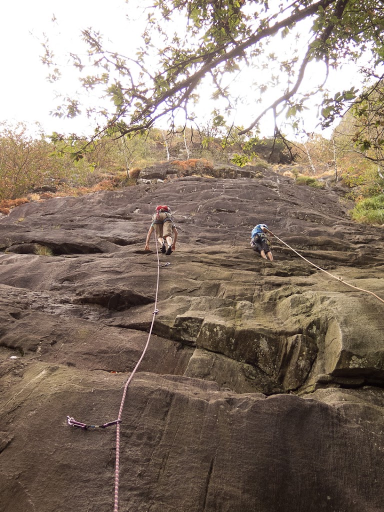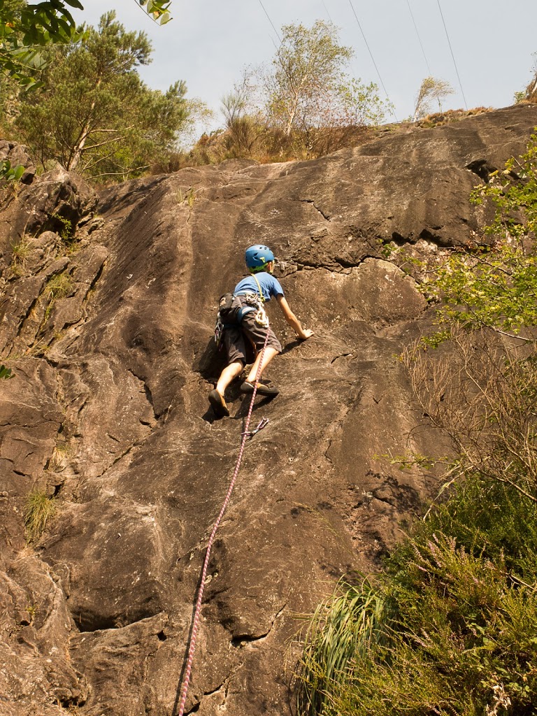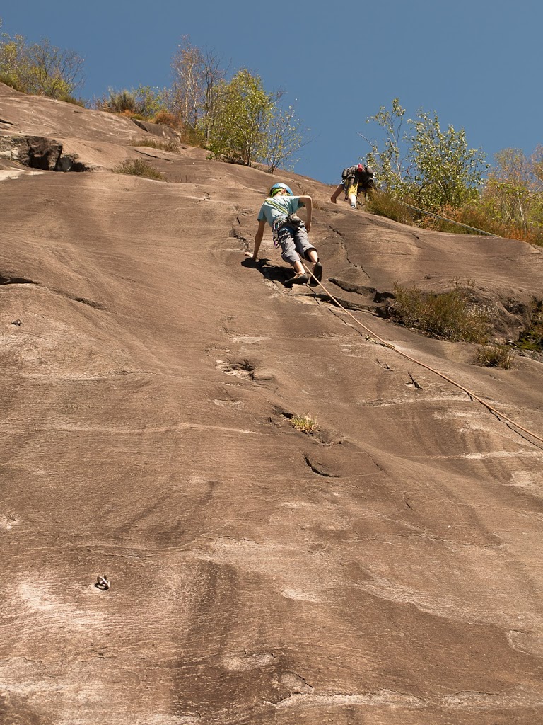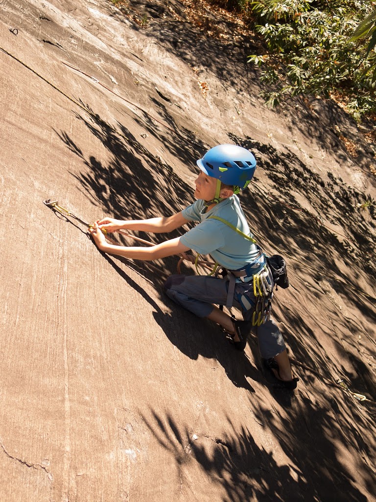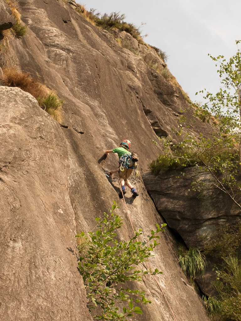 Das nächste Klettergebiet, das wir aufsuchen, ist Torbeccio bei Avegno. Wir überqueren eine Hängebrücke und eine Wiese und erreichen so ziemlich bequem die Felsen. Und wir sind alleine. Es gibt auch hier gut abgesicherte Routen für Anfänger. Sofort klettert Fabian los, muss dann allerdings umkehren. Silvan schafft die Route, ich auch. „SILVAN!“ „???“ „Bist du verrückt, eine solche Route zu klettern?“ Rieeeeeesensmile im Gesicht! Wir klettern noch zwei, drei Routen, bevor wir eine Zweiseillängenroute klettern in den bewährten Seilschaften, denn die Kinder wollen abseilen. Dies machen wir denn auch, und das unter erschwerten Bedingungen, kommt doch heftiger Wind auf.
