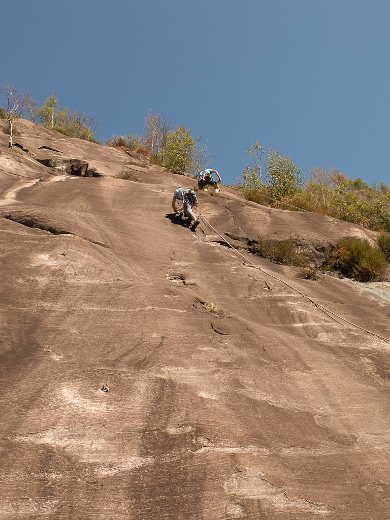 Den letzten Klettertag verbringen wir an der Placca di Maoph bei Ponte Brolla. Der Vorteil ist, dass diese Platten westwärts ausgerichtet sind und somit am Morgen noch im Schatten liegen. Der Nachteil ist, dass man zuerst eine halbe Stunde hochsteigen muss. Nach Bewältigung dieser Anstrengung (es ist auch im Schatten schon wieder heiss) starten wir gleich in den bewährten Seilschaften. Wieder erwarten uns schöne, einfache, gut abgesicherte Platten. Nach vier Seillängen seilen wir wieder ab, um nach einer Pause noch zwei andere Routen zu klettern, diesmal aber bereits an der Sonne. Somit ist der Klettertag nach diesen beiden Routen gelaufen, wir kehren zum Camping zurück und kühlen uns in der Maggia ab.