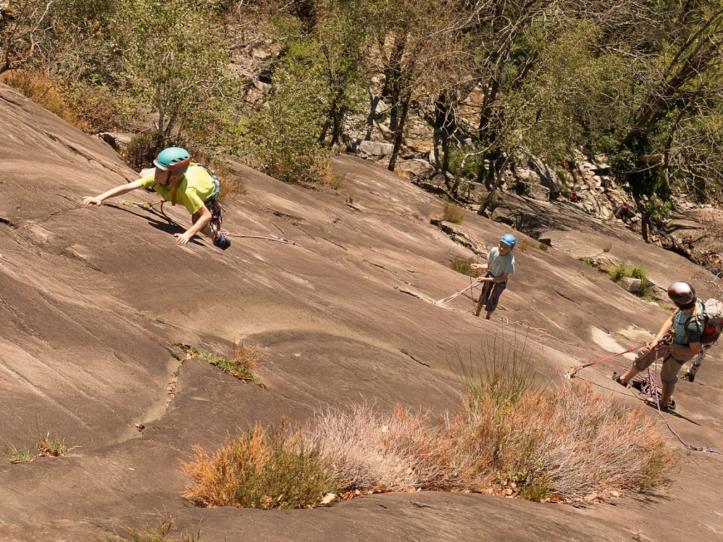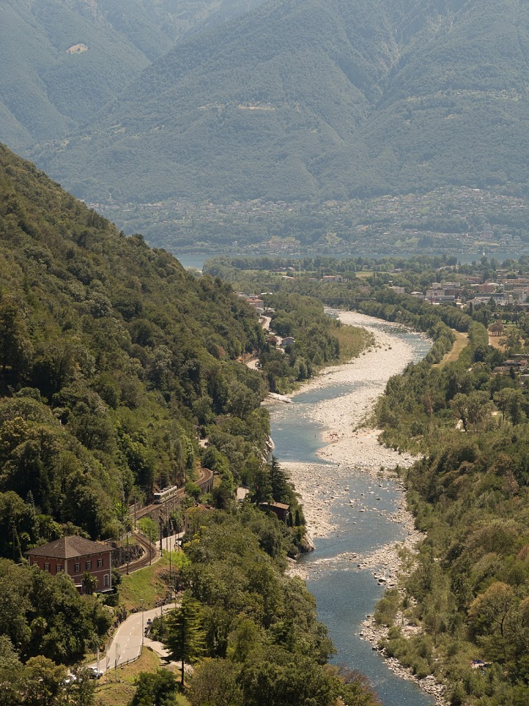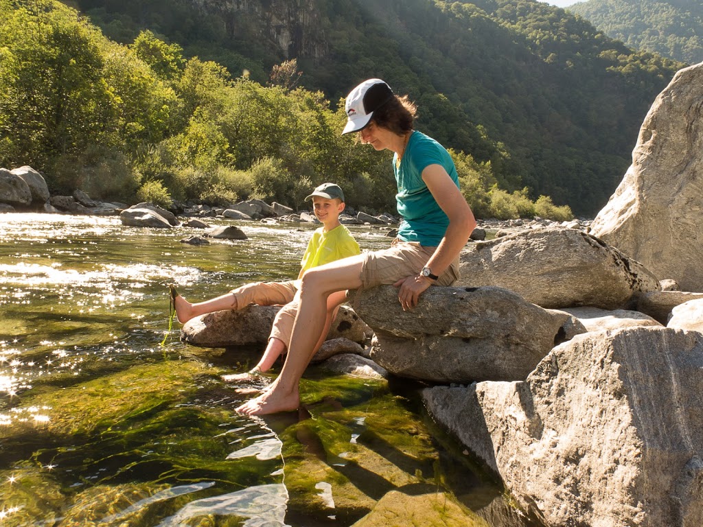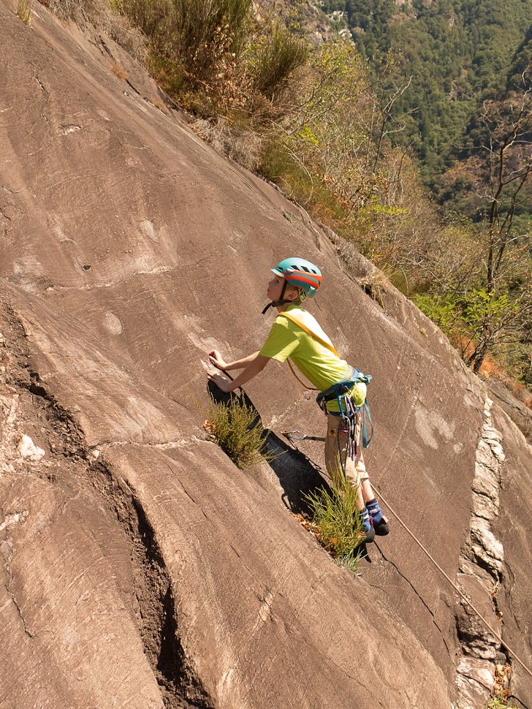 Unser erstes Ziel sind die Platten über Tegna am Eingang zum Onsernonetal. Schöne, einfache und südwärts gerichtete Platten (was wir bei diesen Temperaturen nicht unbedingt gebraucht hätten) erwarten uns. Meiner Intuition folgend, steche ich in den Wald hinein, landen dann allerdings nicht dort, wo ich wollte. Wir kämpfen uns, immerhin im Schatten, durch das Gebüsch, das zu unserem Leidwesen nicht nur aus weichen Büschen bestand, sondern auch aus Brombeersträuchern. Ein Blick in den Führer hätte geholfen. Na ja, Moses irrte ja immerhin sieben Jahre in der Wüste umher, weil er nicht nach dem Weg fragte. Wir finden dann unser Gebiet doch noch, aber es ist HEISS! Zum Glück haben genügend Tranksame dabei. Zum Einklettern und sich an den Fels gewöhnen macht jeder von uns eine Einseillängenroute. Dann fühlen wir uns bereit, eine längere Route in Angriff zu nehmen. Meine Frau und ich bilden eine Seilschaft, die Kinder die andere, wir klettern die Route „Rosso“, die Kinder „Orientale“. Sie liegen nebeneinander, so dass wir jederzeit den Kindern helfen können. Wir starten, der Fels ist heiss. Zum Glück geht ein kühlender Wind. Mit jedem Meter wird die Aussicht besser, wir sehen bis zum Lago Maggiore. Wir kommen flott voran, obwohl Silvan zwischendurch eine Krise hat. Mit beruhigenden Worten und helfen können wir diese aber beenden, so dass wir bald am Ausstieg sind. Geschafft! Bin ich froh, kann ich endlich aus den Kletterschuhen raus! Nun müssen wir wieder hinunter. Wir folgen einem Pfad weiter hoch und nehmen an, dass dieser dann weiter nach rechts führt und dort nach unten. Irgendwann müssen wir uns aber eingestehen, dass dies der falsche Weg ist. Also alles wieder zurück. Klaglos machen die Kinder mit, ich staune. Dann stehen wir wieder am Ausstieg, nehmen diesmal den anderen Pfad, der uns diesmal nach unten führt. Gleichzeitig mit der anderen Seilschaft, die mit uns kletterte, kommen wir unten an, sie haben allerdings abgeseilt. Wir räumen zusammen, es ist einfach zu heiss zum Klettern, und kehren zum Zeltplatz zurück, wo wir in der daneben fliessenden Maggia unsere Füsse kühlen.