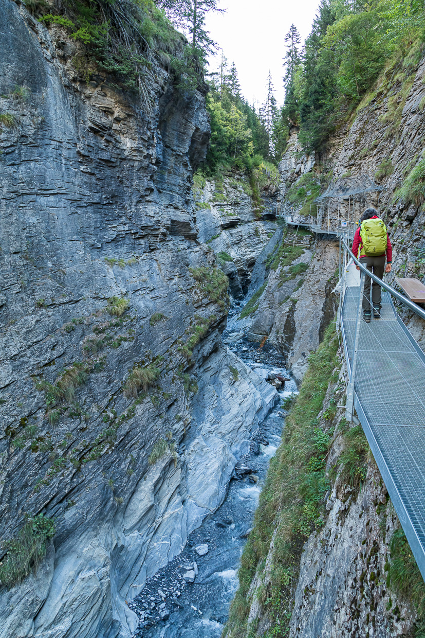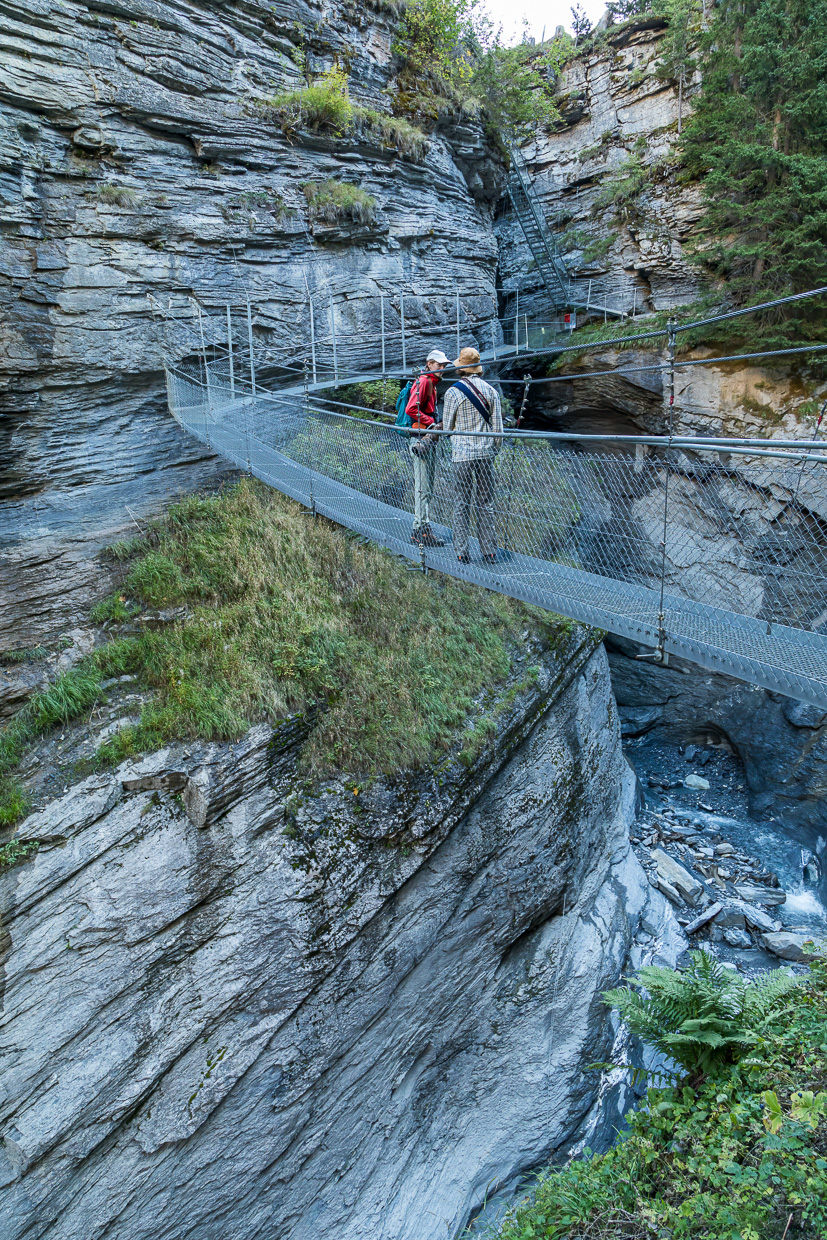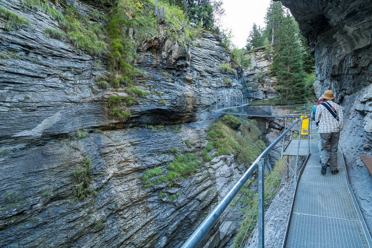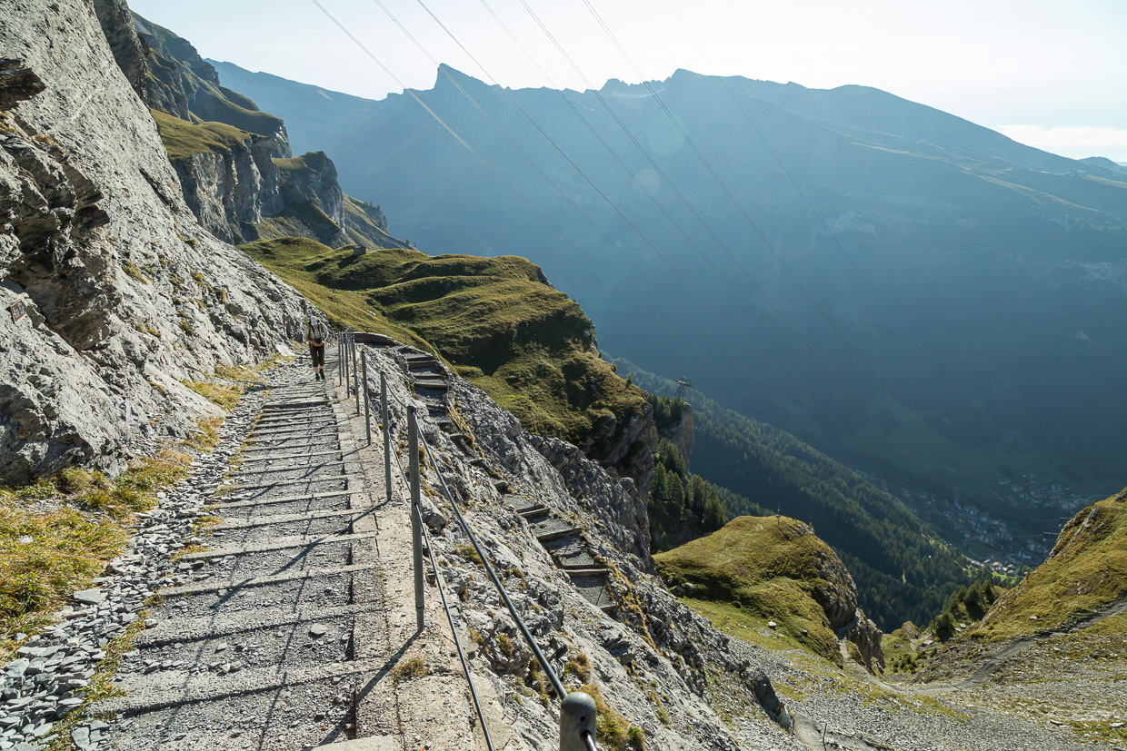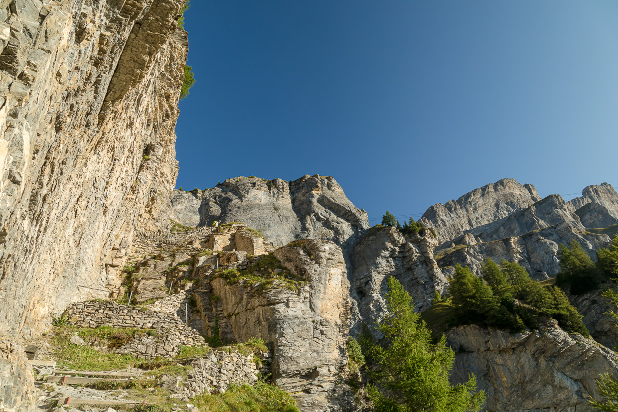 Diese Wanderung startet mitten im Dorf. Zuerst auf einem gemütlichen Wanderweg entlang, betritt man nach ungefähr einem Kilometer die gut ausgebaute Dala-Schlucht. Wer aber nicht schwindelfrei ist und wem schwankende Hängebrücken, gebaut aus Gitterrosten, nicht so sein Ding ist, sollte vielleicht den anderen Weg wählen. Spektakulär ist sie allemal, besonders die schwankende Treppe, die auch bei uns erfahrenen Bergsteigern ein mulmiges Gefühl auslöste. Der Weg nach der Schlucht ist dann wieder ein normaler, bietet aber schöne Aussichten aufs Daubenhorn und die Gemmi. Ebenso imposant sind die Wände der Plattenhörner.