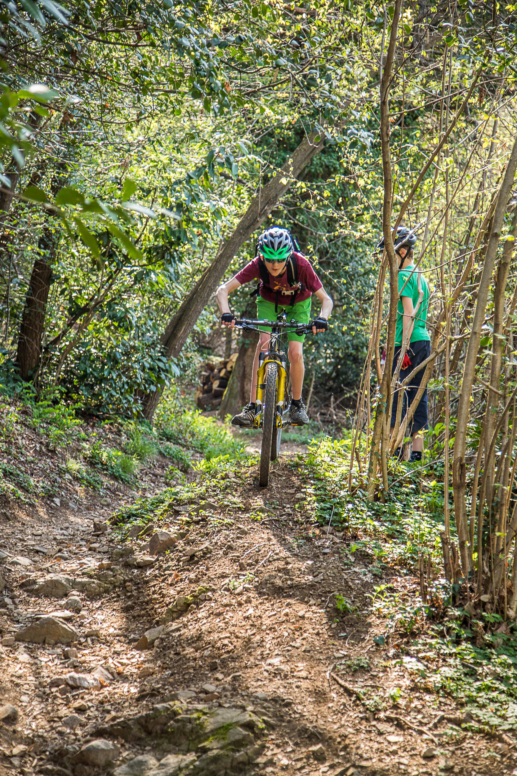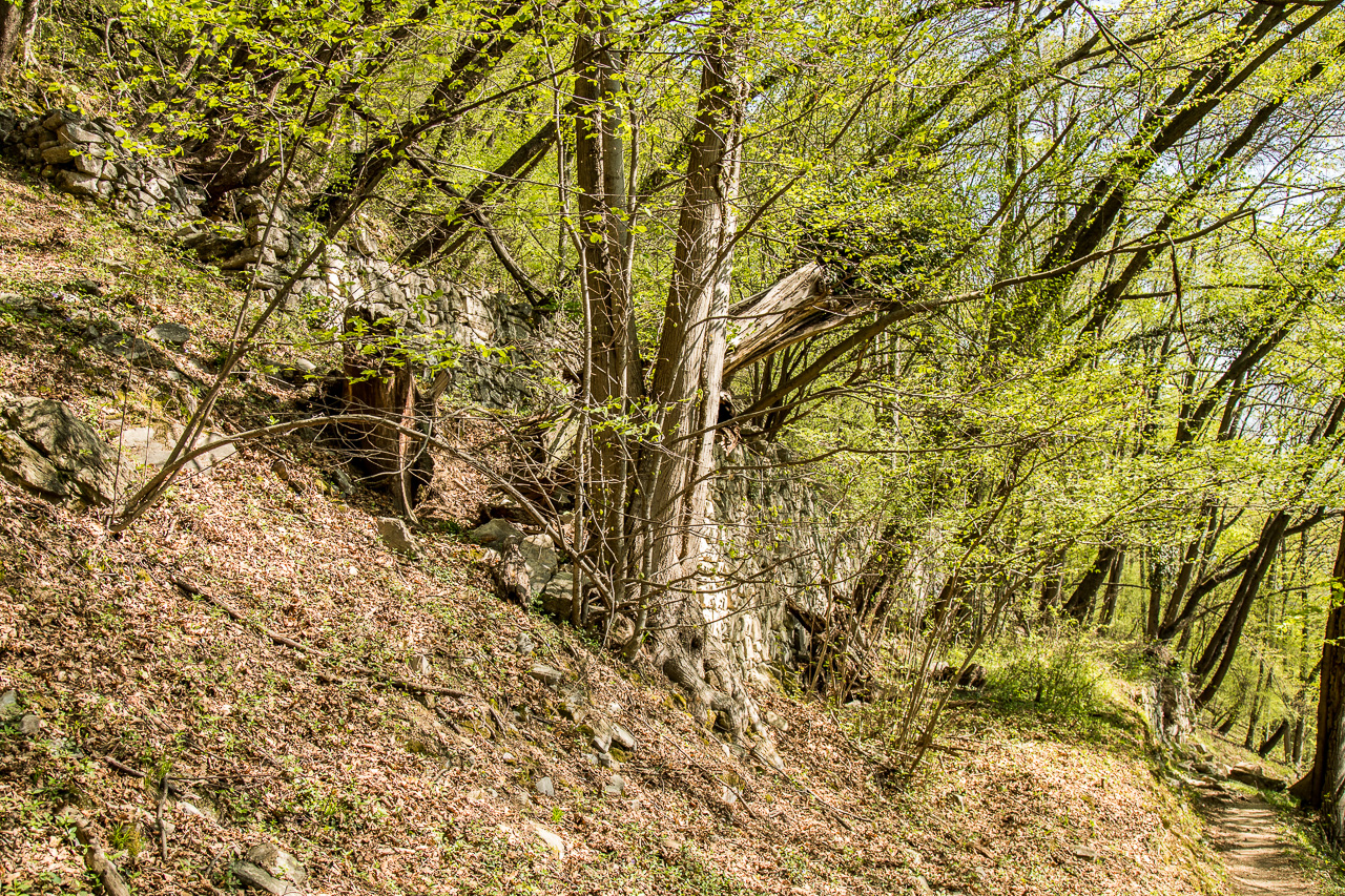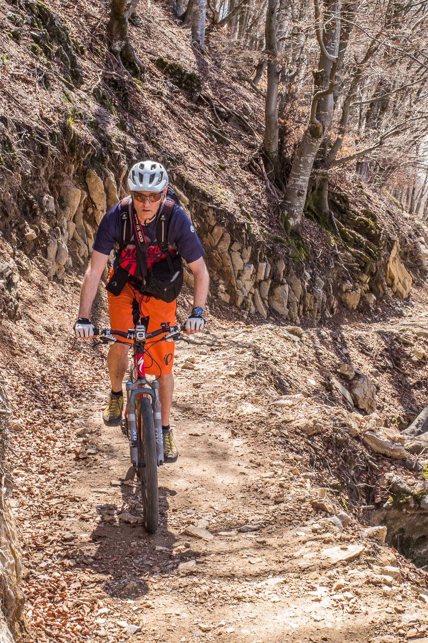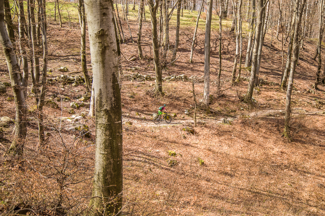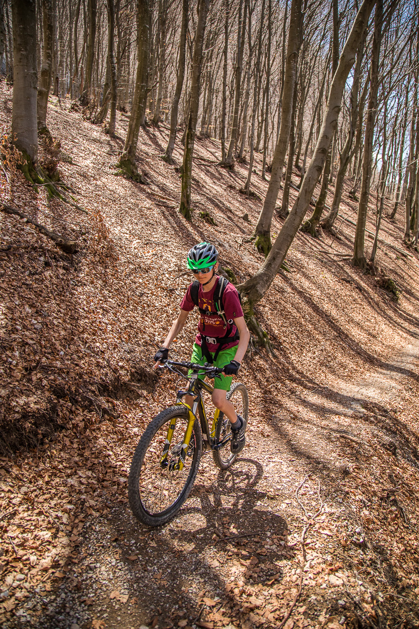 Gestartet sind wir natürlich vor der Haustüre und nutzten den famosen Radweg nach Lugaggia, um die Route 357 zu erreichen. Auf dieser fuhren wir durch den Wald und erreichten bald den Torre di Redde, den wir schon auf der ersten Wanderung (siehe oben) besuchten. Nun würde die Tour weiter hoch führen und auf der anderen Seite auf Waldstrassen abwärts. Aber auf der Wanderung fand Fabian bekanntlich sofort gefallen am Weg direkt nach Origlio, allerdings in die andere Richtung und auf dem Bike, so dass wir nun nicht mehr daran vorbei fahren konnten. Also, Sattel runter und los! Der Trail war wirklich cool. Inzwischen war der Wald einiges grüner geworden, die Wärme der letzten Tage war auch für die Vegetation spürbar.
