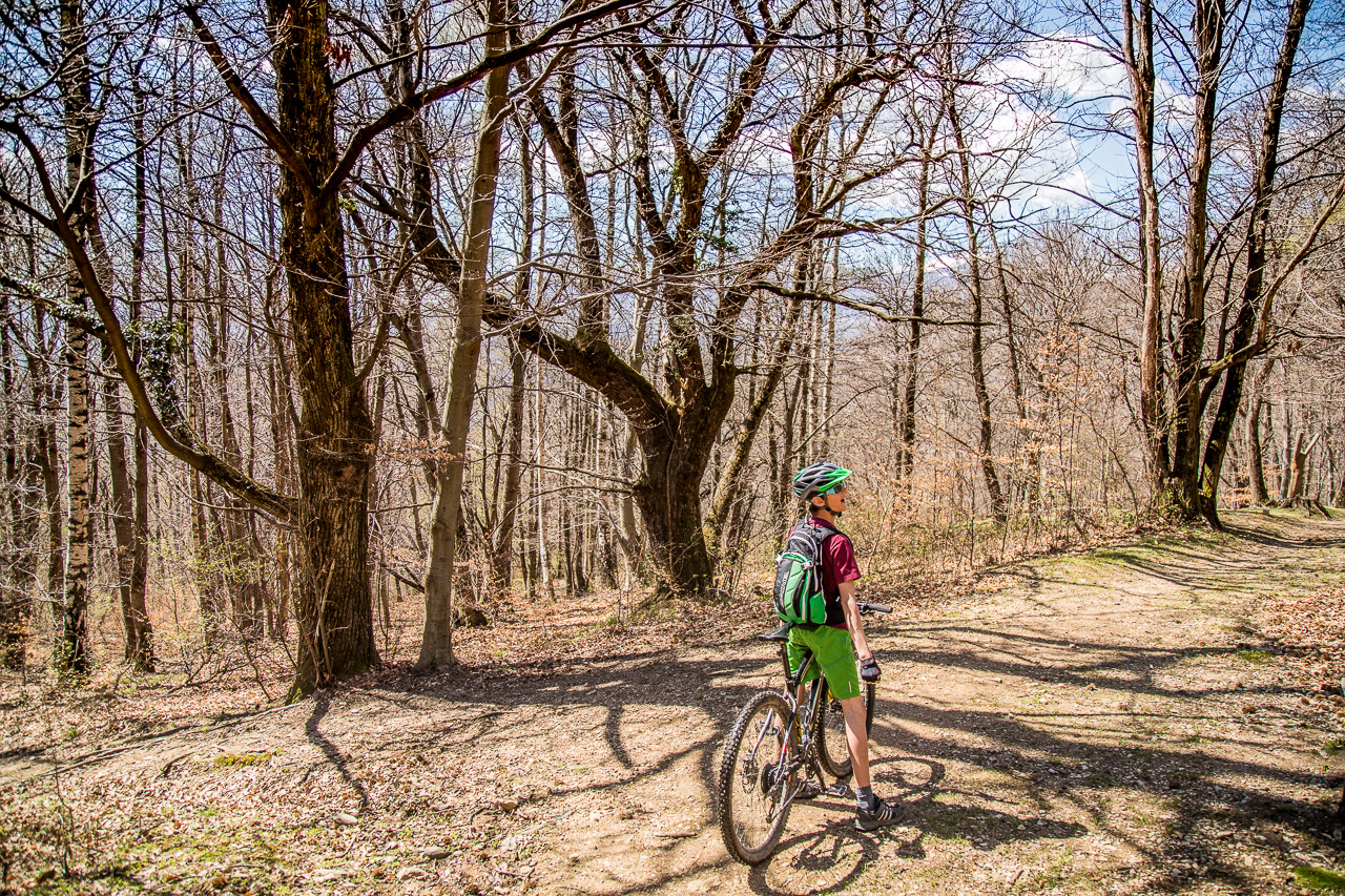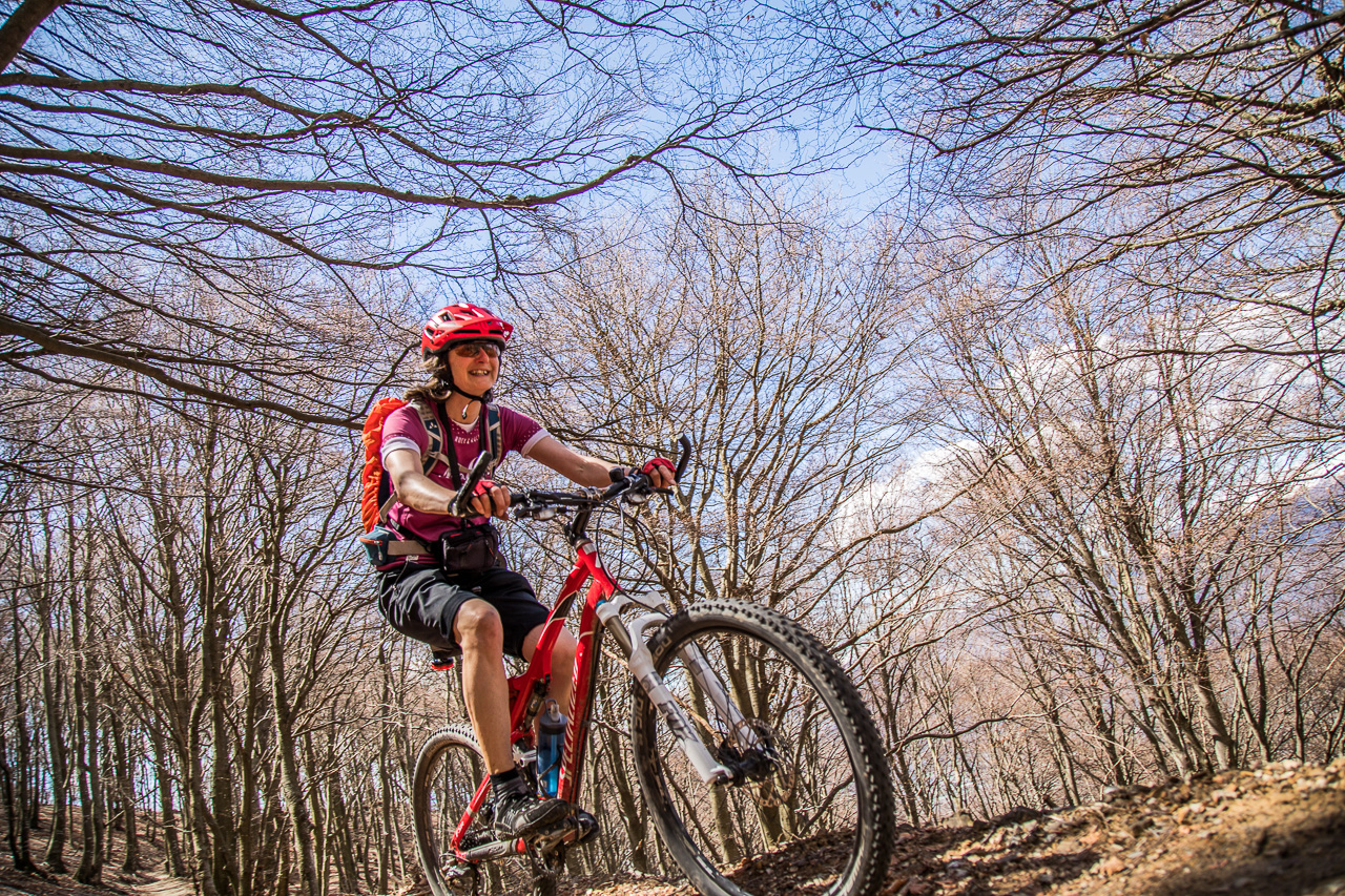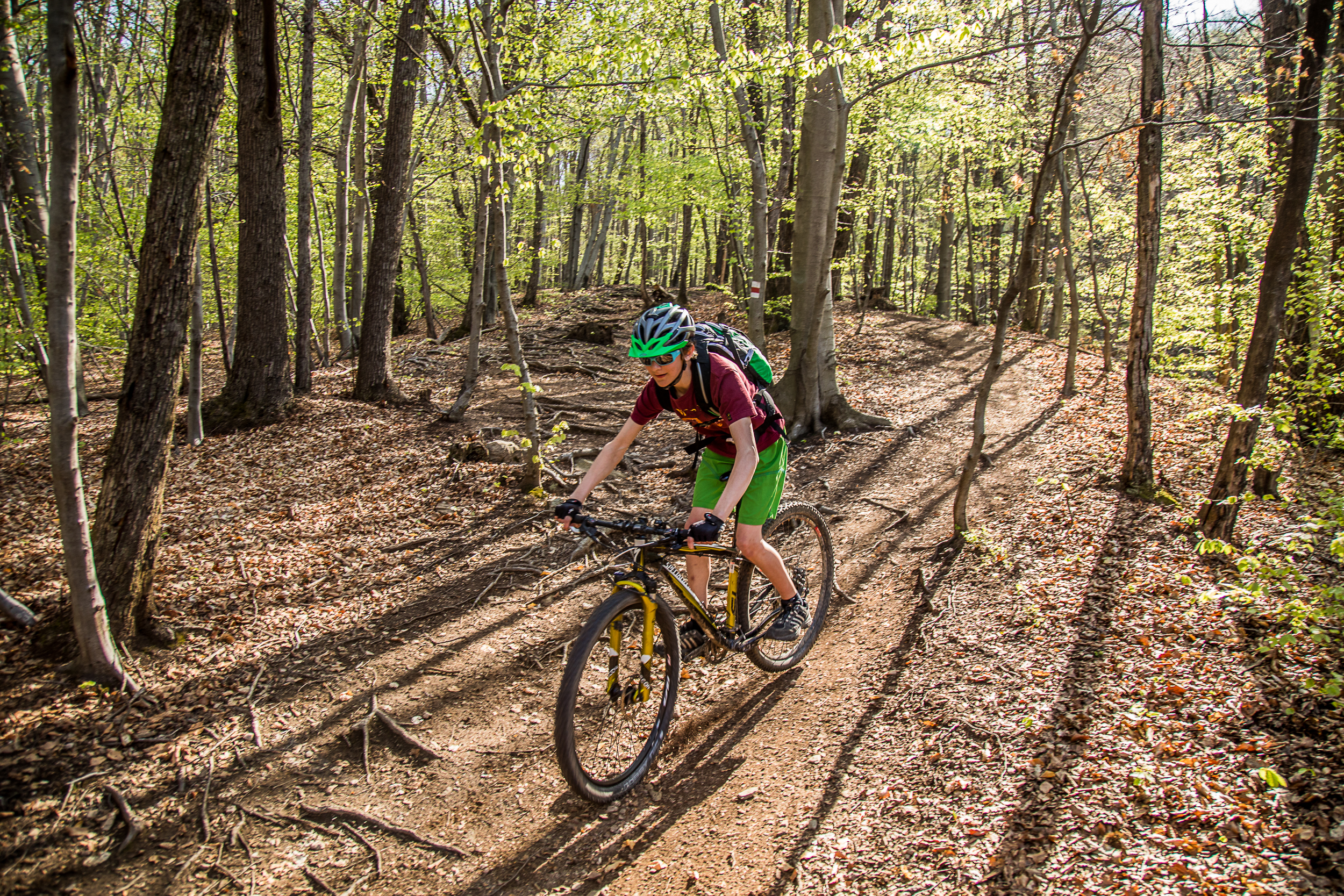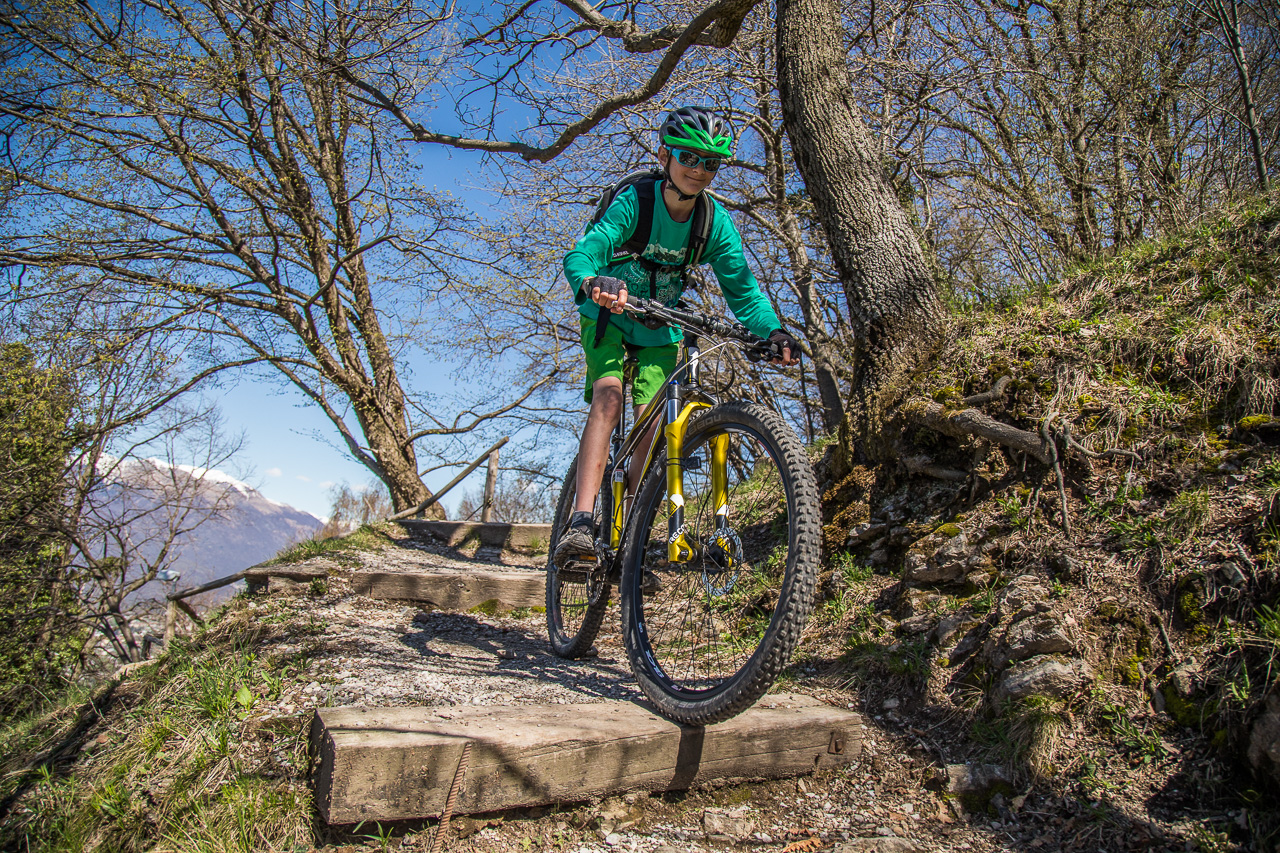 Gestartet sind wir natürlich vor der Haustüre und nutzten den famosen Radweg nach Lugaggia, um die Route 357 zu erreichen. Auf dieser fuhren wir durch den Wald und erreichten bald den Torre di Redde, den wir schon auf der ersten Wanderung (siehe oben) besuchten. Nun würde die Tour weiter hoch führen und auf der anderen Seite auf Waldstrassen abwärts. Aber auf der Wanderung fand Fabian bekanntlich sofort gefallen am Weg direkt nach Origlio, allerdings in die andere Richtung und auf dem Bike, so dass wir nun nicht mehr daran vorbei fahren konnten. Also, Sattel runter und los! Der Trail war wirklich cool. Inzwischen war der Wald einiges grüner geworden, die Wärme der letzten Tage war auch für die Vegetation spürbar.