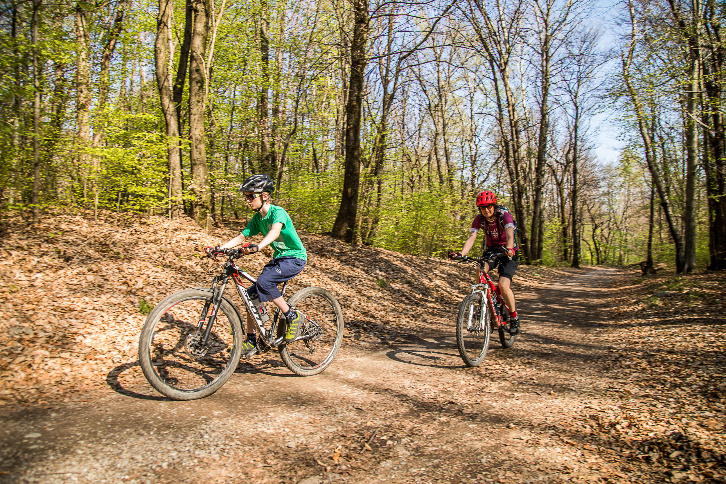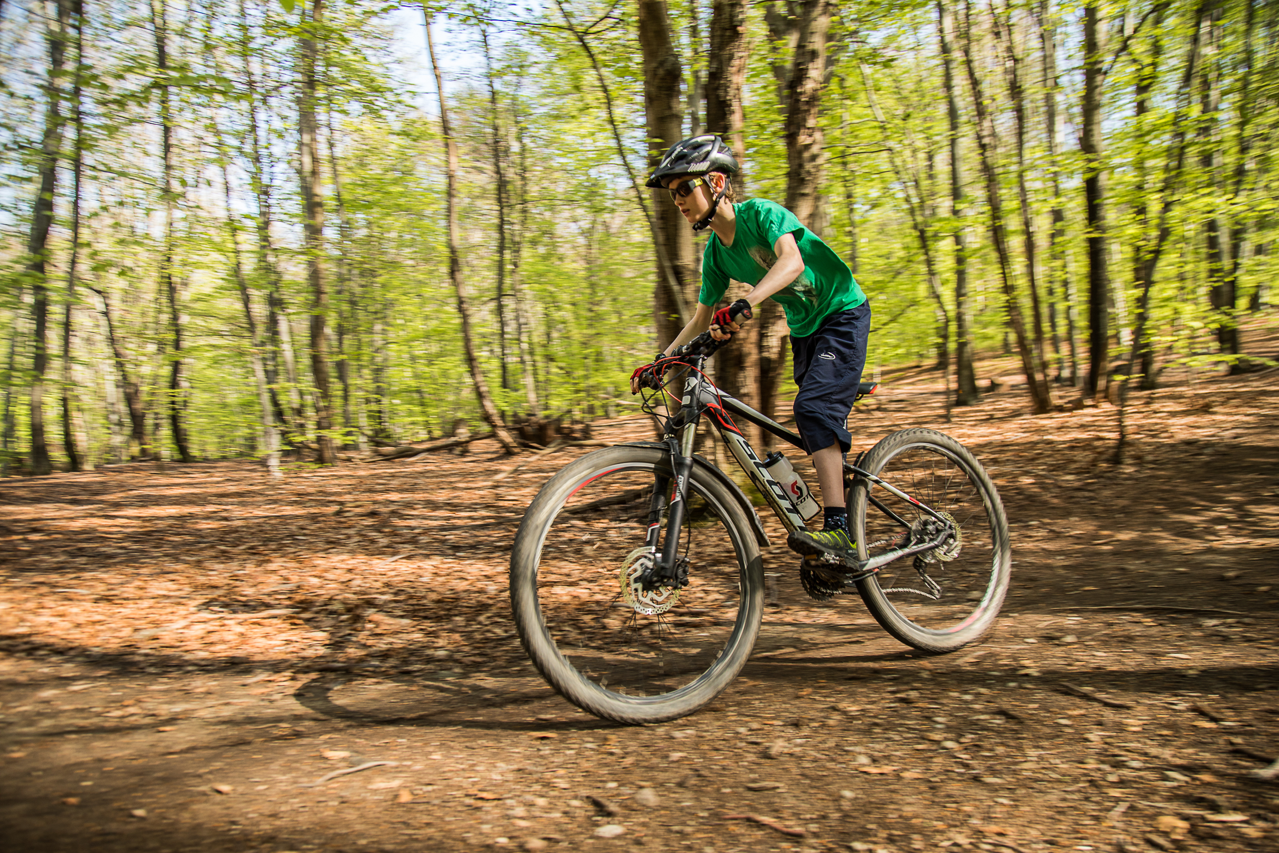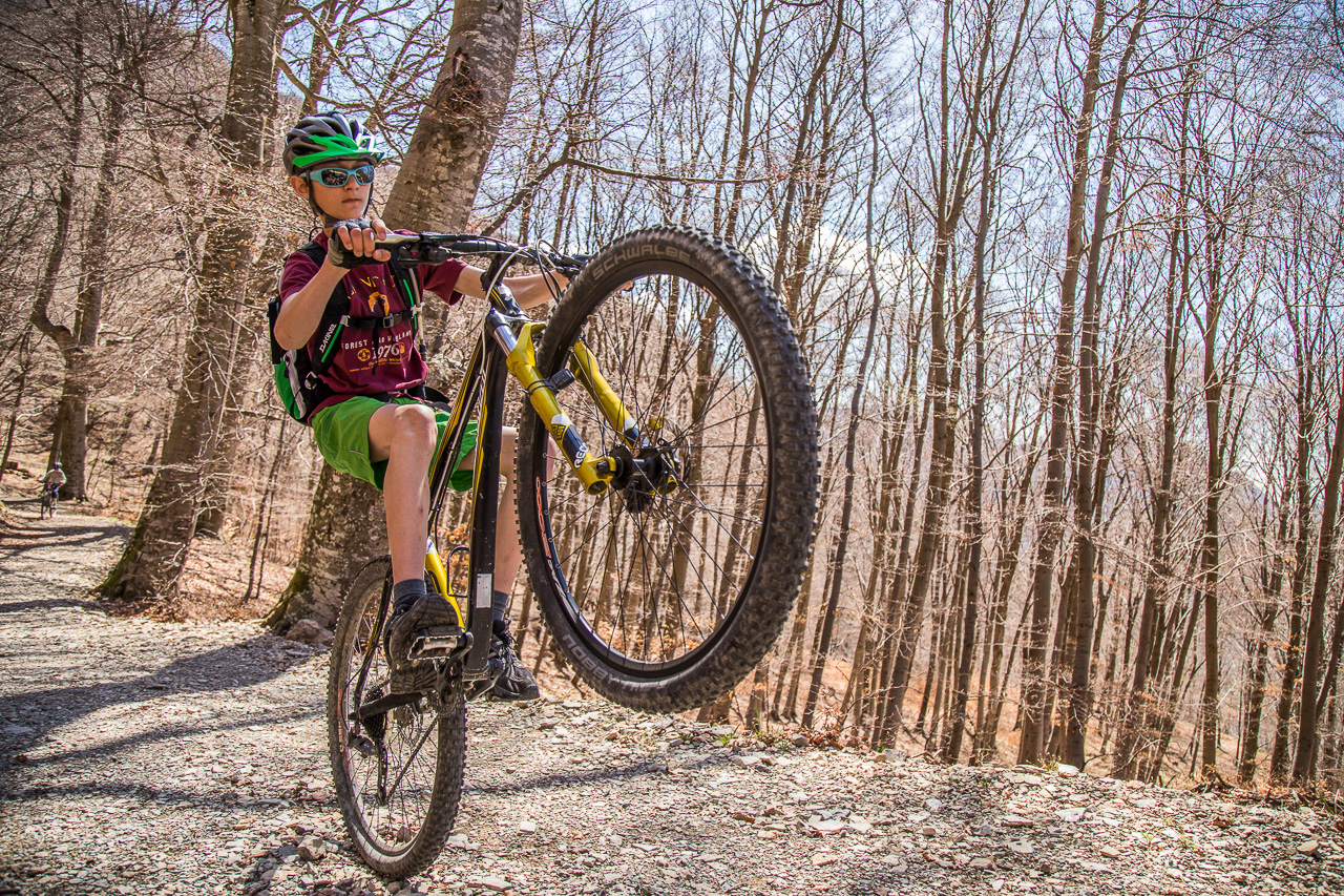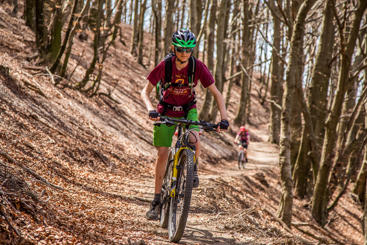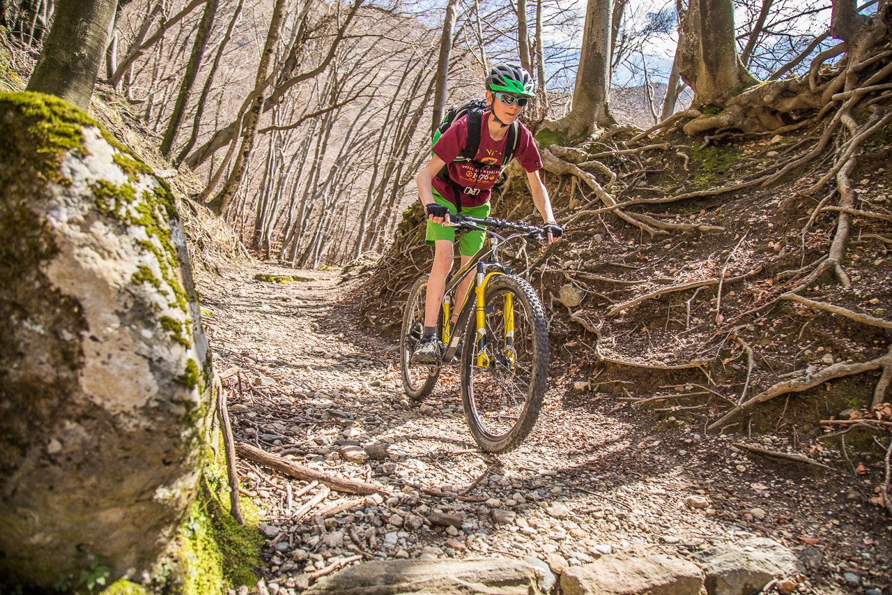 Gestartet sind wir natürlich vor der Haustüre und nutzten den famosen Radweg nach Lugaggia, um die Route 357 zu erreichen. Auf dieser fuhren wir durch den Wald und erreichten bald den Torre di Redde, den wir schon auf der ersten Wanderung (siehe oben) besuchten. Nun würde die Tour weiter hoch führen und auf der anderen Seite auf Waldstrassen abwärts. Aber auf der Wanderung fand Fabian bekanntlich sofort gefallen am Weg direkt nach Origlio, allerdings in die andere Richtung und auf dem Bike, so dass wir nun nicht mehr daran vorbei fahren konnten. Also, Sattel runter und los! Der Trail war wirklich cool. Inzwischen war der Wald einiges grüner geworden, die Wärme der letzten Tage war auch für die Vegetation spürbar.