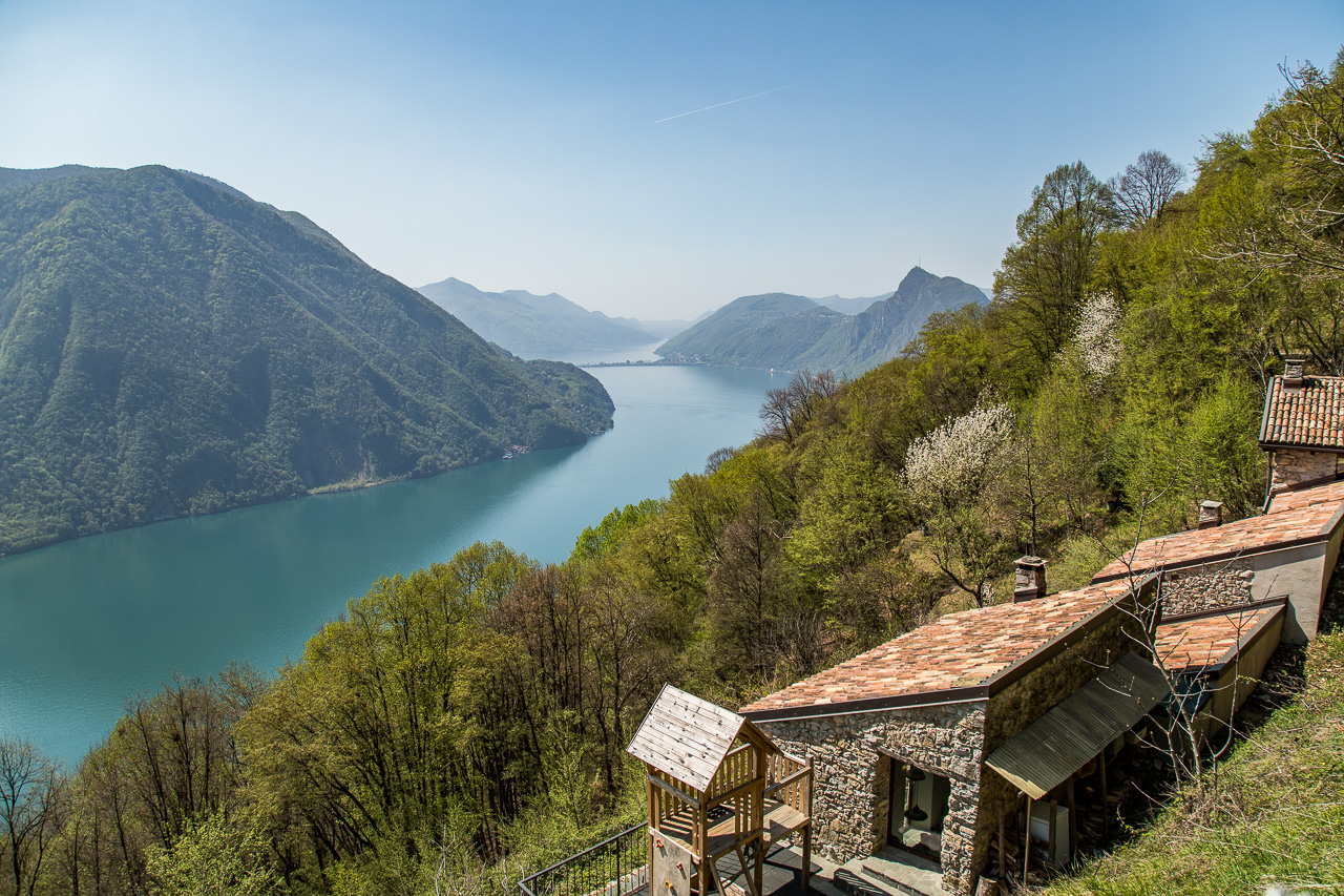 Unsere Ferienwohnung lag im Feriendorf Sureggio, ungefähr fünf Kilometer nördlich von Lugano. Wir haben sie über die REKA gemietet. Direkt vor dem Haus liegt die Bushaltestelle, sehr praktisch für Ausflüge und das Auto kann im Unterstand bleiben. Die Aussicht von unserer Wohnung war toll, gleich gegenüber erblickten wir die Denti della Vecchia, ein Felsmassiv mit langer Klettertradition. Südwärts blickte man auf Lugano mit dem See und den Monte San Salvatore. Etwas oberhalb erreicht man den Veloweg Canobbio – Tesserete, der auf dem ehemaligen Gleisbett der Lugano-Tesserete-Bahn verläuft, deren Betrieb 1967 eingestellt wurde. Einkaufsmöglichkeiten gibt es keine in Sureggio, aber mit dem Rad ist man auf dem schönen Weg im Nu in Tesserete, wo man alles für den täglichen Gebrauch findet.