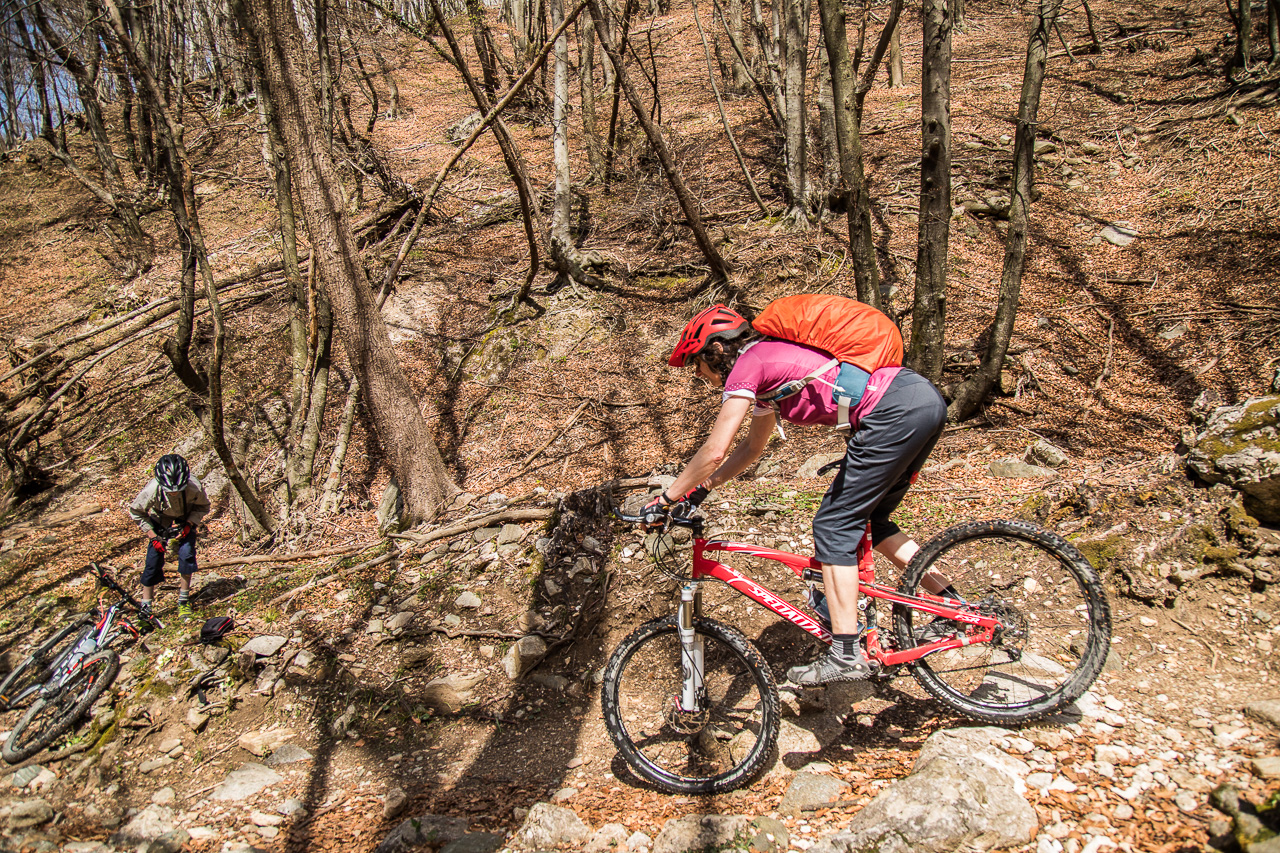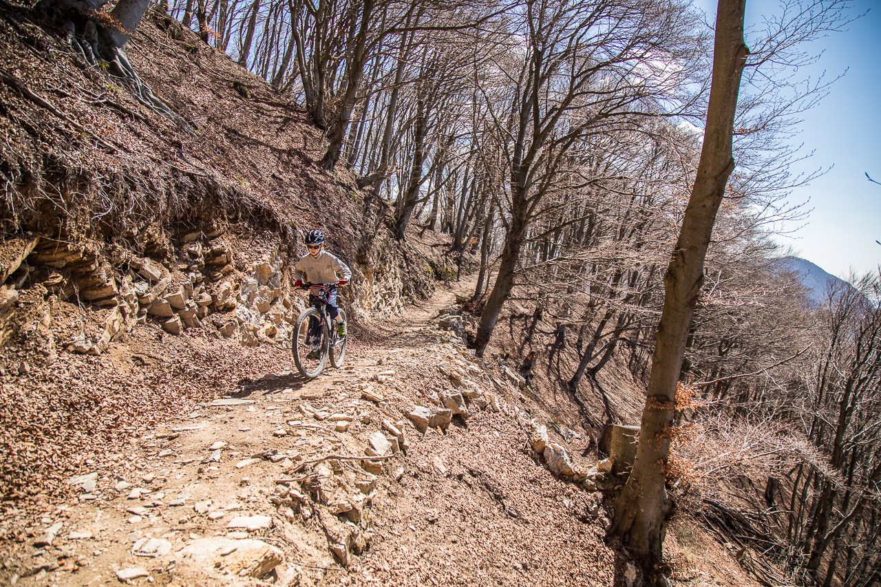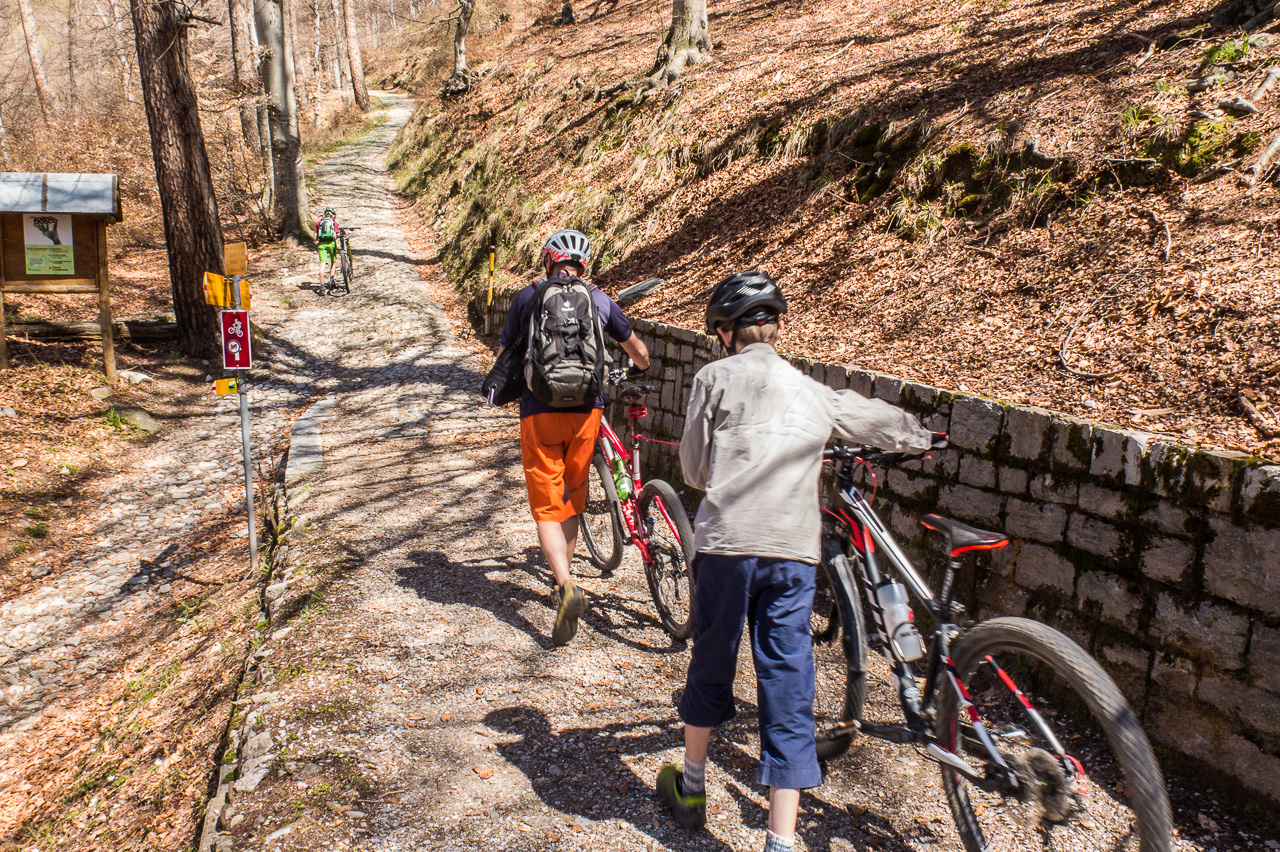 Dann wurde es aber ernst, der Weg stieg nun an, zuerst auf Asphalt, dann auf Waldstrassen. Wir befanden uns auf der ersten Etappe der Lugano Bike, der wir mehrheitlich folgten. Bald wurde der Weg so steil, dass wir schieben mussten. Ich band das Bike von Silvan und meines zusammen, um ihm zu helfen, schliesslich humpelte er immer noch nach seinem Skiunfall und muss sein Bein erst wieder aufbauen. Die Schiebe- und Radelstrecken wechselten sich ab, bei 1130 Meter erreichten wir aber den Kulminationspunkt. Hier startete ein langer Singletrail zur Alpe Bolla. Und was für einer! Viel zu schnell langten wir dort an. Leider hatte die Osteria noch nicht geöffnet, wie so viele im April.